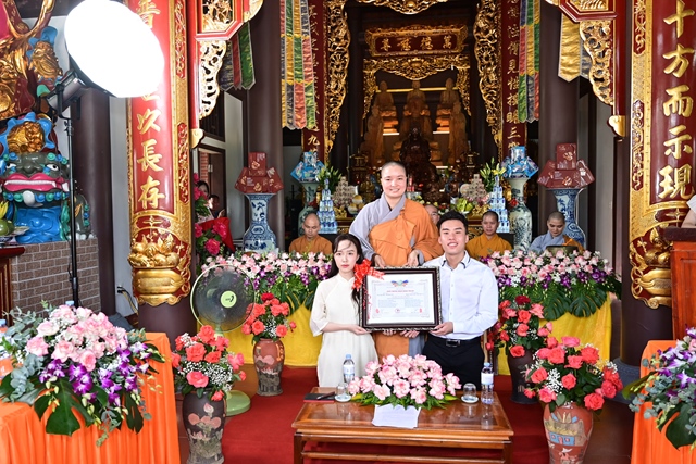 Trong niềm hoan hỷ của toàn thể đại chúng, Sư cô Thích Diệu Ngọc – Trụ trì chùa Lại Sơn, trưởng Ban tổ chức buổi lễ đã trao “ Giấy chứng nhận lễ Hằng Thuận” cho đôi bạn trẻ, cùng với đó là món quà chúc phúc đầy ý nghĩa nhân sự kiện trọng đại này, chúc cho đôi bạn trẻ sống yêu thương nhau cho đến hết cuộc đời.