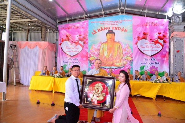 Thay mặt cho Ban tổ chức lễ hằng thuận, Ni Sư Thích Tâm Chính đã trao giấy chứng nhận lễ Hằng Thuận của chùa Đồng Tải cho đôi bạn trẻ, cùng với đó là những món quà rất ý nghĩa của Ni Sư và Sư thầy trụ trì Thích Diệu Hướng chúc phúc cho đôi tân lang, tân nương được “ Trăm năm tình viên mãn, bạc đầu nghĩa phu thê”.