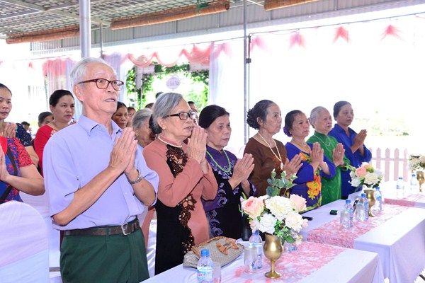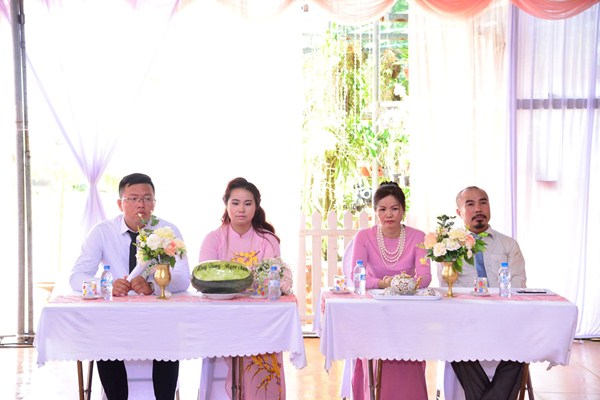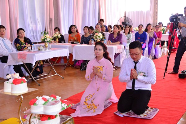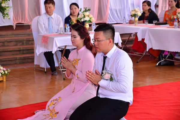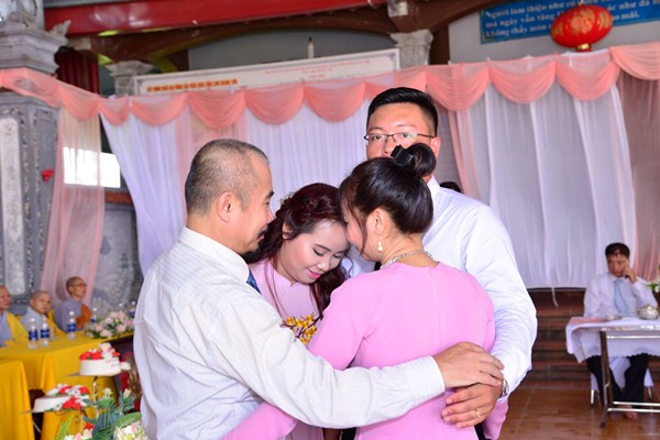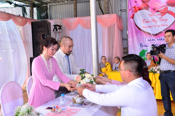 Dưới sự gia hộ của mười phương Chư Phật và sự chứng minh của Chư tôn đức Ni hiện tiền, đôi bạn trẻ đã làm lễ tạ ơn Tam Bảo, lễ tri ân công sinh thành dưỡng dục của hai đấng song thân thông qua nghi thức rót trà mời cha mẹ. Cha mẹ của đôi tân lang và tân nương đã không khỏi xúc động khi chứng kiến sự trưởng thành của các con trong ngày lễ trọng đại này.