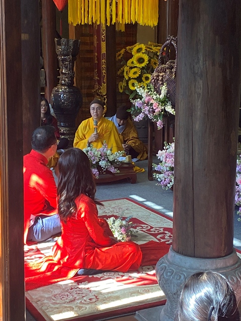 Tại buổi lễ, đôi tân lang và tân nương đã được nghe Đại đức Thích Giác Hiệu giảng về đạo lý vợ chồng trong kinh Thiện Sinh, kinh Phúc Đức mà đức Phật đã dạy. Đại đức đã căn dặn đôi bạn trẻ phải sống sao cho thật tốt, đúng với bổn phận của người làm vợ và người làm chồng, bổn phận của người con trong gia đình, bên nội cũng như bên ngoại. Người chồng phải hết mực yêu thương vợ và người vợ cũng phải rất mực yêu thương chồng, cho dù trong bất kỳ hoàn cảnh nào hay bất kỳ lý do gì thì vợ chồng cũng phải luôn sát cánh bên nhau, cùng nhau xây dựng mái ấm hạnh phúc gia đình.