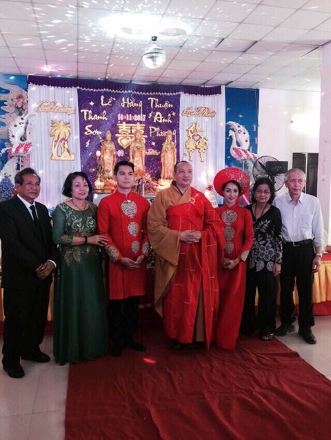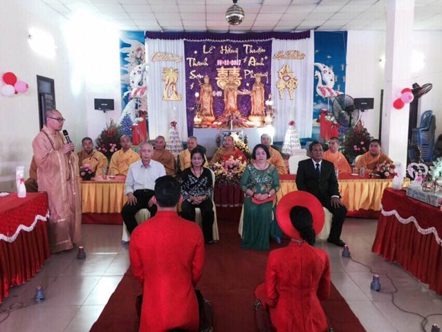 Trước khi kết thúc buổi lễ, Chư tôn đức Tăng ni, đôi tân lang, tân nương, gia đình nội ngoại 2 bên cùng toàn thể đại chúng đã cử hành nghi lễ niêm hương bạch Phật, tụng kinh cầu nguyện cho đôi bạn trẻ luôn được sống trong ánh hào quang của mười phương chư Phật, sống một cuộc sống an lạc và hạnh phúc.
