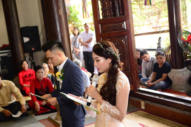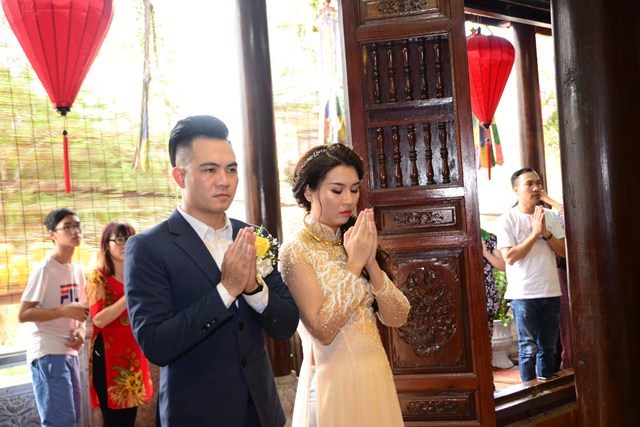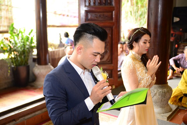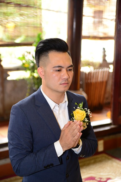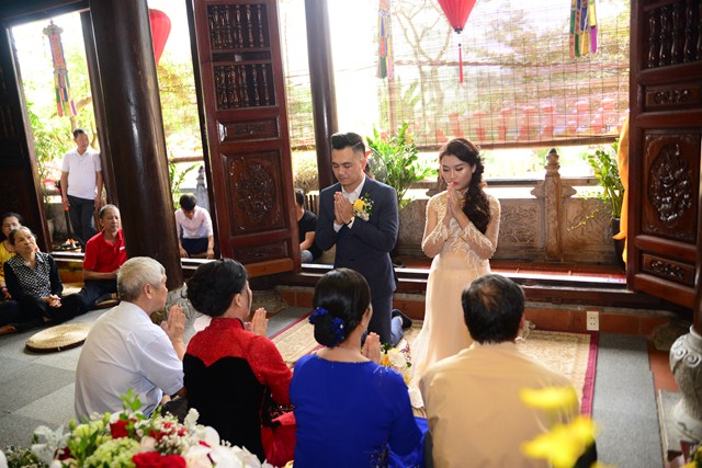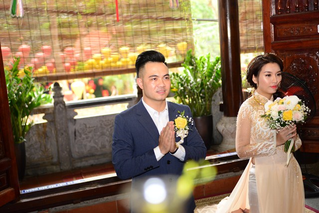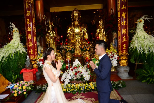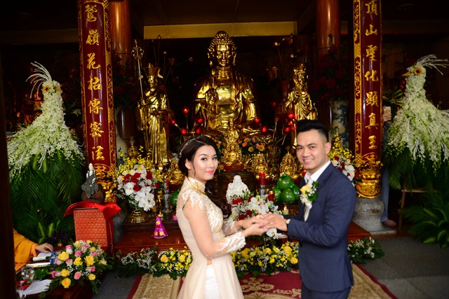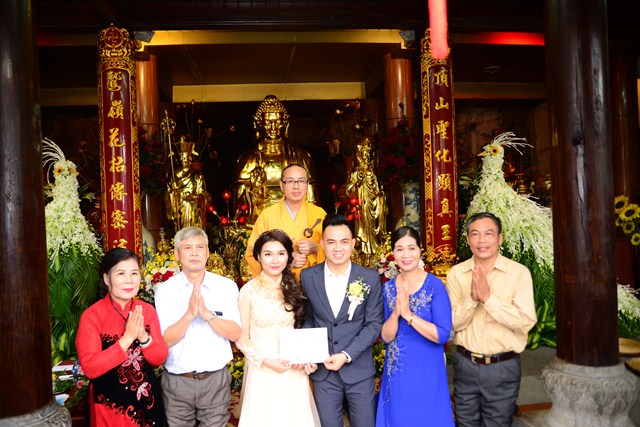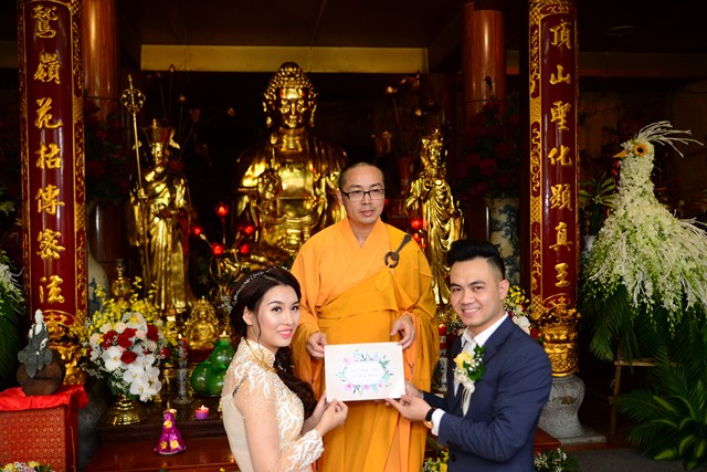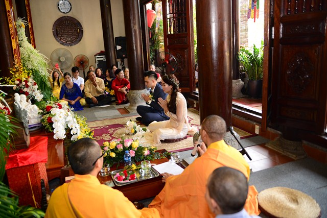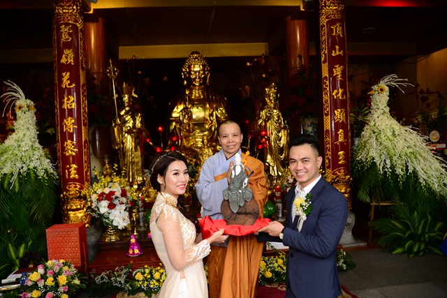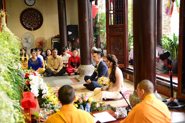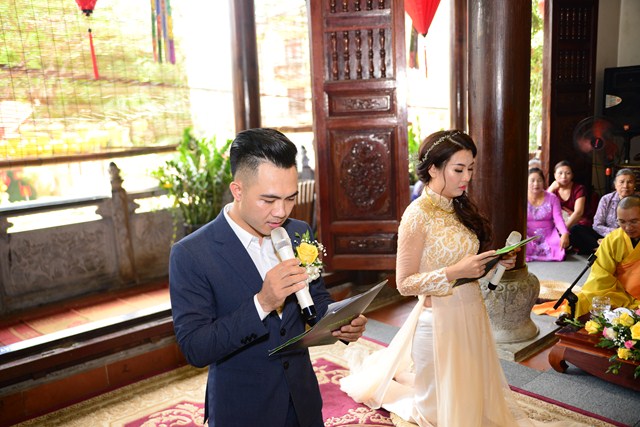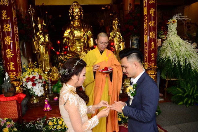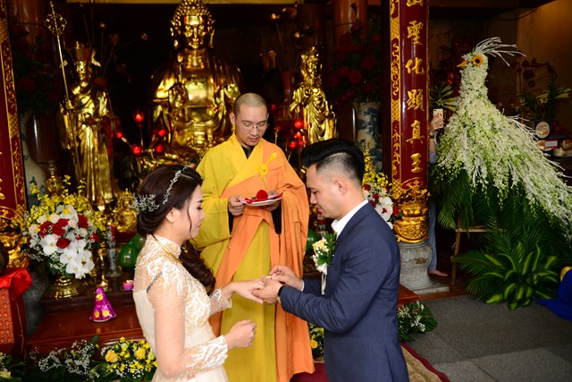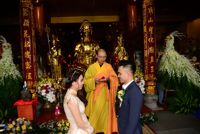 Trước khi chính thức cử hành nghi lễ hằng thuận cho đôi bạn trẻ, Đại đức Thích Giác Hiệu đã làm lễ quy y Tam Bảo và đặt pháp danh cho đôi bạn trẻ. Kể từ giờ phút này, hai bạn trẻ đã chính thức trở thành người con của Đức Phật và phát nguyện sẽ cố gắng giữ gìn năm giới của người Phật tử tại gia, nghiên cứu, học tập theo giáo lý Phật Đà, sau đó áp dụng giáo lý đó vào trong cuộc sống, thực hành theo đúng lời Phật dạy.