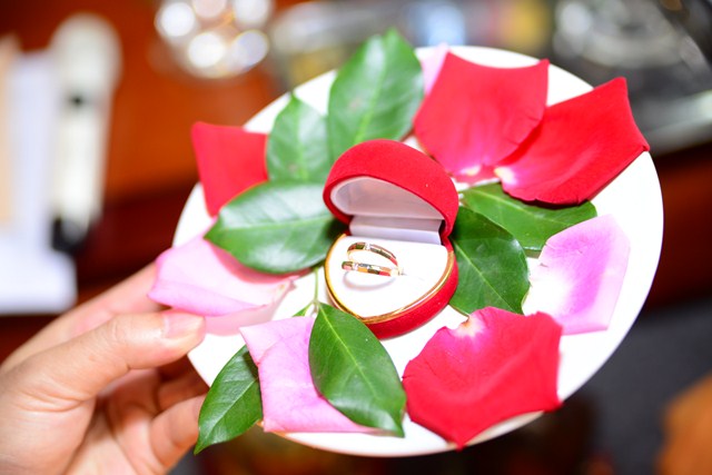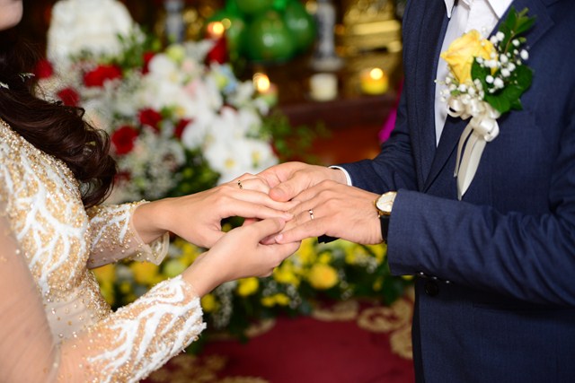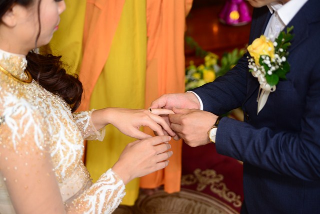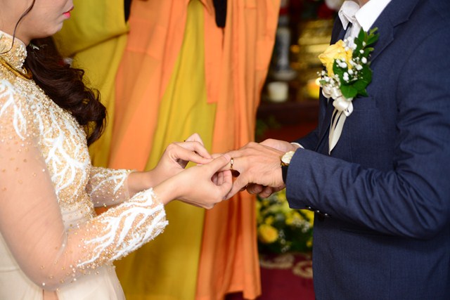 Thủ tục trao nhẫn cưới trong ngày lễ hằng thuận là thủ tục không thể thiếu, nhưng trước khi đôi bạn trẻ trao nhẫn cưới cho nhau, đôi bạn đã được Đại đức Thích Giác Vũ giảng về ý nghĩa của chiếc nhẫn trong ngày cưới, cũng như ý nghĩa của chữ “Nhẫn” đối với hạnh phúc gia đình. Theo đó, ” Nhẫn” ở đây là sự nhẫn nhịn, vợ chồng phải biết nhường nhịn, nhẫn nhịn nhau, tôn trọng nhau; “Nhẫn” ở đây chính là sự tu dưỡng đạo đức và tu dưỡng phẩm hạnh. Một gia đình có êm ấm, hòa thuận được hay không, phần lớn đó là do sự nhẫn nhịn quyết định. Sau khi đôi bạn trẻ đã hiểu về ý nghĩa của chiếc nhẫn, chư tăng đã làm lễ chúc phúc, lễ gia trì, chú nguyện vào đôi nhẫn để các bạn lần lượt trao nhẫn cho nhau.