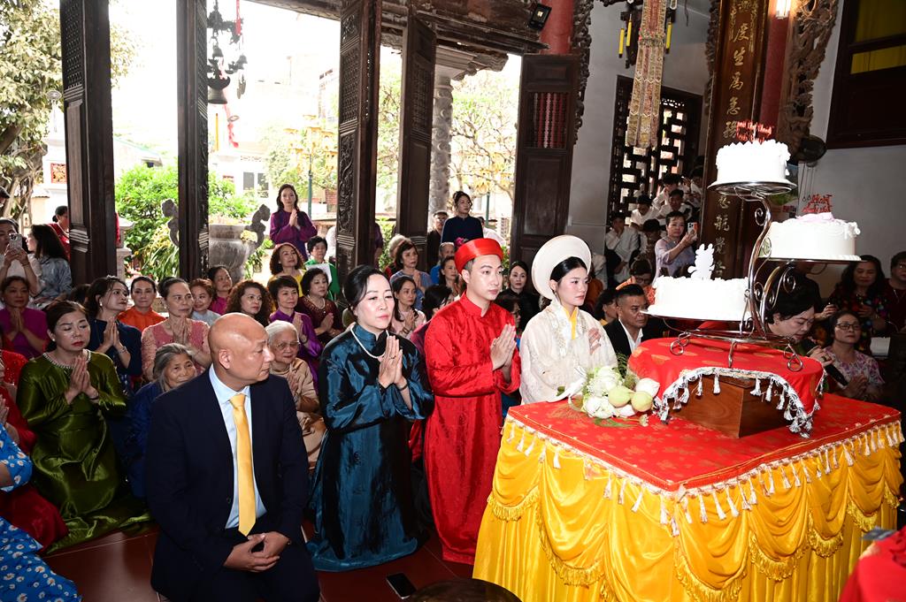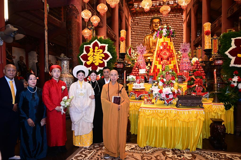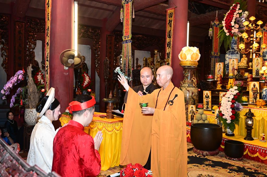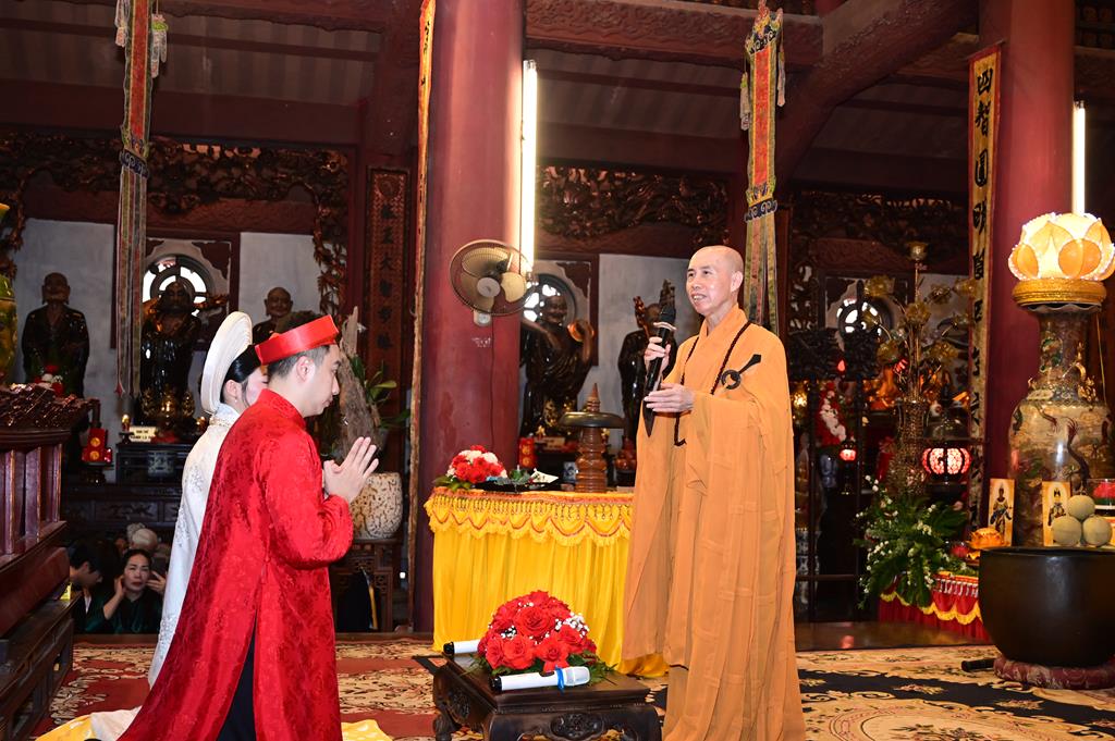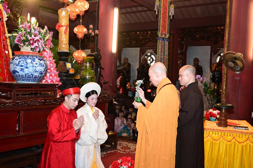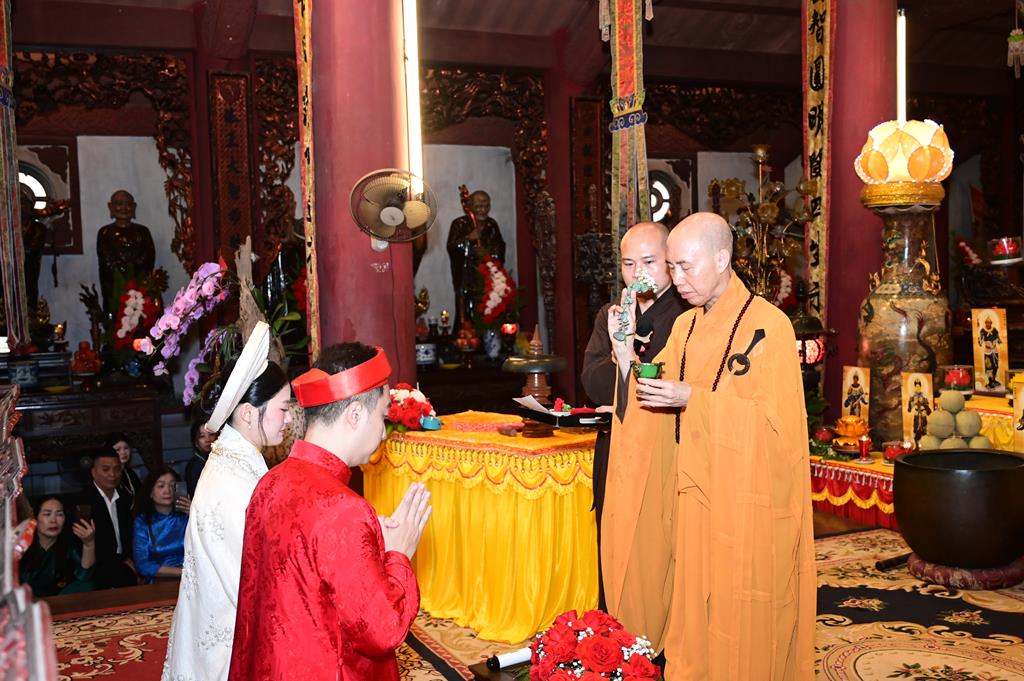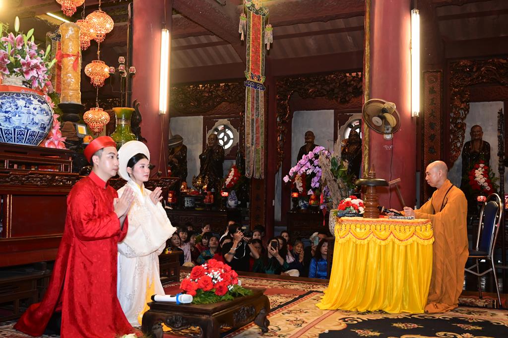 Tại chính điện, chư tôn đức hiện tiền và đôi tân lang, tân nương, cùng 2 bên gia đình và đông đảo quý Phật tử đang tu học tại trụ xứ đã tổ chức khóa lễ dâng hương, bạch Phật, lễ Phật cầu gia bị, trì đại bi thập chú, tụng Bát nhã tâm kinh cầu an, cầu nguyện cho buổi lễ hằng thuận được thập phần viên mãn.