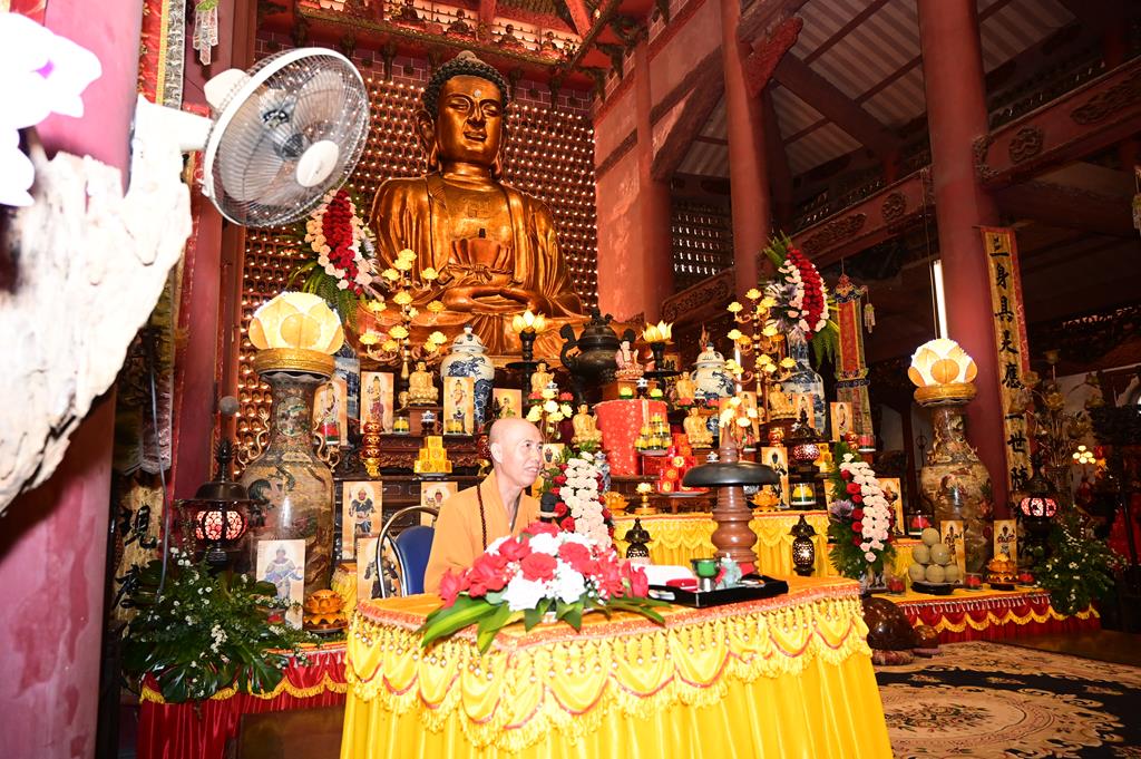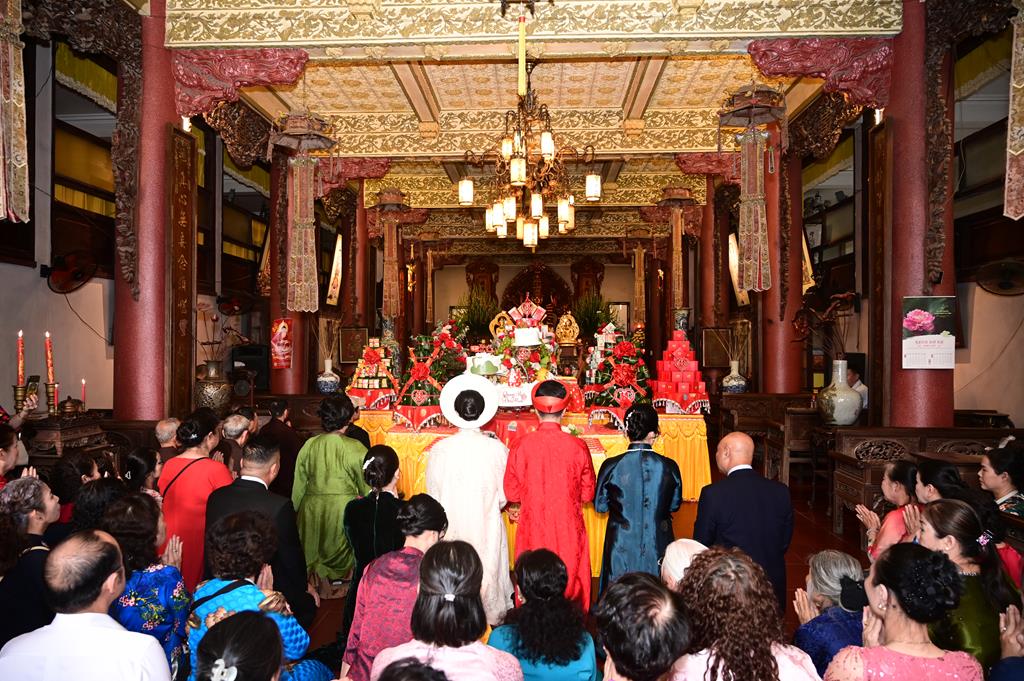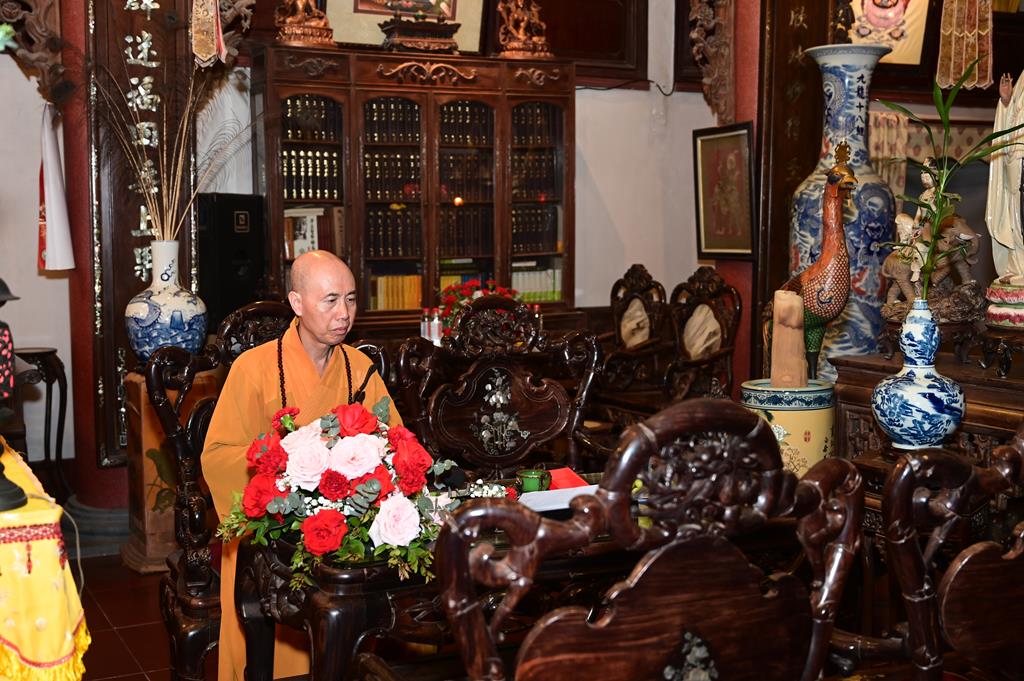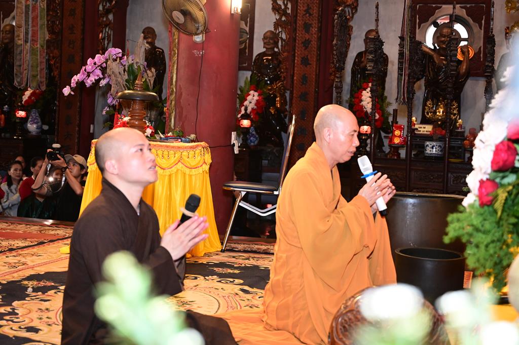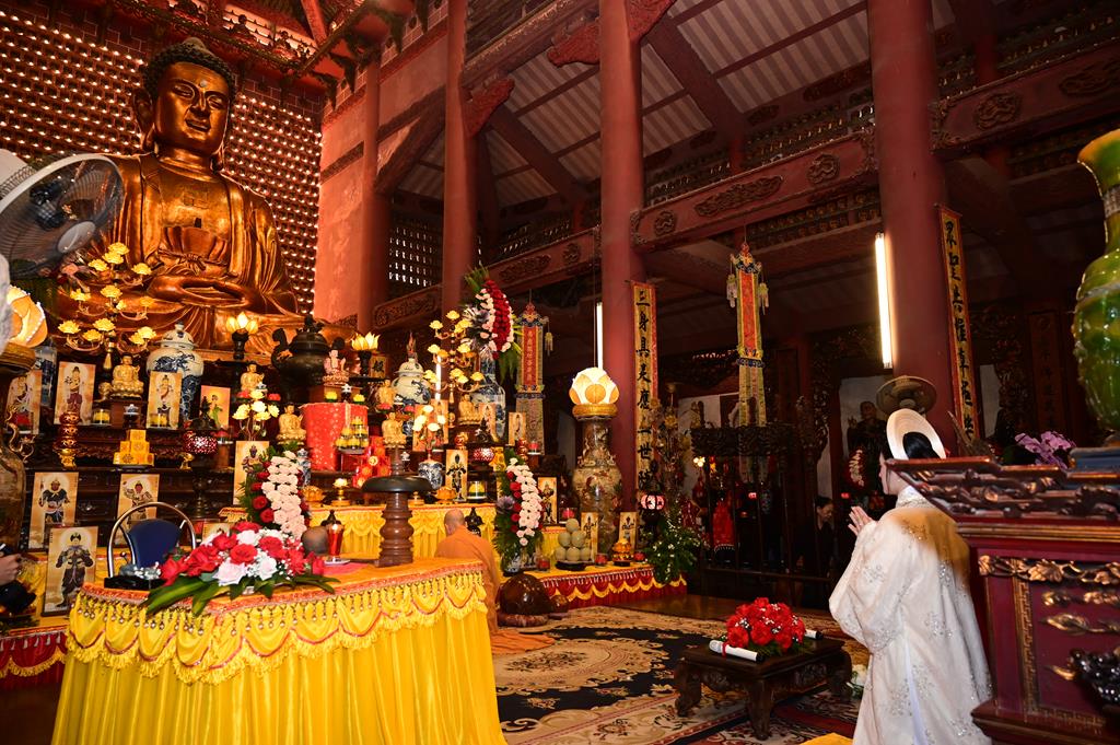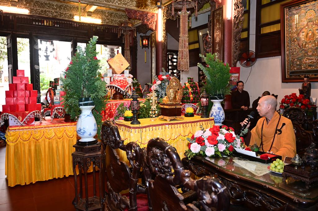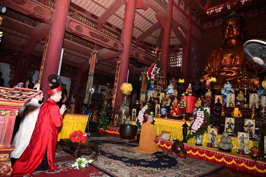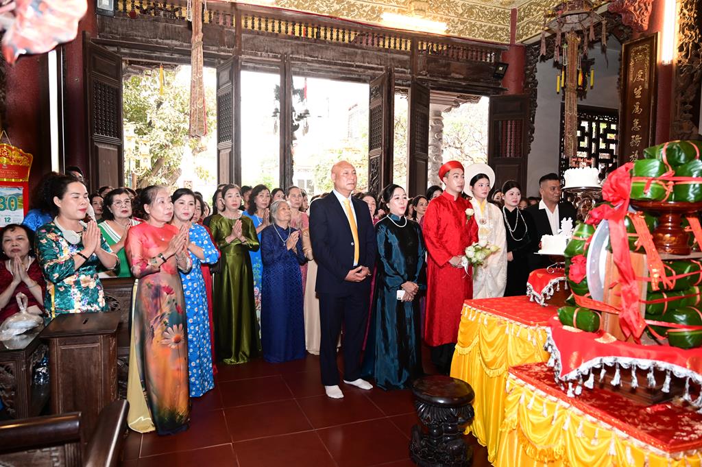 Tại chính điện, chư tôn đức hiện tiền và đôi tân lang, tân nương, cùng 2 bên gia đình và đông đảo quý Phật tử đang tu học tại trụ xứ đã tổ chức khóa lễ dâng hương, bạch Phật, lễ Phật cầu gia bị, trì đại bi thập chú, tụng Bát nhã tâm kinh cầu an, cầu nguyện cho buổi lễ hằng thuận được thập phần viên mãn.