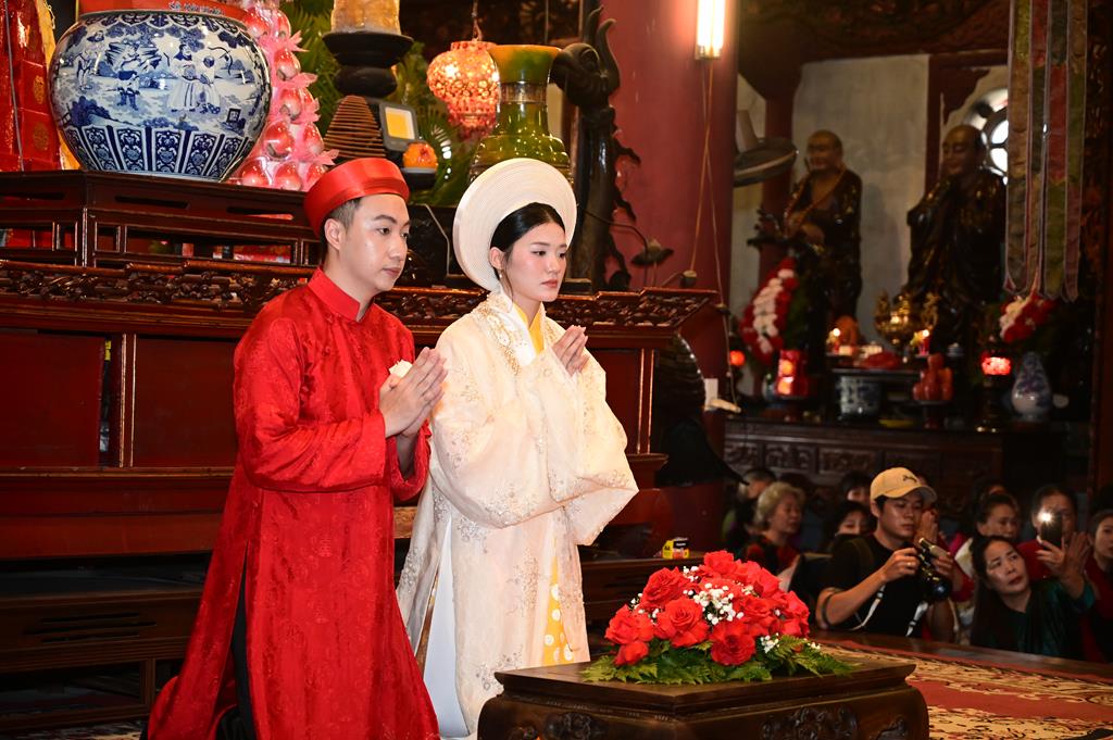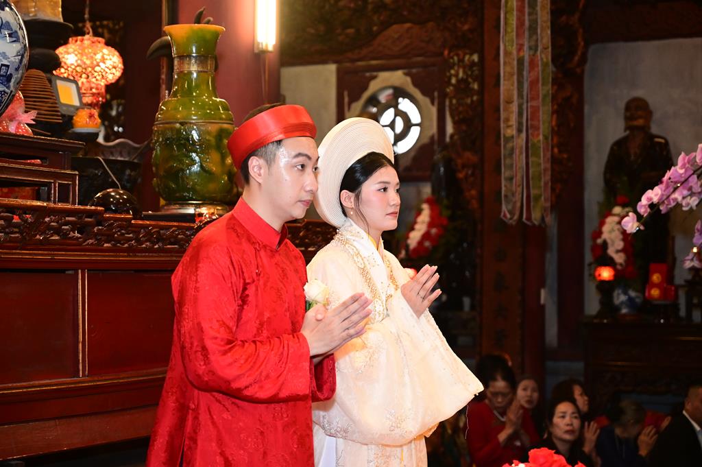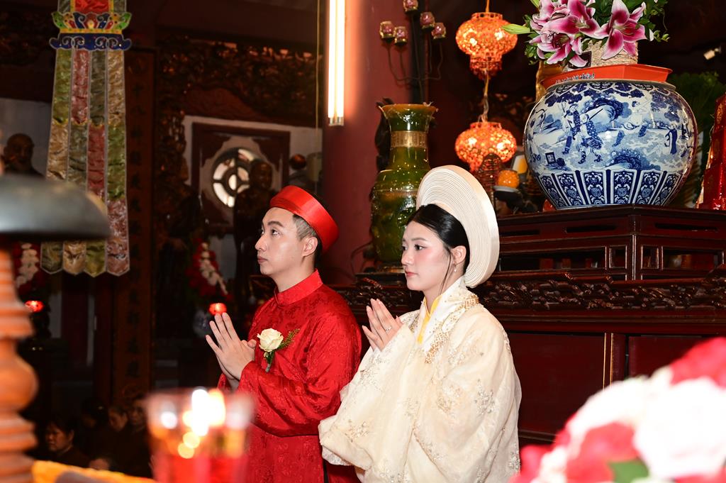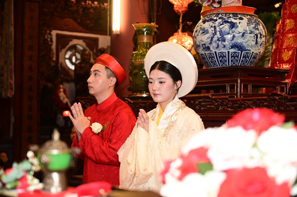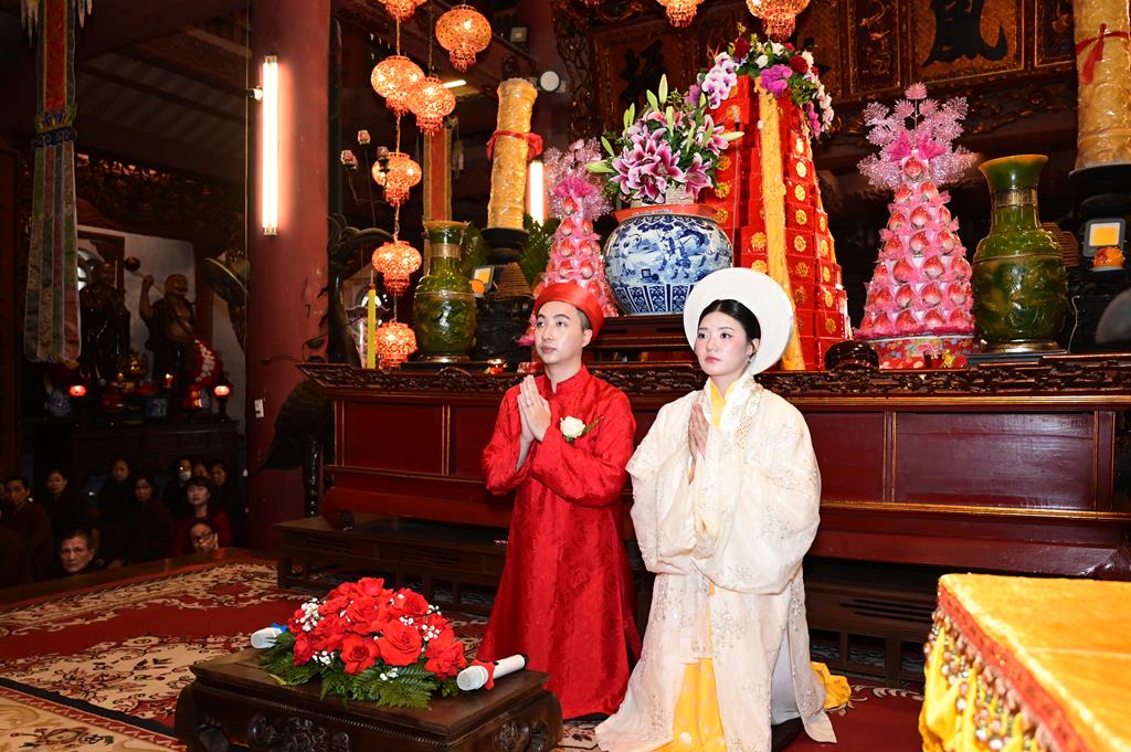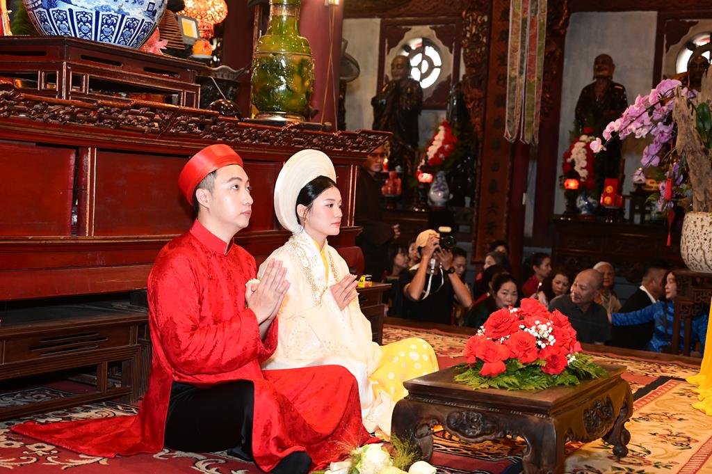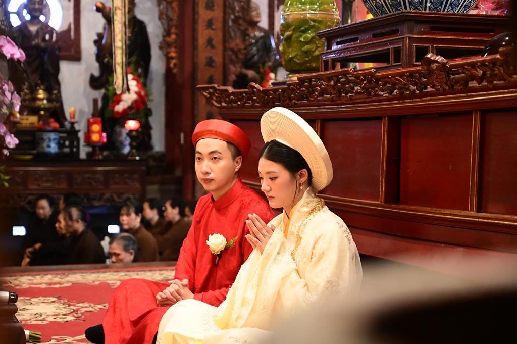 Đôi bạn trẻ đỉnh lễ Tam Bảo tại chính điện chùa Linh Độ (Chùa Đỏ)