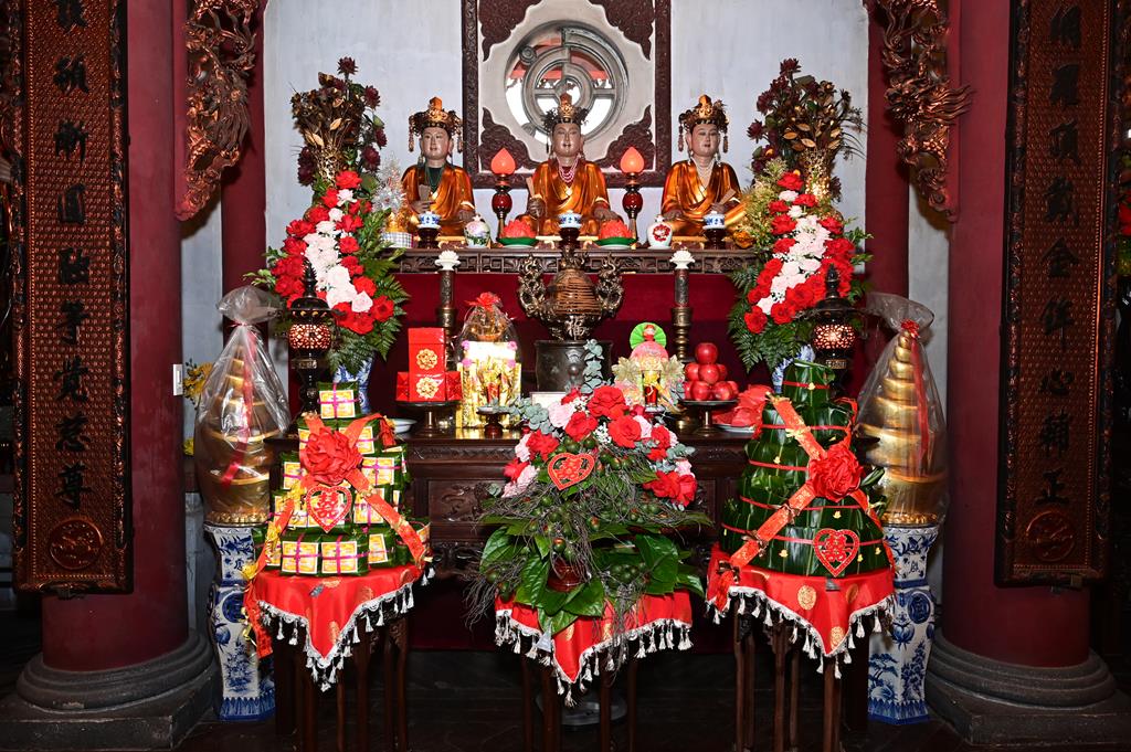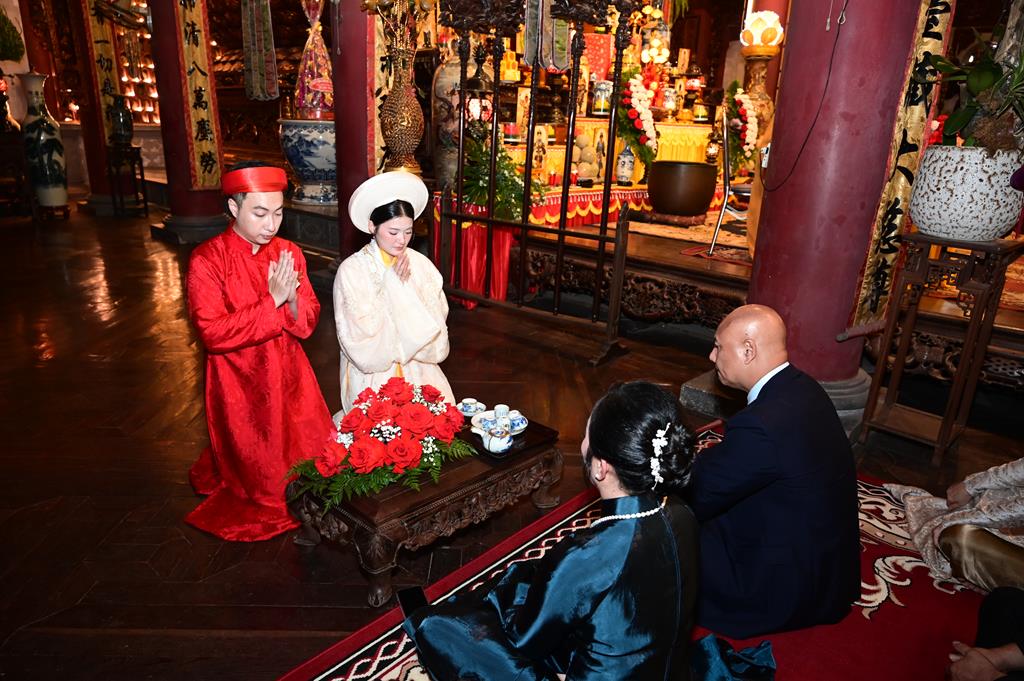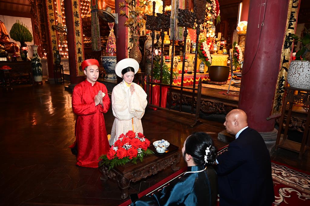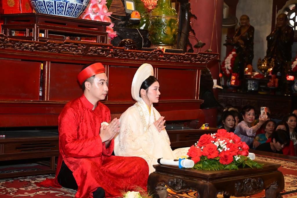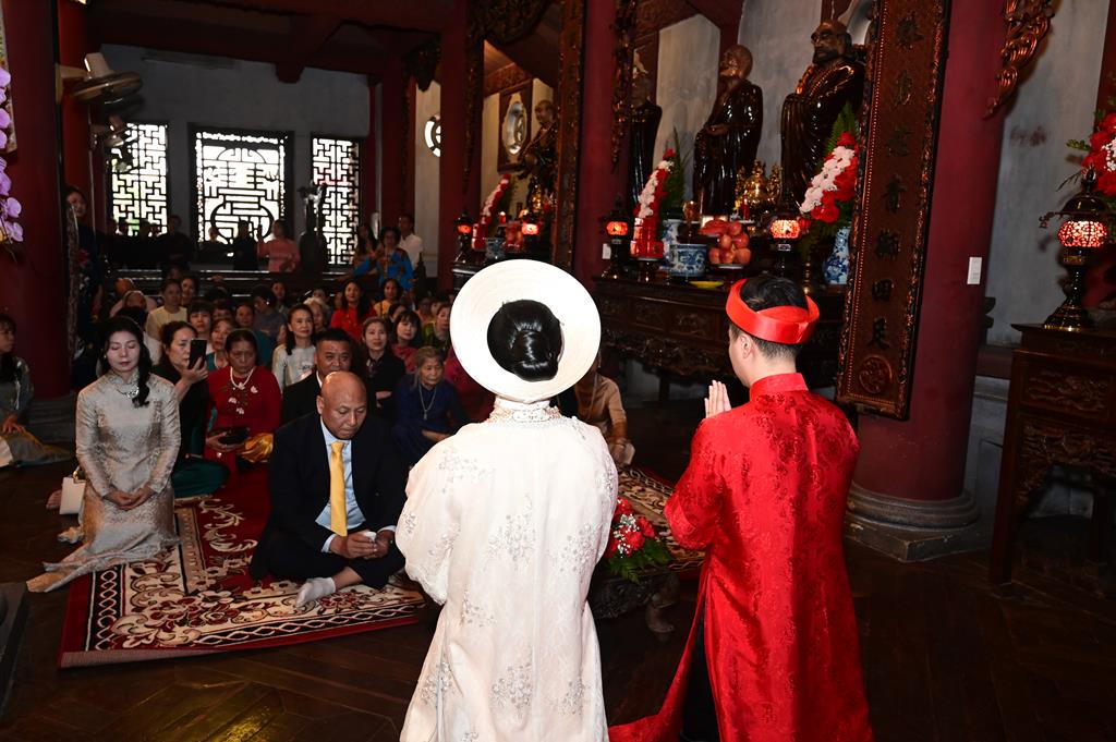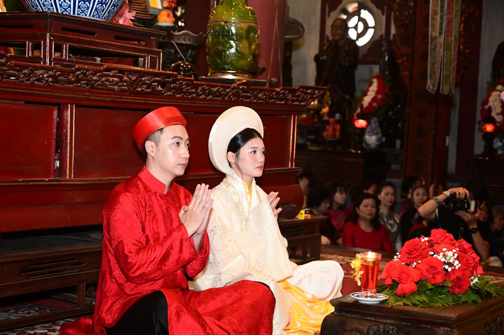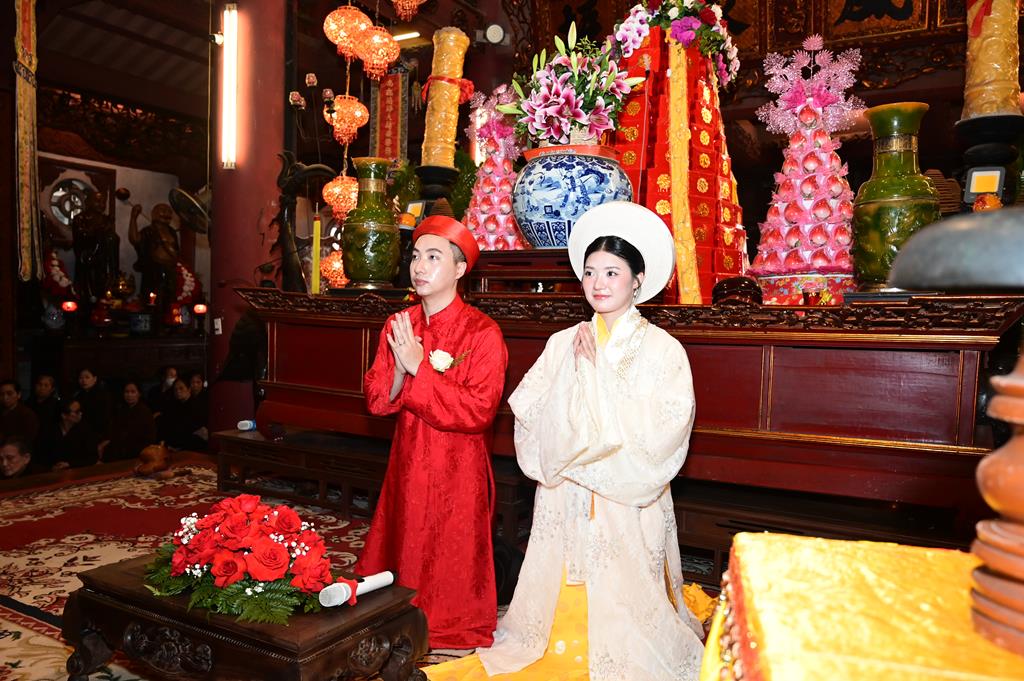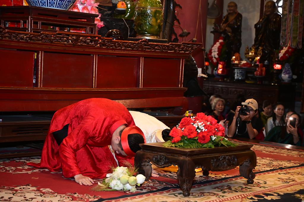 Đôi bạn trẻ đỉnh lễ Tam Bảo tại chính điện chùa Linh Độ (Chùa Đỏ)