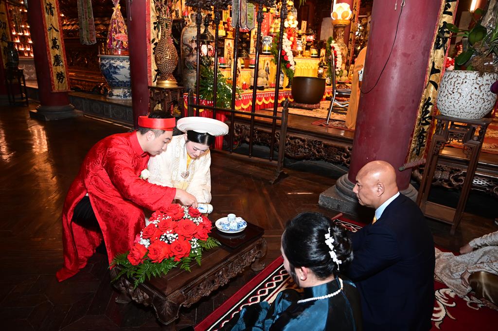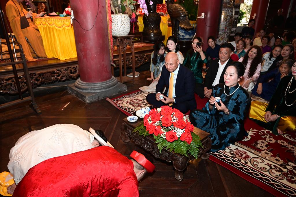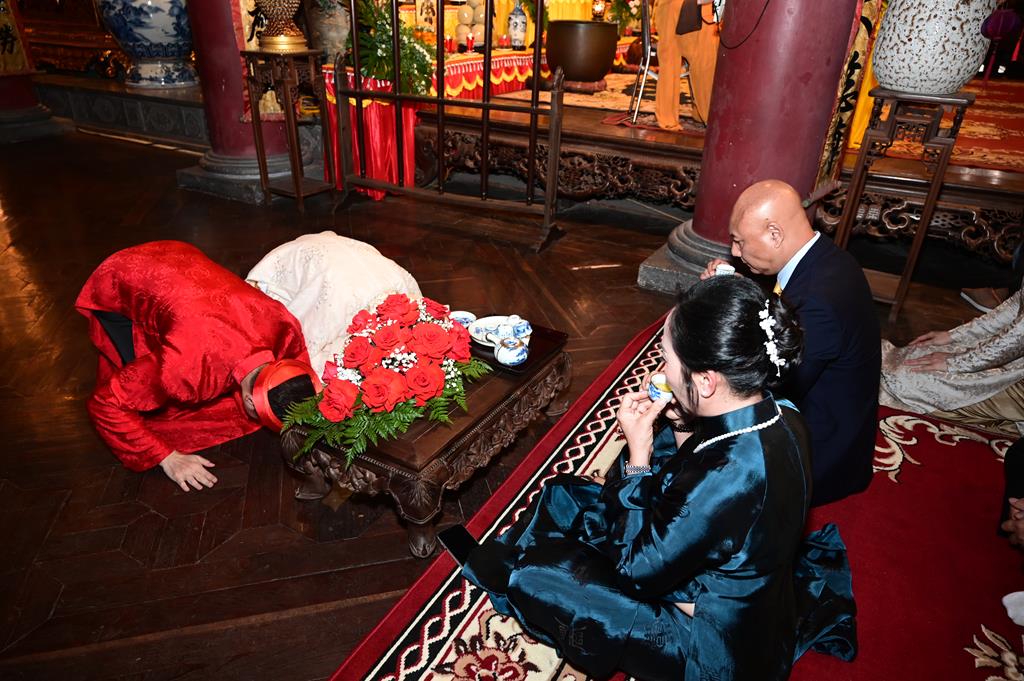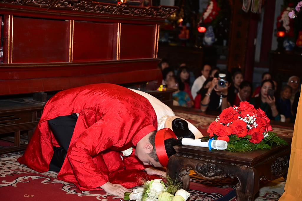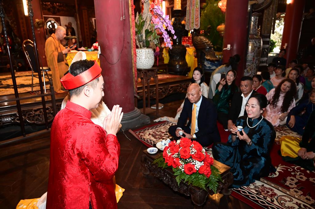 Dưới sự gia hộ của mười phương chư Phật và sự chứng minh của chư Tôn đức Tăng Ni, đôi bạn trẻ đã làm lễ tạ ơn Tam Bảo, lễ thụ ân cha mẹ, thông qua 10 công ơn (Thập ân) đã được Đức Phật chỉ dạy trong kinh “Báo Hiếu Phụ Mẫu Trọng Ân” và dâng trà tri ân công sinh thành dưỡng dục của hai đấng sinh thành. Lễ thụ ân cha mẹ đã làm cho cha mẹ đôi tân lang, tân nương không khỏi xúc động khi lần đầu tiên cha mẹ được chính con cái của mình lễ lạy tại một nơi trang nghiêm, thành kính, linh thiêng, trước sự chứng minh của chư tôn đức và đại diện hai bên gia đình, cùng quý Phật tử.