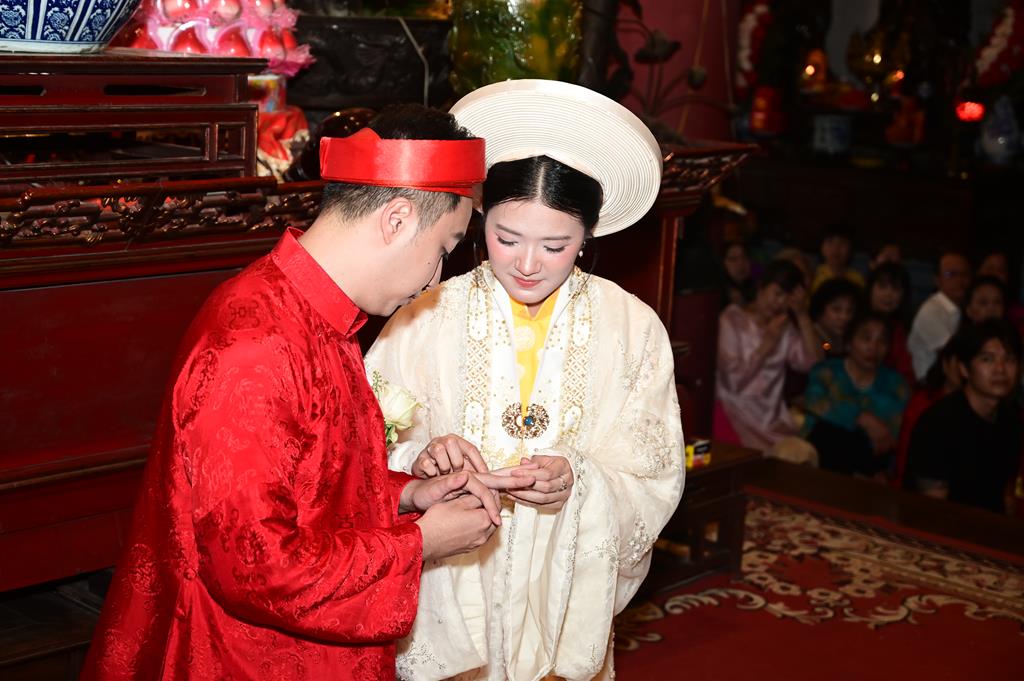 Một kỷ vật không thể thiếu trong mỗi lễ cưới hay mỗi buổi lễ hằng thuận, đó là đôi nhẫn cưới. Thượng tọa trụ trì đã gia trì, chú nguyện vào đôi nhẫn cưới, trước khi hai bạn trẻ trao nhẫn cho nhau. Nhân đây, Thượng tọa chia sẻ thêm về nguồn gốc, xuất xứ ý nghĩa của đôi nhẫn cưới, ý nghĩa của chữ “Nhẫn” đối với hạnh phúc gia đình. Về chất liệu của nhẫn được làm bằng vàng, thể hiện sự vĩnh cửu, gắn kết, bền chặt, khó thay đổi theo thời gian, cũng giống như sự chung thủy và vĩnh cửu trong hôn nhân, là lời hứa về sự gắn kết không bao giờ phai nhạt, thể hiện tình yêu bền vững và chân thành. Nhẫn còn là một bảo vật quý báu, nó quý báu như chính trong tình yêu, hôn nhân vậy.