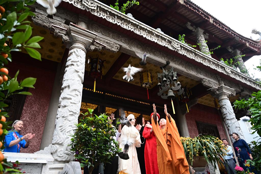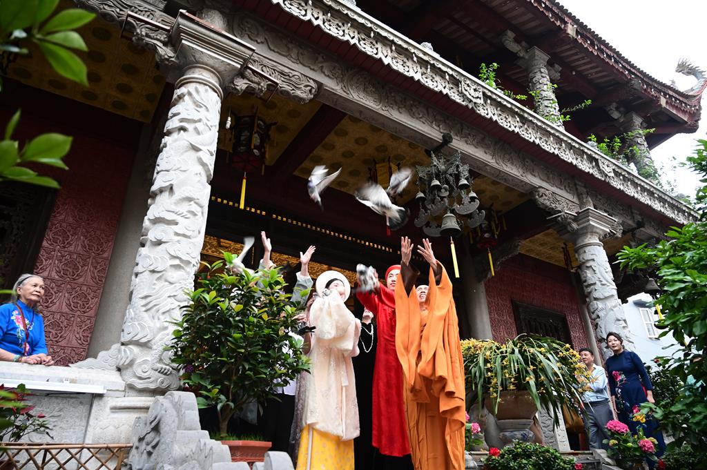 Trước khi kết thúc buổi lễ, Thượng tọa trụ trì và đôi tân lang, tân nương cùng gia đình đã thả chim bồ câu phóng sinh, cầu nguyện thế giới hòa bình, chúng sinh an lạc và cầu nguyện cho đôi bạn trẻ được trăm năm hạnh phúc.