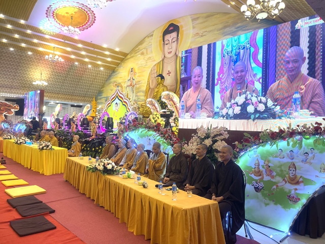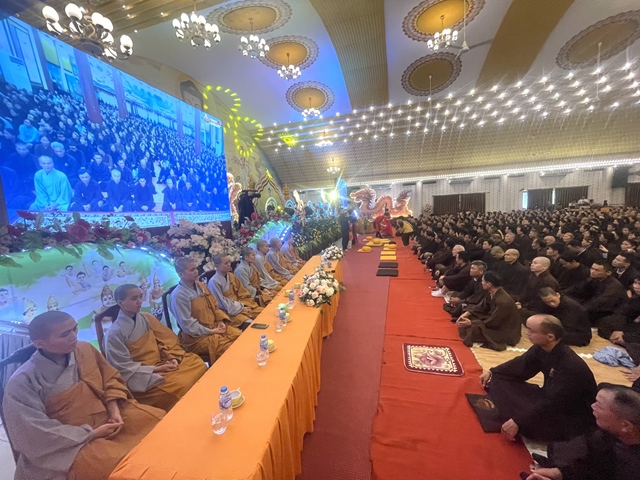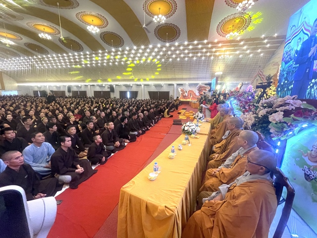 Sau nghi thức niệm Phật cầu gia bị, chào Quốc kỳ, Đạo kỳ, toàn thể đại chúng đón nghe bức thông điệp Đại lễ Phật đản PL. 2568 của Đức Pháp Chủ GHPGVN, Đại lão Hòa thượng Thích Trí Quảng gửi chư tôn đức Tăng Ni, đồng bào Phật tử ở trong nước và ở nước ngoài. Toàn thể đại chúng đã khởi thân đứng dậy, chắp tay trang nghiêm, thành kính, lắng đọng tâm tư đón nghe bức thông điệp Phật đản đầy ý nghĩa với tinh thần Từ Bi của đạo Phật, với mong muốn thế giới không còn chiến tranh, thù hận. Bên cạnh đó, Đại lão Hòa thượng Pháp Chủ GHPGVN cũng kêu gọi chư tôn đức Tăng Ni, Phật tử “ tinh tấn tu tập, thể nhập Từ bi tam muội, lan tỏa tình yêu thương đến chúng sanh vạn loại, thắp sáng thế gian này bằng ánh sáng từ bi và trí tuệ. Với tất cả ý nghĩa thiêng liêng của ngày kỷ niệm Đức Phật đản sanh, tôi mong muốn tất cả người con Phật trên khắp thế giới đoàn kết, cùng cả nhân loại chung sống vị tha, kiến tạo thế giới hòa bình, an lạc… Mùa Phật đản, mùa của yêu thương và hiểu biết, tôi kêu gọi tất cả những người con Phật hãy tinh tấn thực hành những lời dạy vàng ngọc của đức Phật; tịnh hóa tâm thức; chuyển hóa tam độc tham, sân, si thành tam vô lậu học giới, định, tuệ; kiến tạo chánh báo trang nghiêm thanh tịnh để hình thành y báo hòa bình, an lạc như kinh Duy Ma Cật đã dạy: “Tâm bình thế giới bình”.