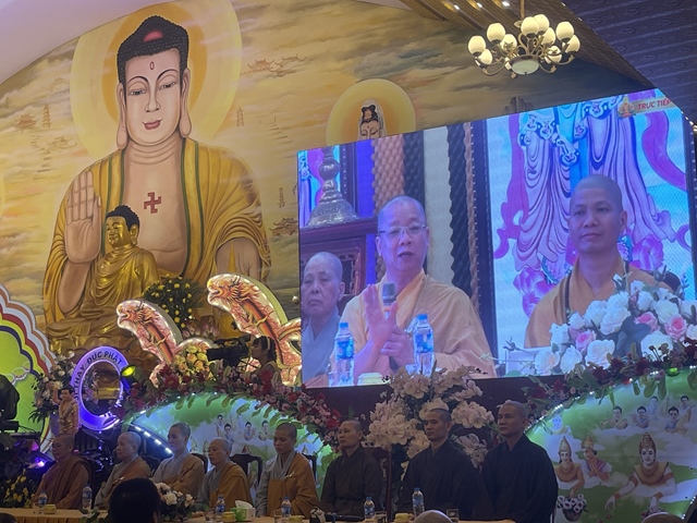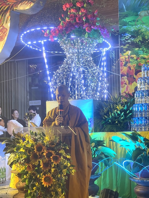 Tiếp đó, Đại đức Thích Pháp Hoàng đã lên tuyên đọc Diễn văn Phật đản PL. 2568 – DL. 2024 của đức Trưởng lão Hòa thượng Thích Thiện Nhơn – Phó Pháp chủ HĐCM, Chủ tịch HĐTS TƯ GHPGVN gửi chư tôn đức tăng ni và Phật tử nhân đại lễ Phật đản năm nay. Trong bài diễn văn, trưởng lão Hòa thượng Chủ tịch HĐTS đã nhắc nhở “ Tăng Ni phải đề cao trách nhiệm, giữ vững kỷ cương, và làm tròn bổn phận của mình góp phần xiển dương chánh pháp, bảo vệ niềm tin, tỏa sáng đạo màu đến khắp nhân gian. Các cấp Giáo hội tập trung tổ chức tốt kỳ an cư kết hạ Phật lịch 2568 nêu cao tính kỷ cương, trách nhiệm, hành trì giới luật để trang nghiêm Giáo hội ngõ hầu báo đáp, tri ân công đức sâu dày của Chư vị Tổ sư tiền bối. Tăng Ni các chùa, cơ sở tự viện đổi mới sáng tạo trong phương thức hướng dẫn tín đồ Phật tử phù hợp với mọi tầng lớp trong xã hội, góp phần chăm sóc sức khỏe tinh thần, xây dựng và làm đẹp nền đạo đức xã hội thông qua việc tổ chức các Khóa tu Mùa hè cho thanh thiếu niên Phật tử hè 2024 giúp cho các bạn trẻ trở thành những con ngoan, trò giỏi, học tập tiến bộ. Giáo dục lòng yêu nước, tự hào truyền thống anh hùng của dân tộc Việt Nam; Phát huy tinh thần đại đoàn kết dân tộc chung tay xây dựng quê hương, đất nước Việt Nam hùng cường, thịnh vượng. Thiện hữu nam nữ Phật tử làm người công dân tốt. Gắng sức tu tập, luôn tinh tấn trau dồi đức hạnh, dứt bỏ tham, sân, si, thói quen mê lầm, phiền não nỗ lực tu tâm dưỡng tính để thân tâm được an lạc, thanh tịnh, được hưởng hạnh phúc nơi cuộc đời và bước lên con đường giải thoát trong tương lai.”