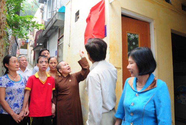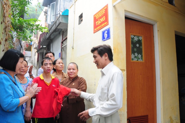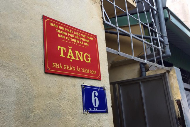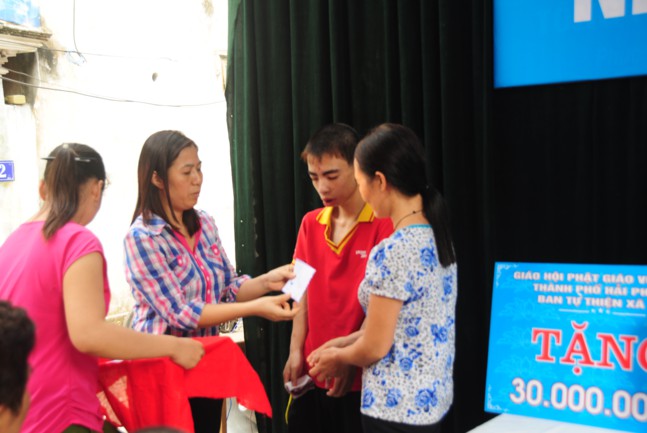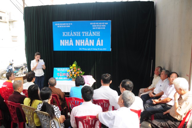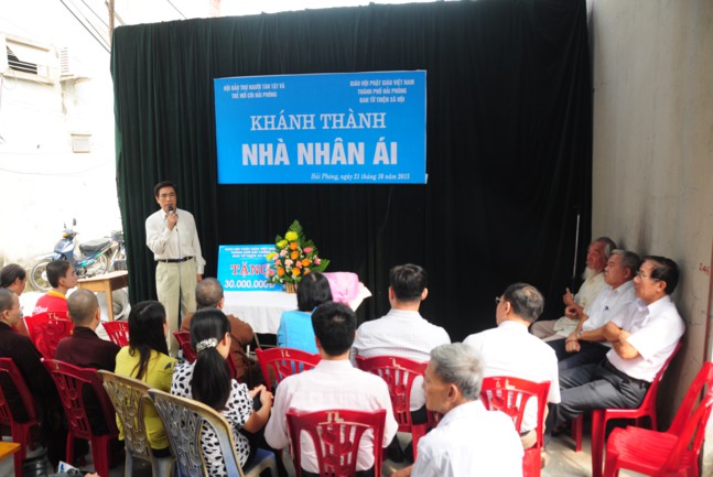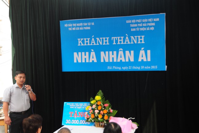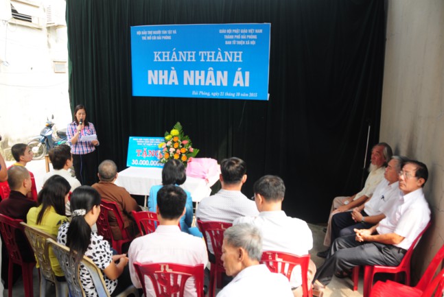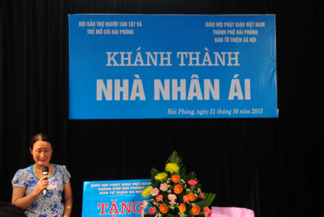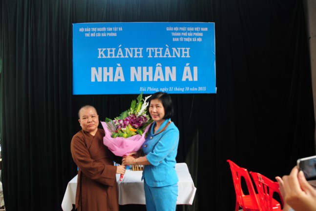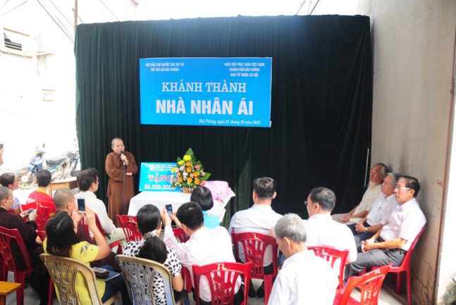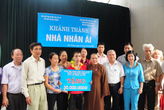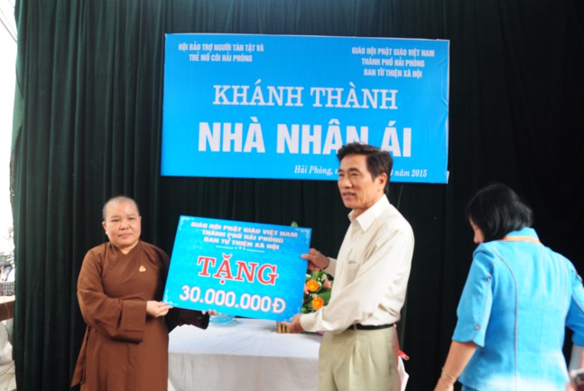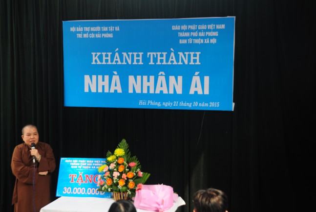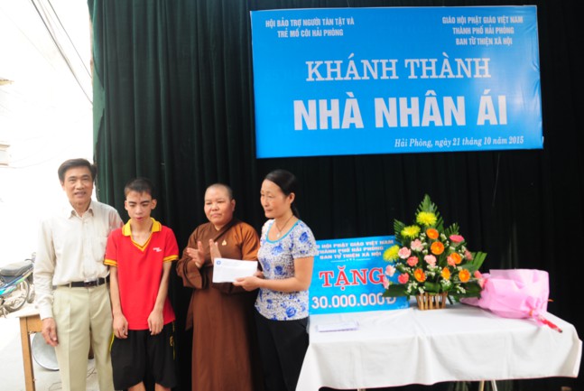 Tại buổi trao Nhà nhân ái cho mẹ con em Nguyễn Đức Thiện, Ni Sư Thích Tâm Chính – Trưởng Ban từ thiện – xã hội GHPGVN thành phố Hải Phòng đã trao tặng biển tượng trưng trị giá 30 triệu đồng cho Hội bảo trợ người tàn tật và trẻ mồ côi thành phố Hải Phòng và có đôi lời động viên chia sẻ với mẹ con em Nguyễn Đức Thiện, cố gắng khắc phục khó khăn để vươn lên trong cuộc sống.
