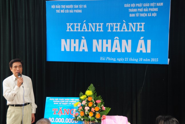 Nhân dịp này ông: : Phạm Văn Huấn – Chủ tịch Hội bảo trợ người tàn tật và trẻ mồ côi thành phố Hải Phòng và chính quyền địa phương đã gửi lời tri ân tới GHPGVN thành phố Hải Phòng đã luôn sát cánh, luôn quan tâm đến các đối tượng chính sách của thành phố trong những năm vừa qua, cùng thành phố thực hiện công cuộc xóa đói, giảm nghèo và hy vọng trong thời gian tới vẫn tiếp tục nhận được sự hỗ trợ, đóng góp của Ban từ thiện xã hội GHPGVN thành phố cũng như của Chư tôn đức Tăng Ni và các Phật tử trên tinh thần từ bi, cứu khổ, ban vui của nhà Phật.