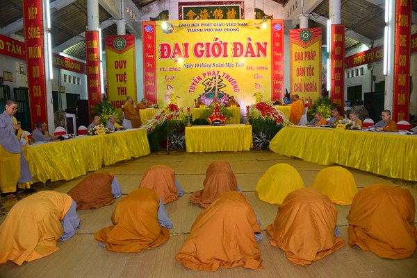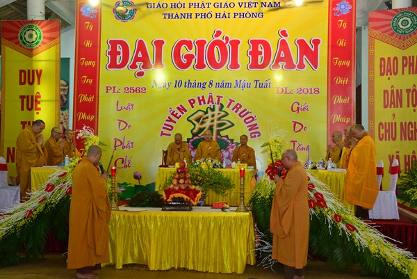 Trước khi chính thức tiến hành Giới đàn truyền giới, Hội đồng giới sư, tôn chứng sư, thầy nghiệp sư của các giới tử và các giới tử cầu giới đã trang nghiêm thành kính lễ Phật, lễ Tổ tại chính điện chùa Nam Hải, sau khi lễ Phật, lễ Tổ, đàn tràng trang nghiêm thanh tịnh, giới sư thanh tịnh, giới tử chí thành đúng 8 giờ 30 phút đã chính thức diễn ra Đại giới đàn Hải Phòng PL. 2562 – DL. 2018.