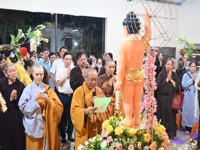 Cuối buổi lễ là nghi thức Mộc Dục ( tắm Phật) theo truyền thống Phật giáo, toàn thể đại chúng đã xếp hàng lần lượt lên tắm Phật, gột rửa thân tâm bằng 3 gáo nước dội lên Kim thân của Đức Phật. Khi múc gáo nước đầu tiên, tắm bên vai phải của tôn tượng Đức Phật đản sinh nhỏ nhắn, chúng ta tâm nguyện rằng: dù trên đời có gặp việc phải, vừa ý, gọi là thuận cảnh, tâm của chúng ta vẫn bình tĩnh thản nhiên. Khi múc gáo nước thứ hai, tắm bên vai trái của tôn tượng, chúng ta tâm nguyện rằng: dù trên đời có gặp việc trái ý, gọi là nghịch cảnh, tâm của chúng ta vẫn bình tĩnh thản nhiên và gáo nước thứ 3 nguyện sẽ luôn biết giúp đỡ, yêu thương tất cả mọi người xung quanh.