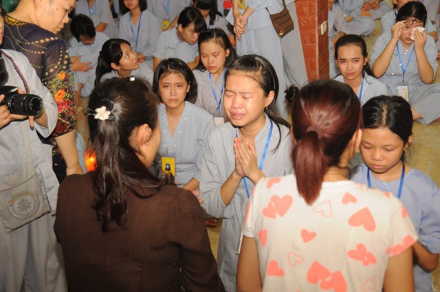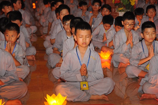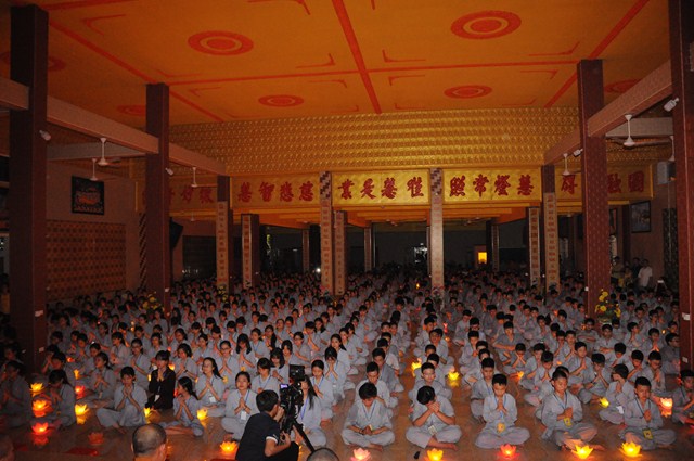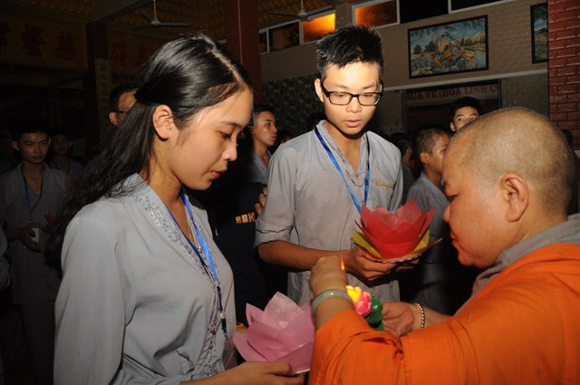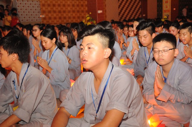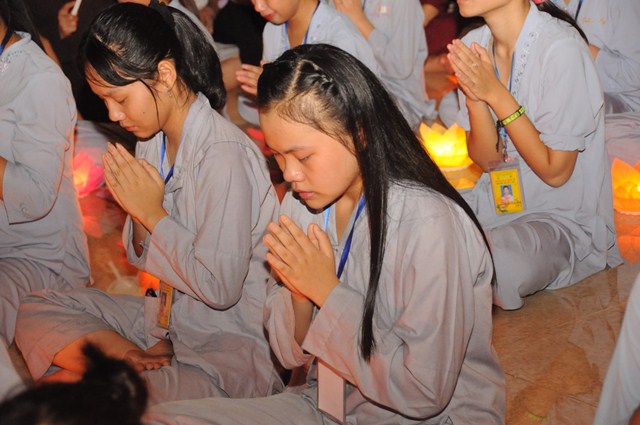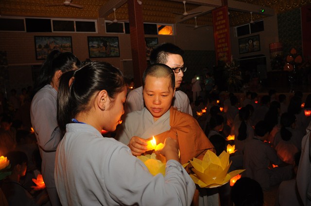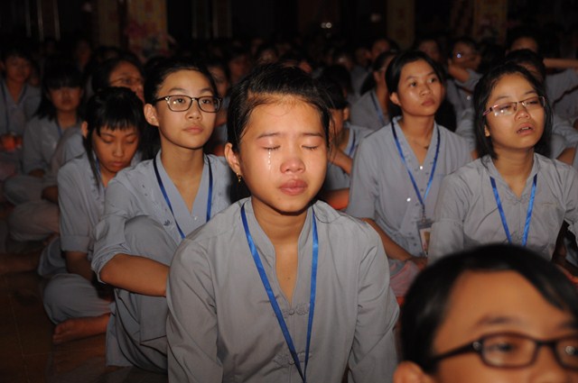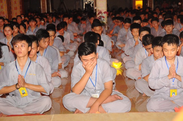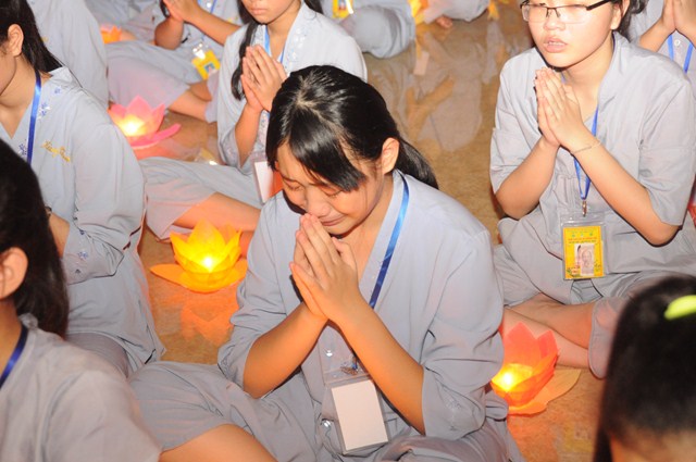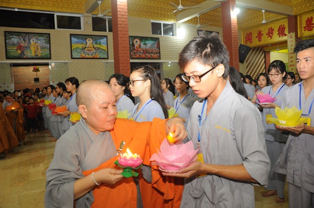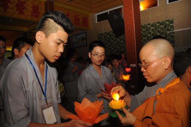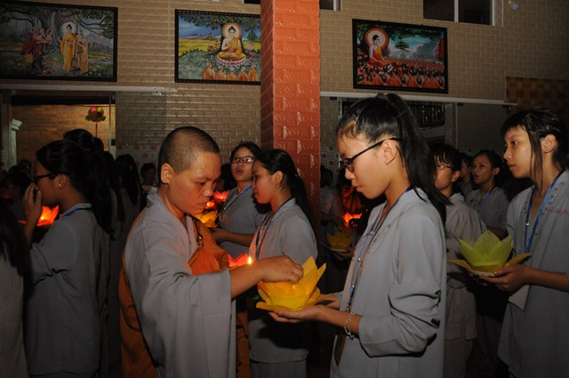 Thời khắc linh thiêng nhất của buổi lễ đã đến khi chư tôn đức đón nhận ánh sáng từ bàn Phật, ánh sáng của Từ Bi và Trí Tuệ để truyền sang cho gần 700 khóa sinh tham dự khóa tu mùa hè năm nay. Từng ngọn hoa đăng đã được thắp sáng khắp cả giảng đường, một không gian lung linh, huyền ảo được hiện ra. Trước mặt các em là những ngọn nến của tình thương và sự hiểu biết. Cầm ngọn nến trên tay, các em đã tự hứa với lòng mình là từ nay sẽ không để cho cha mẹ buồn, sẽ cố gắng học tập tốt để không phụ lòng quý sư thầy, sư cô đã dạy dỗ các em trong những ngày vừa qua cũng như không phụ lòng cha mẹ đã không quản ngại gian nan, vất vả, nuôi dạy các em để các em có được thân hình, vóc dáng như ngày hôm nay. Rất nhiều giọt nước mắt đã rơi khi các em tự thấy bản thân mình có lỗi với cha mẹ. Ban tổ chức khóa tu cũng hy vọng khi về nhà các em sẽ thay đổi cách sống và suy nghĩ của mình, trở thành những con người tốt, có ích cho xã hội.