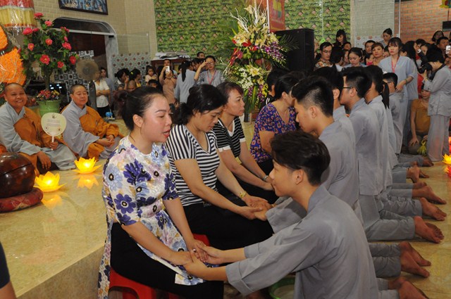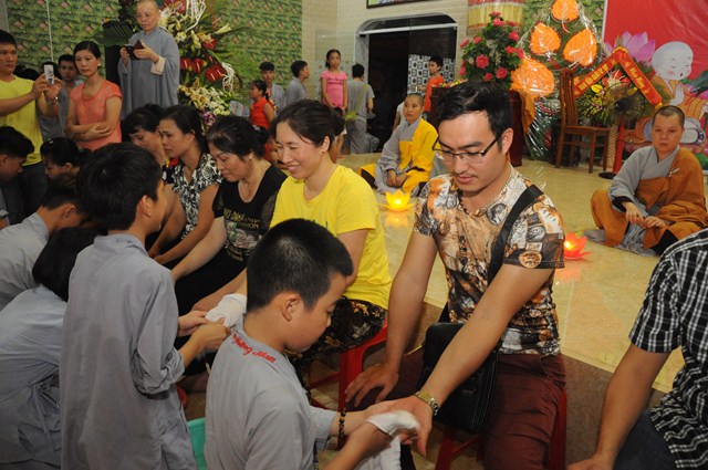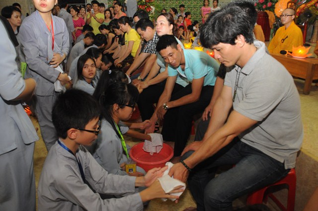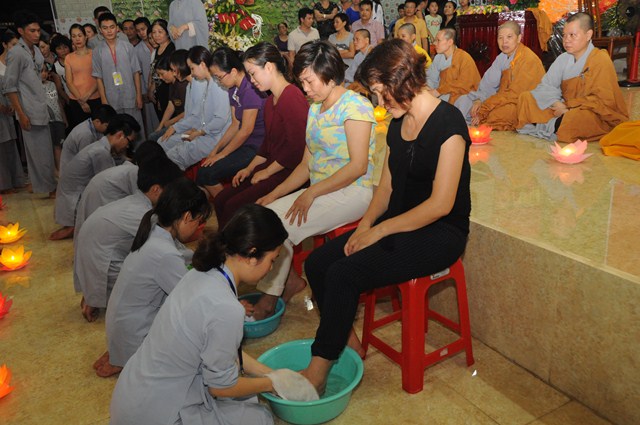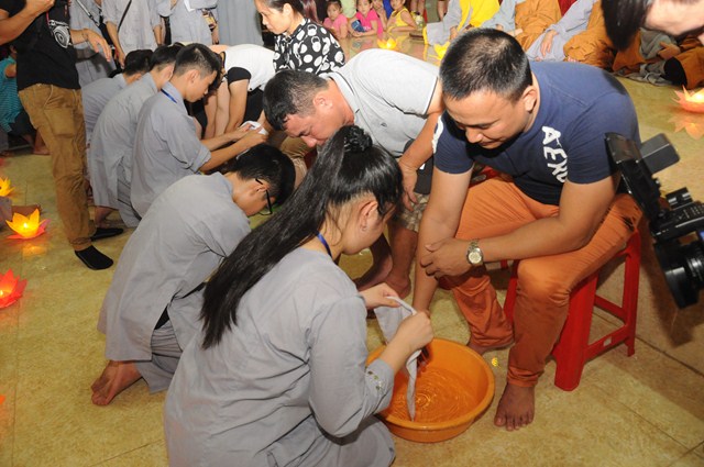 Giờ phút mong đợi, thiêng liêng nhất của ngày hôm nay đã đến khi chương trình lễ rửa chân và hoa đăng tri ân cha mẹ được diễn ra vào lúc 19 giờ 30 phút cùng ngày. Buổi tối hôm nay, đại diện một số vị phụ huynh của các em khóa sinh đã được Ban tổ chức khóa tu mùa hè chùa Vẽ mời tới tham dự buổi lễ. Sau gần 1 tuần các em khóa sinh xa nhà, các vị phụ huynh có lẽ là rất nhớ các con của mình và các em khóa sinh cũng sẽ nhớ cha mẹ mình nhiều hơn khi được học những bài học về đạo hiếu qua lời giảng của quý Sư thầy, Sư cô. Và hôm nay, chính các vị phụ huynh đã được con của mình rửa chân, tay cho mình, mẹ, cha khi nhìn thấy con của mình thay đổi hẳn so với những ngày trước khi tham gia khóa tu, những giọt nước mắt đã rơi tuôn vì xúc động trước tình cảm mà con cái đã dành cho mình. Đây là một thành công lớn của mỗi khóa tu mùa hè được tổ chức. Với mong muốn là các sau khóa tu khi các con trở về với gia đình sẽ biết thương yêu cha mẹ mình nhiều hơn.
