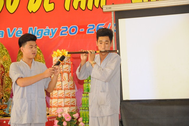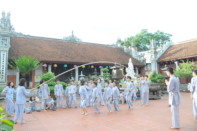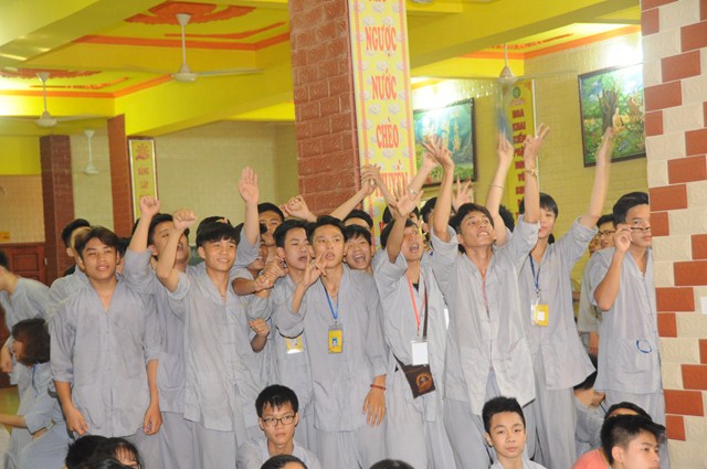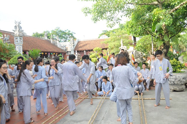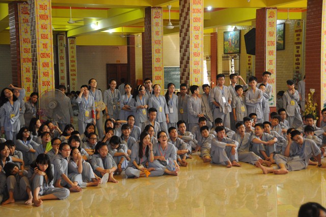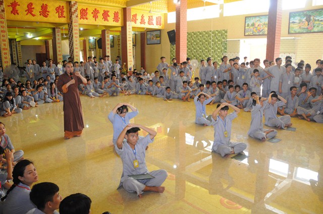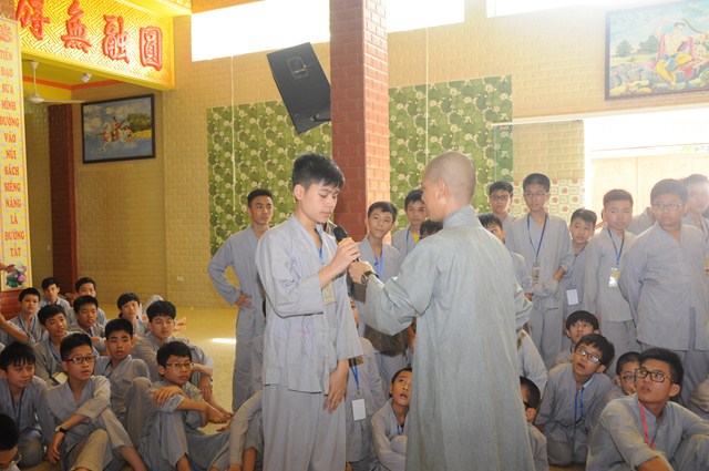 Buổi chiều các em đã được chơi 2 trò chơi rất ý nghĩa. Đó là trò chơi “Hồi Trống Pháp” dựa trên phiên bản của chương trình “Rung Chuông Vàng” trên truyền hình. Đây là chương trình trả lời các câu hỏi do Ban tổ chức đưa ra nhằm ôn lại cho các em tất cả những kiến thức mà các em đã được học trong những ngày vừa qua. Bao gồm các kiến thức về giáo lý Phật Đà, kiến thức tổng hợp về lịch sử, địa lý, xã hội, văn học…Qua chương trình này đã giúp cho các em ghi nhớ hơn những kiến thức đã được lĩnh thụ tại chùa trong 6 ngày tu học vừa qua.