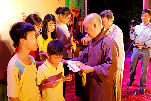 Trong khuôn khổ của chương trình “ Đêm Hội Trăng Rằm”, được sự chia sẻ của Đại Đức Thích Bản Hoan – Trụ trì chùa Phúc Linh, các Phật tử thuộc đạo tràng Phật Tâm đại diện là Phật tử: Lê Ngọc Thiệp – Chúng trưởng đạo tràng Phật Minh và Đại đức Thích Bản Hoan đã trao tặng 35 phần quà cho các em học sinh nghèo vượt khó trong xã mỗi phần quà trị giá là 500 ngàn đồng để các em mua sách vở, đồ dùng học tập, với mong muốn các em sẽ phấn đấu học tập thật tốt để trở thành những người con ngoan, trò giỏi, sau này trưởng thành sẽ góp phần xây dựng quê hương, Đất Nước giàu mạnh.