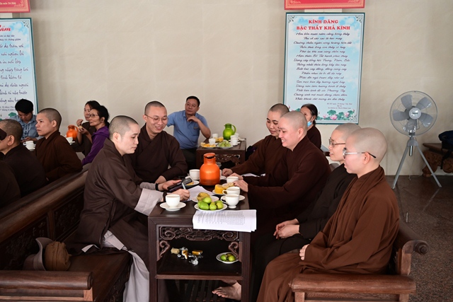Đại diện Đài phát thanh và Truyền hình Hải Phòng nghe Hòa thượng trưởng BTC đóng góp ý kiến về phóng sự