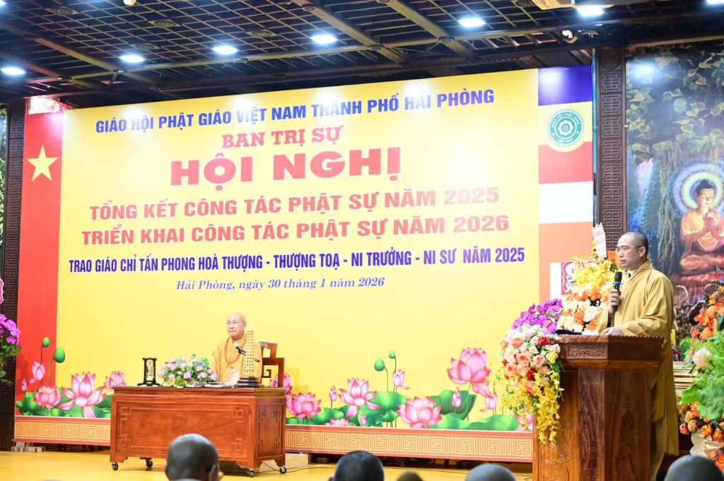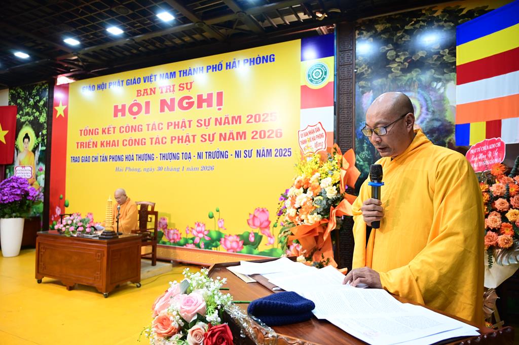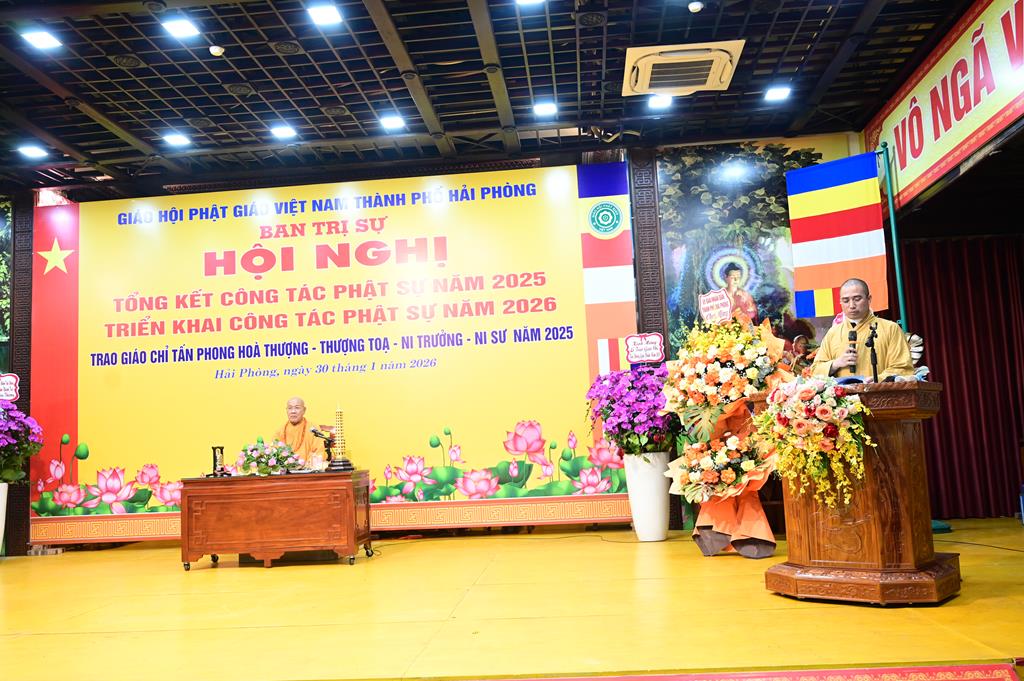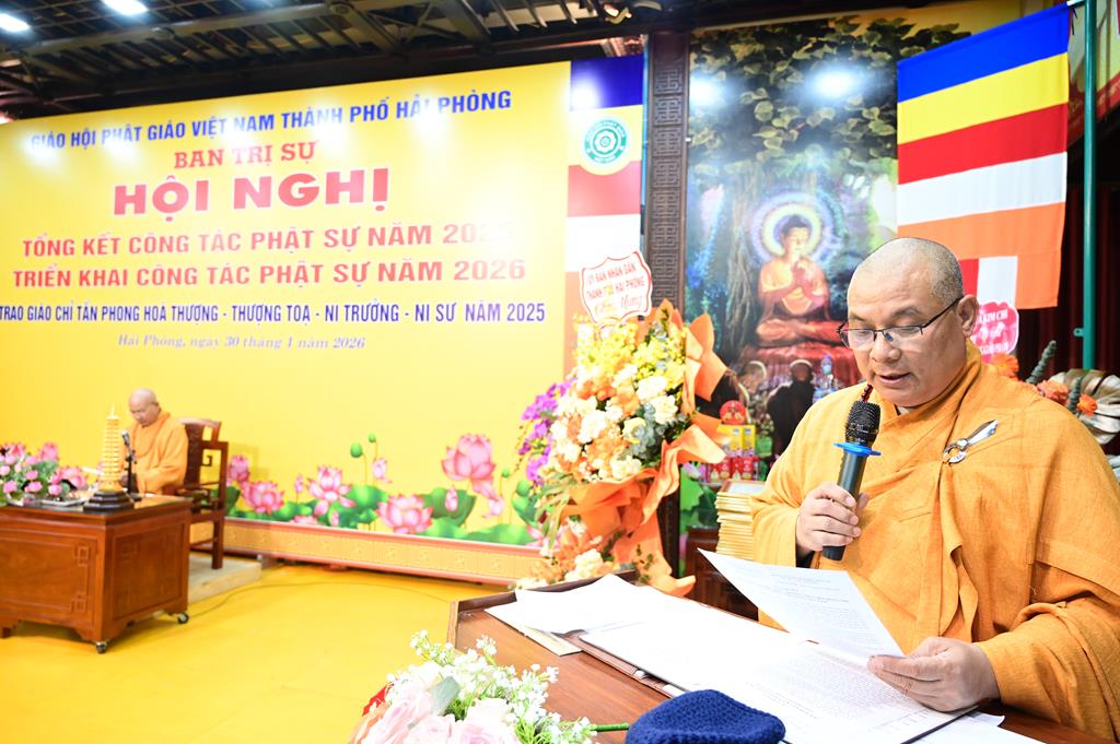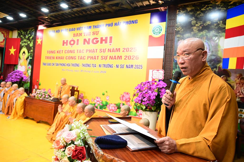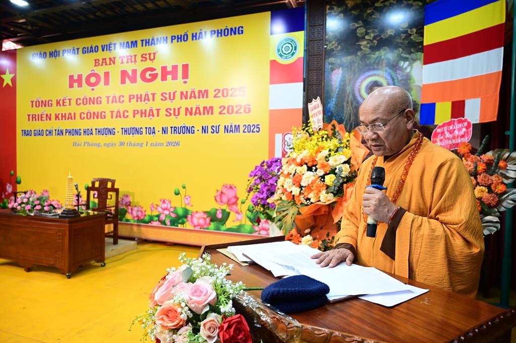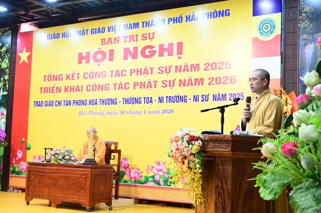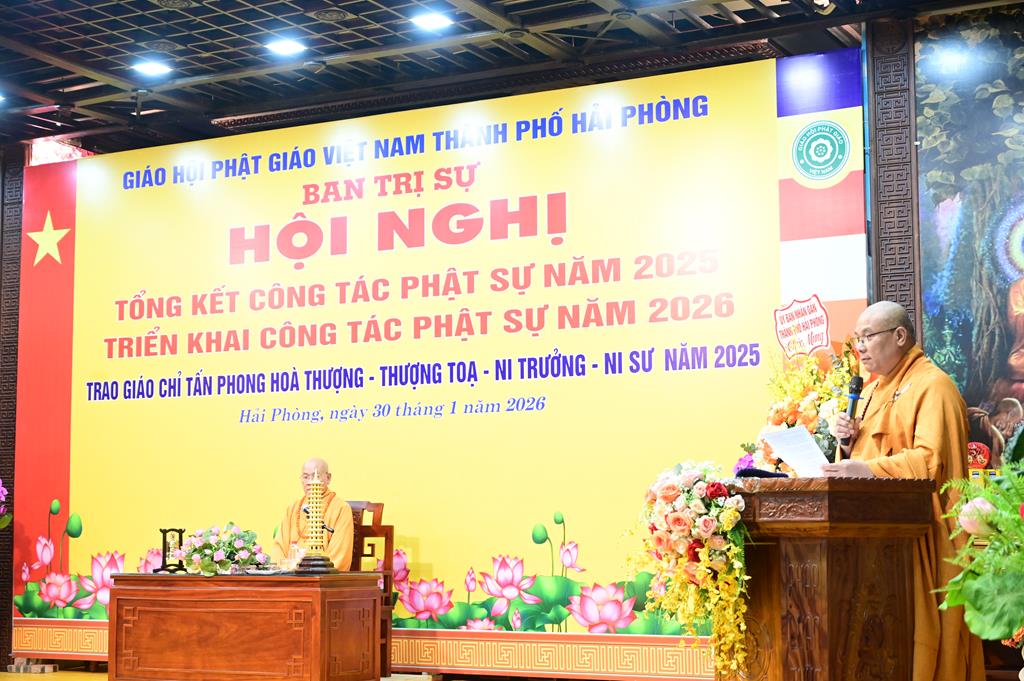 Tiếp theo đó, Thượng tọa Thích Tục Minh, Ủy viên Dự khuyết HĐTS GHPGVN, chánh Thư ký BTS GHPGVN thành phố Hải Phòng đã lên Báo cáo tóm tắt Tổng kết công tác Phật sự năm 2025 và Phương hướng hoạt động Phật sự năm 2026. Theo đó, sau khi sáp nhập cơ học giữa Ban trị sự GHPGVN thành phố Hải Phòng và Ban trị sự GHPGVN tỉnh Hải Dương, thành phố Hải Phòng hiện có tổng số 1.075 Tăng Ni, 1.782 ngôi chùa, trong đó có 740 ngôi chùa hiện đang chưa có nhà sư trụ trì, 71 ngôi chùa được công nhận di tích lịch sử cấp Quốc gia, 170 ngôi chùa và cụm di tích đình chùa là di tích lịch sử cấp thành phố. Đặc biệt, chùa Côn Sơn – Thanh Mai di tích lịch sử cấp Quốc gia đặc biệt, vừa được tổ chức Giáo dục, Khoa học và Văn hóa Liên Hợp Quốc (UNESCO) ghi danh là di sản thế giới trong quẩn thể Di tích danh thắng Yên tử.