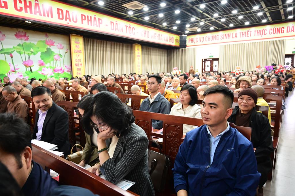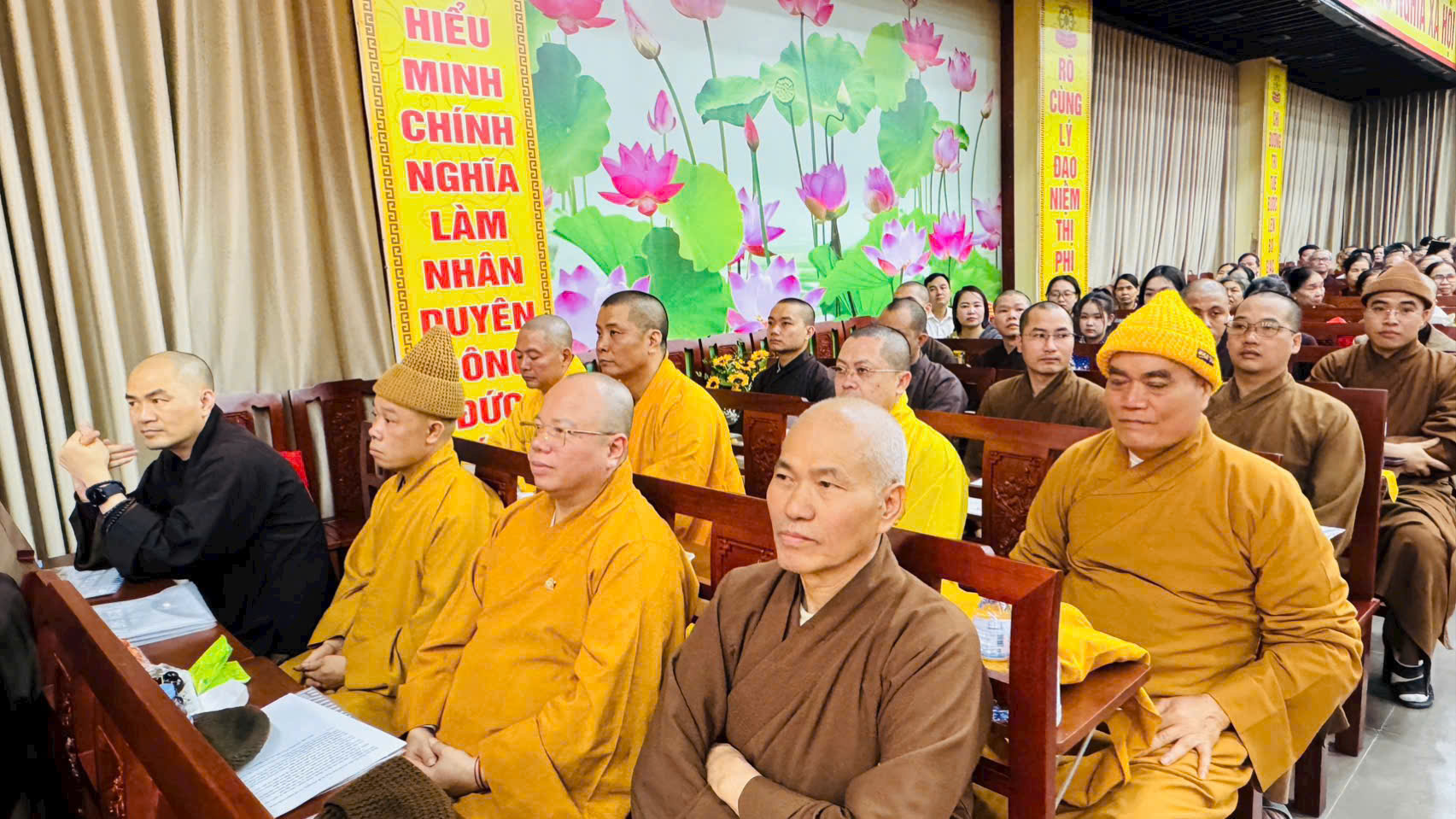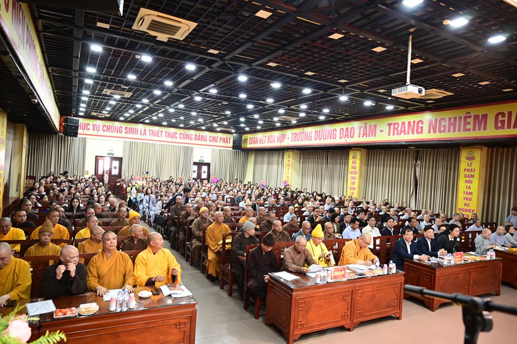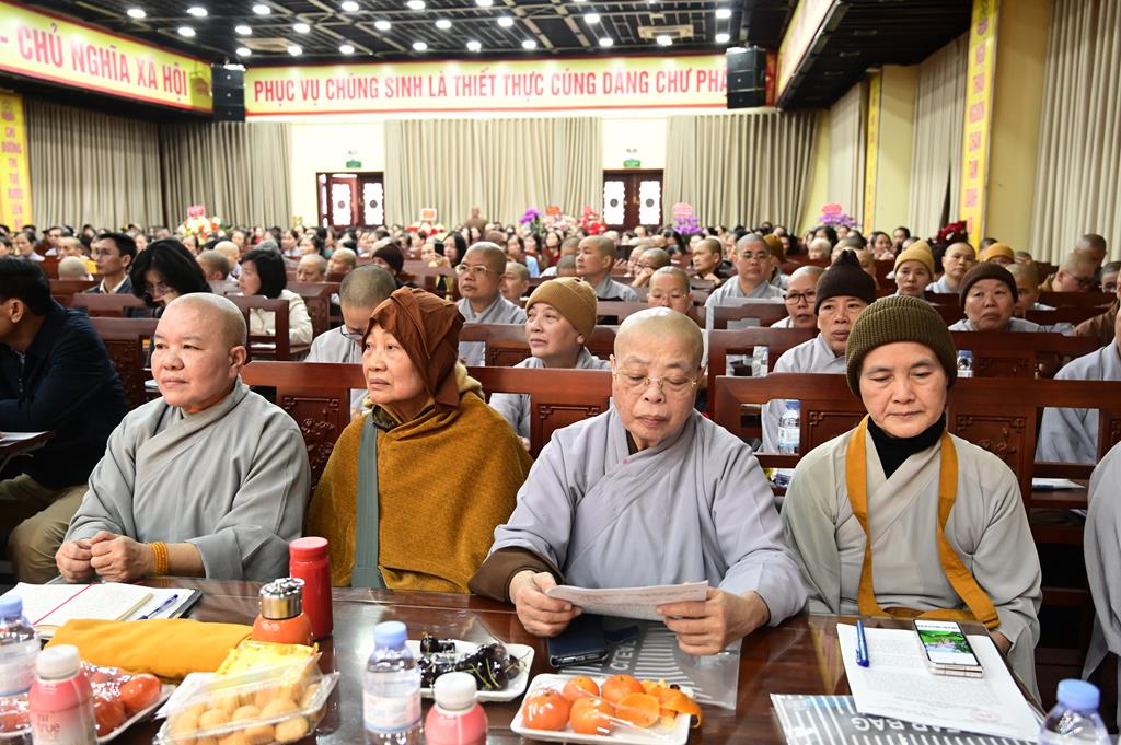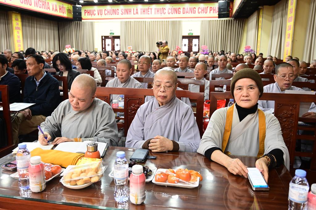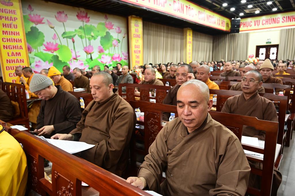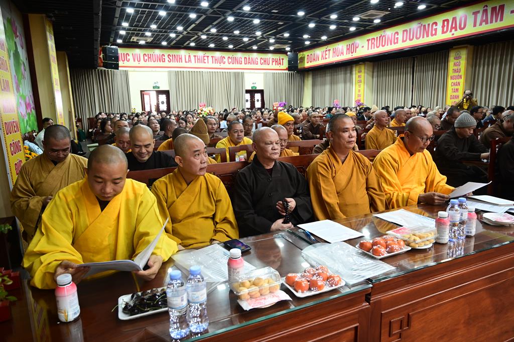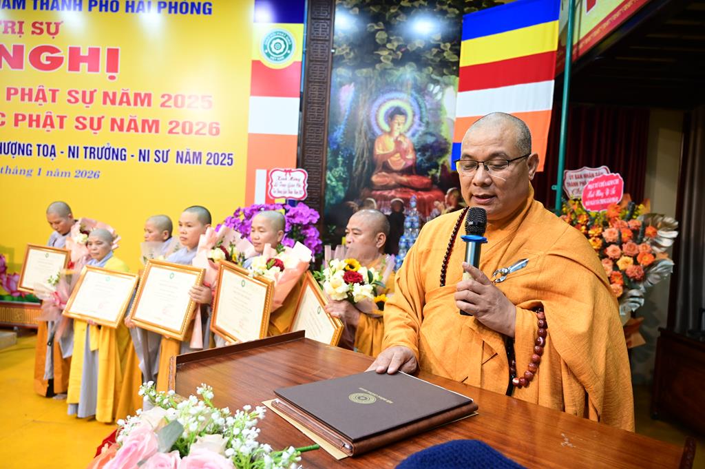 Tiếp theo đó, Thượng tọa Thích Tục Minh, Ủy viên Dự khuyết HĐTS GHPGVN, chánh Thư ký BTS GHPGVN thành phố Hải Phòng đã lên Báo cáo tóm tắt Tổng kết công tác Phật sự năm 2025 và Phương hướng hoạt động Phật sự năm 2026. Theo đó, sau khi sáp nhập cơ học giữa Ban trị sự GHPGVN thành phố Hải Phòng và Ban trị sự GHPGVN tỉnh Hải Dương, thành phố Hải Phòng hiện có tổng số 1.075 Tăng Ni, 1.782 ngôi chùa, trong đó có 740 ngôi chùa hiện đang chưa có nhà sư trụ trì, 71 ngôi chùa được công nhận di tích lịch sử cấp Quốc gia, 170 ngôi chùa và cụm di tích đình chùa là di tích lịch sử cấp thành phố. Đặc biệt, chùa Côn Sơn – Thanh Mai di tích lịch sử cấp Quốc gia đặc biệt, vừa được tổ chức Giáo dục, Khoa học và Văn hóa Liên Hợp Quốc (UNESCO) ghi danh là di sản thế giới trong quẩn thể Di tích danh thắng Yên tử.