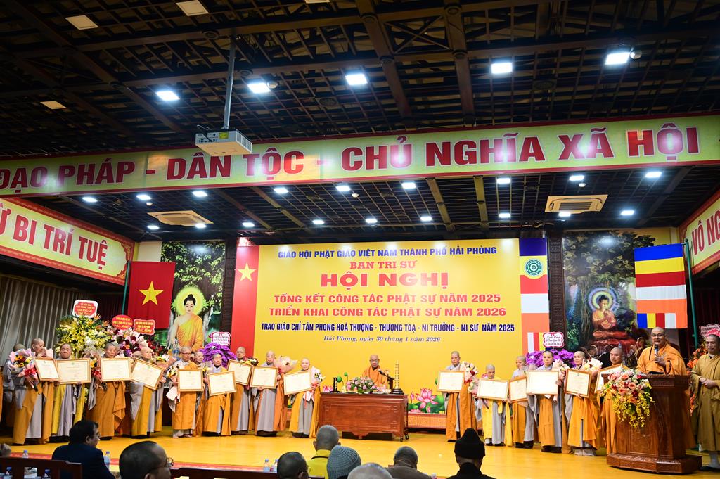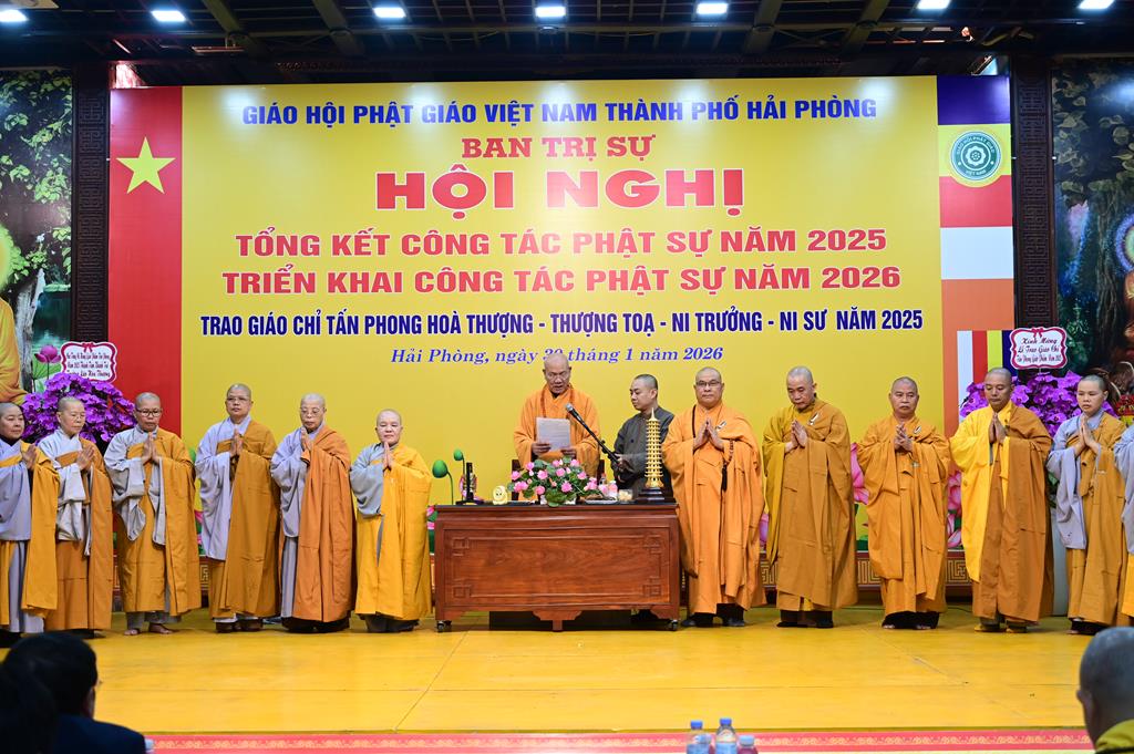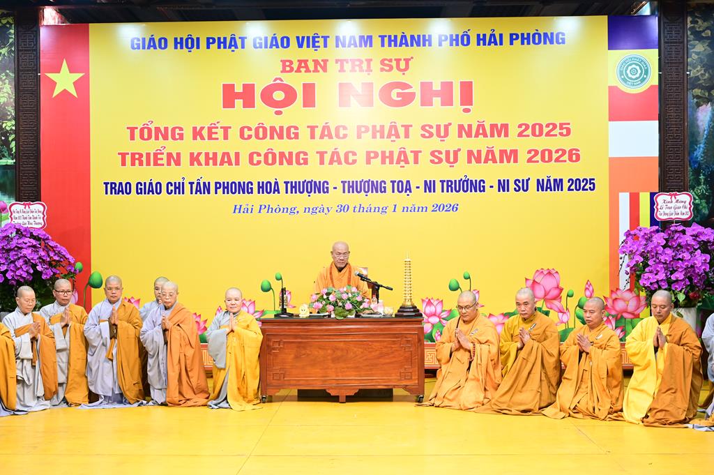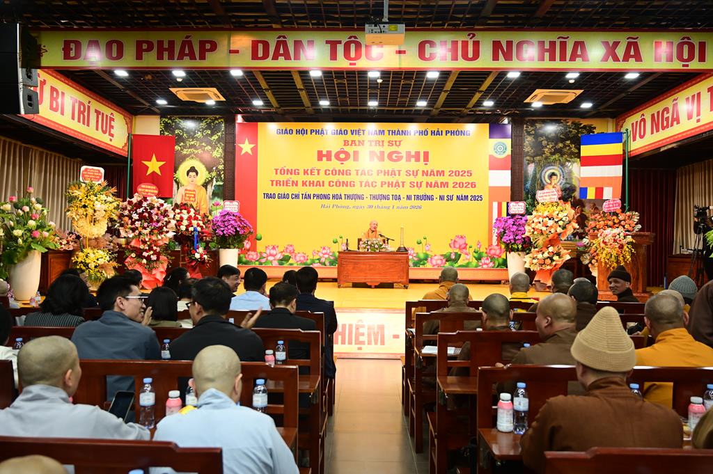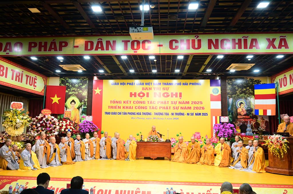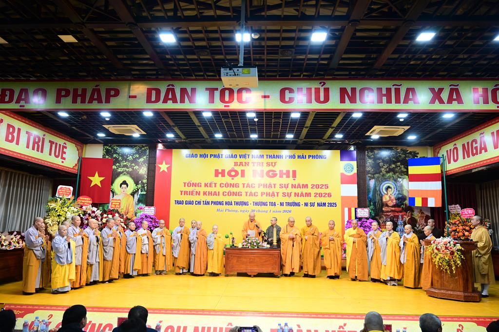 Chiều ngày 30/01/2026 (Nhằm ngày 12 tháng Chạp năm Ất tỵ), tại chùa Nam Hải (Trụ sở Ban trị sự GHPGVN thành phố Hải Phòng), số 197 phố Hai Bà Trưng, phường Lê Chân, thành phố Hải Phòng đã long trọng diễn ra Hội nghị tổng kết công tác Phật sự năm 2025, đề ra phương hướng hoạt động năm 2026 và Trao giáo chỉ tấn phong hàng giáo phẩm Hòa thượng, Thượng Tọa, Ni trưởng, Ni sư cho chư tôn đức Tăng Ni trong thành phố.