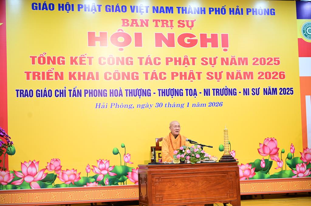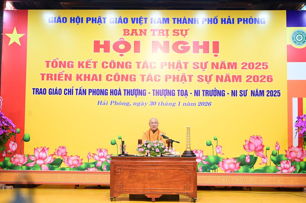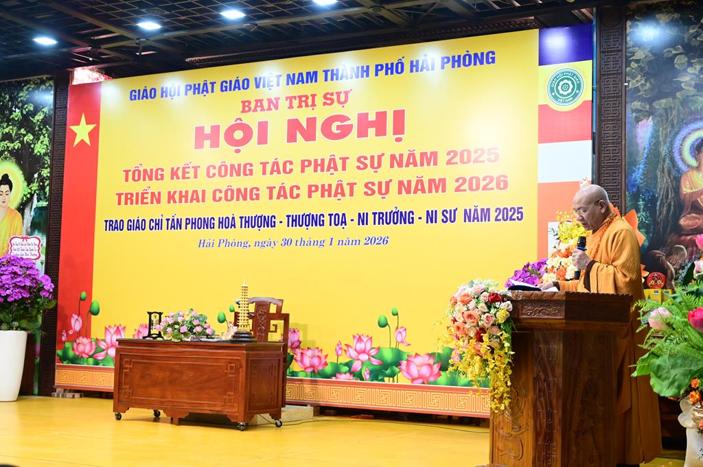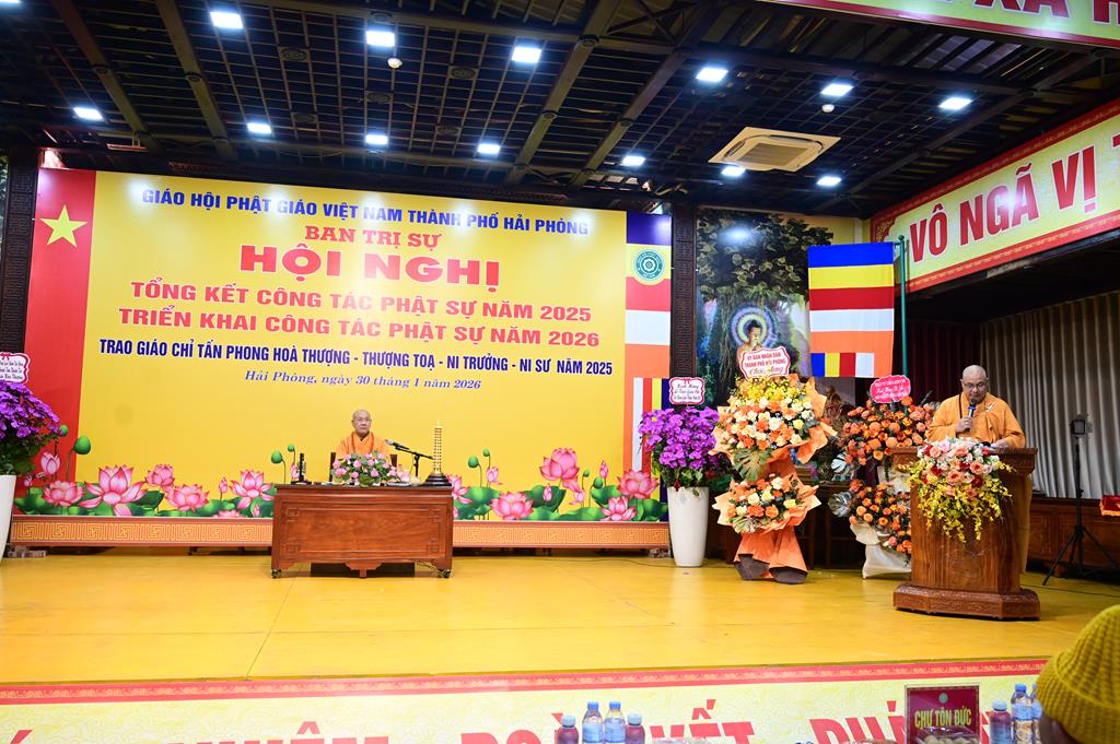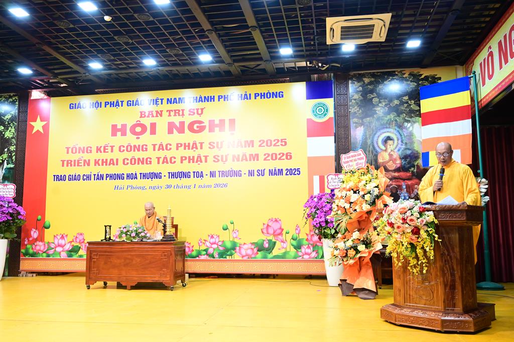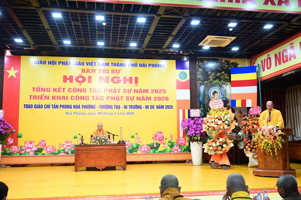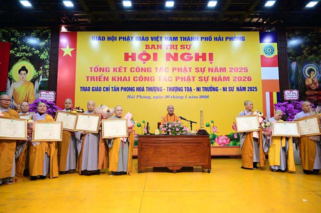 Chiều ngày 30/01/2026 (Nhằm ngày 12 tháng Chạp năm Ất tỵ), tại chùa Nam Hải (Trụ sở Ban trị sự GHPGVN thành phố Hải Phòng), số 197 phố Hai Bà Trưng, phường Lê Chân, thành phố Hải Phòng đã long trọng diễn ra Hội nghị tổng kết công tác Phật sự năm 2025, đề ra phương hướng hoạt động năm 2026 và Trao giáo chỉ tấn phong hàng giáo phẩm Hòa thượng, Thượng Tọa, Ni trưởng, Ni sư cho chư tôn đức Tăng Ni trong thành phố.