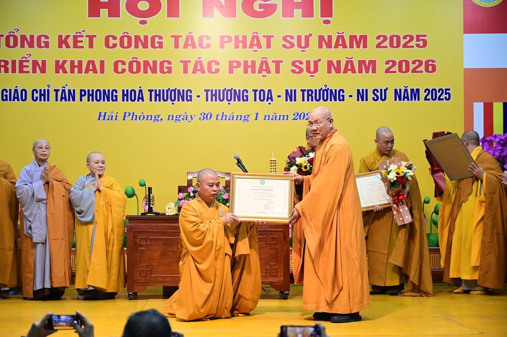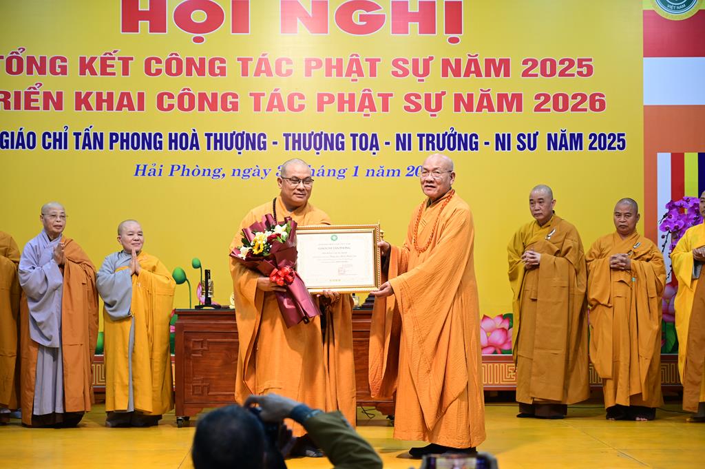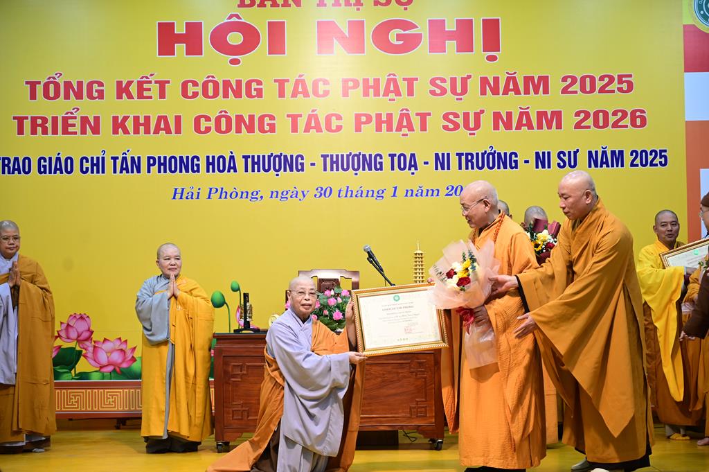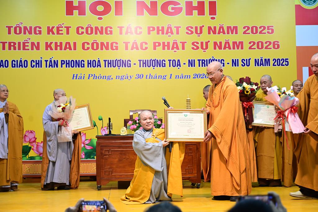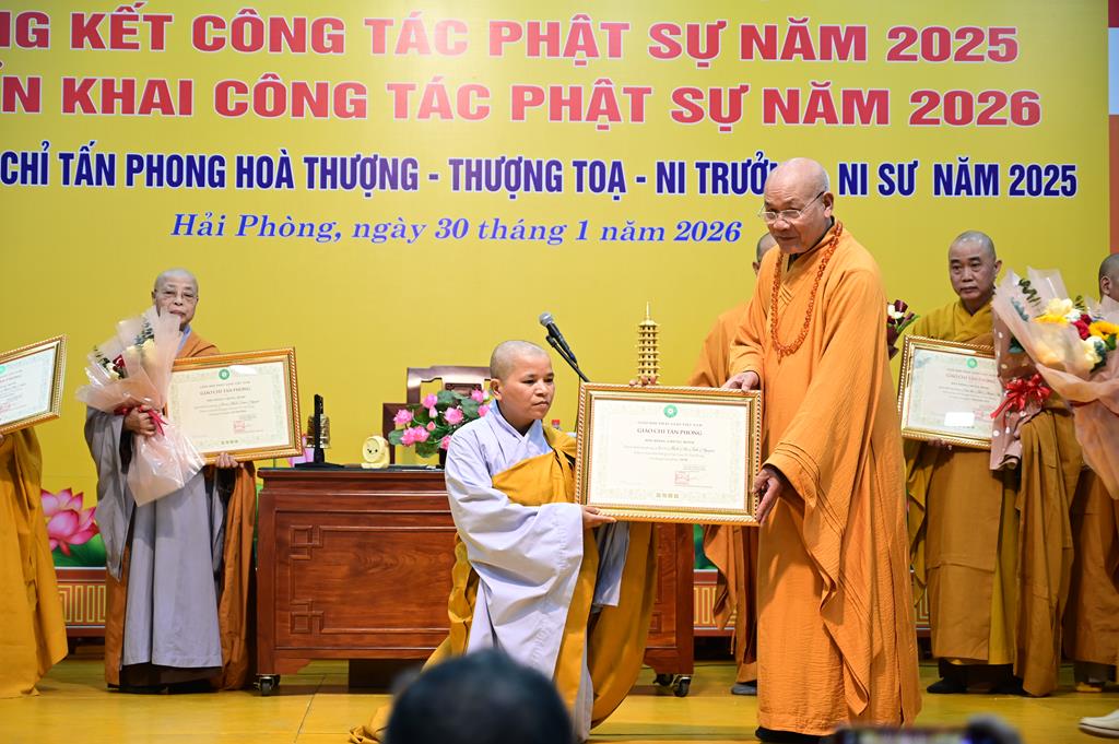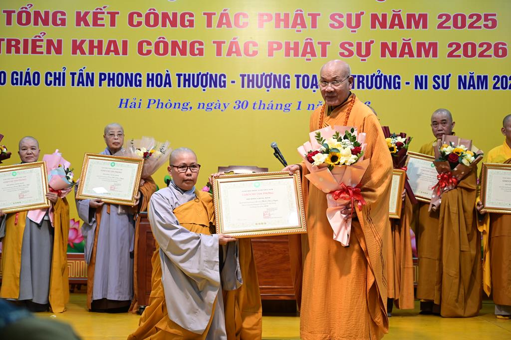 Chiều ngày 30/01/2026 (Nhằm ngày 12 tháng Chạp năm Ất tỵ), tại chùa Nam Hải (Trụ sở Ban trị sự GHPGVN thành phố Hải Phòng), số 197 phố Hai Bà Trưng, phường Lê Chân, thành phố Hải Phòng đã long trọng diễn ra Hội nghị tổng kết công tác Phật sự năm 2025, đề ra phương hướng hoạt động năm 2026 và Trao giáo chỉ tấn phong hàng giáo phẩm Hòa thượng, Thượng Tọa, Ni trưởng, Ni sư cho chư tôn đức Tăng Ni trong thành phố.