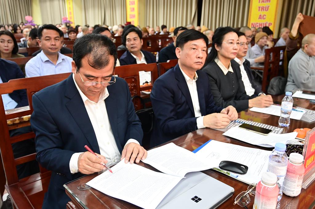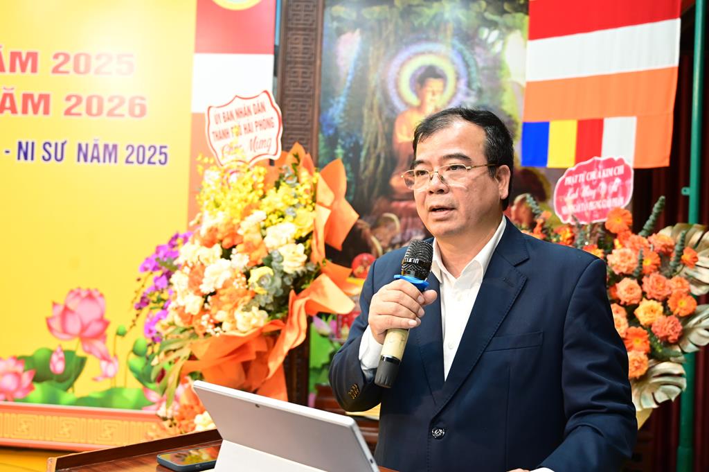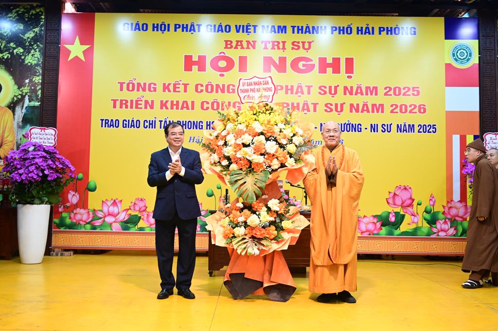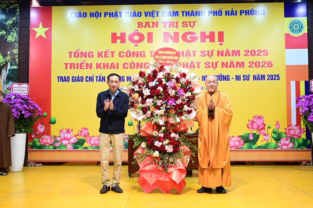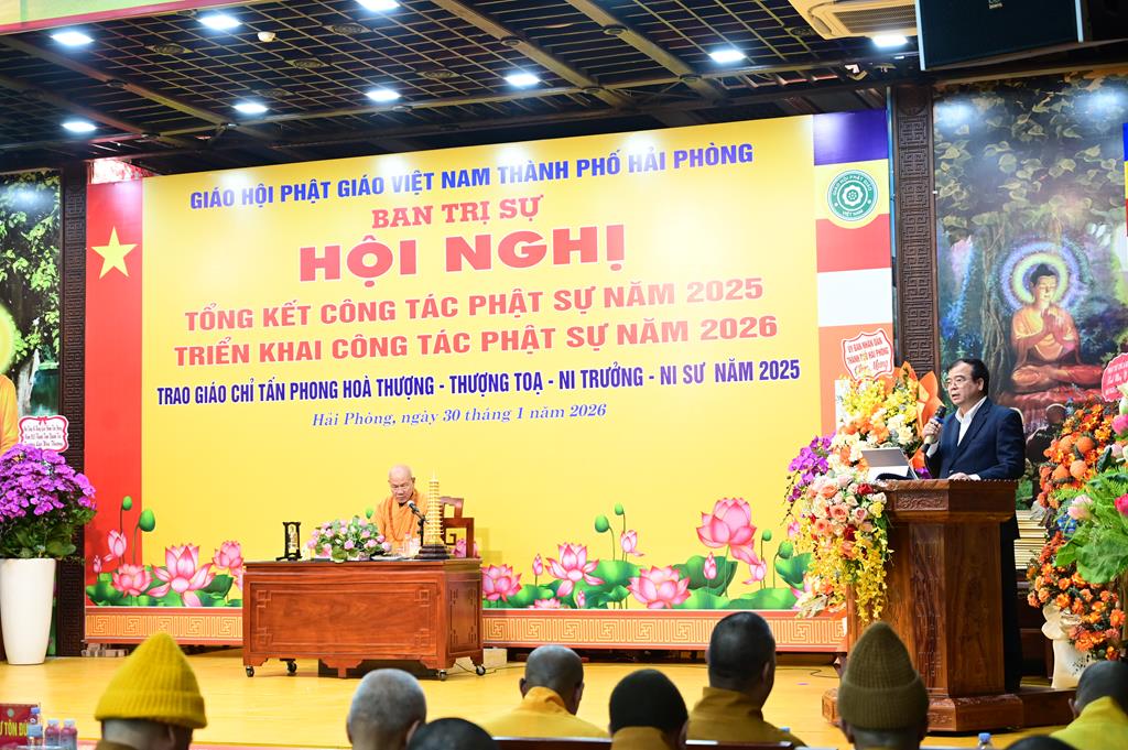 Phát biểu tại Hội nghị, ông: Nguyễn Minh Hùng, Thành Ủy viên, Phó Chủ tịch UBND thành phố Hải Phòng đánh giá cao những thành tựu mà Ban trị sự GHPGVN thành phố Hải Phòng nỗ lực phấn đấu hoàn thành trong năm vừa qua, đặc biệt sau khi sáp nhập đơn vị hành chính 2 cấp, BTS GHPGVN thành phố Hải Phòng và BTS GHPGVN tỉnh Hải Dương đã kiện toàn nhân sự nhanh chóng và tiếp tục đi vào hoạt động theo đúng chỉ đạo của Trung ương Giáo hội, hoàn thành xuất sắc các hoạt động Phật sự trong năm 2025, với công tác từ thiện, an sinh xã hội đạt hơn 72 tỷ đồng. Ông hy vọng thời gian tới, Ban trị sự GHPGVN thành phố tiếp tục phát huy những thành tựu đã đạt được, phát huy truyền thống đoàn kết, đạo pháp dân tộc chủ nghĩa xã hội để để hoàn thành tốt phương hướng hoạt động Phật sự trong năm 2026 mà Hội nghị đã đề ra.