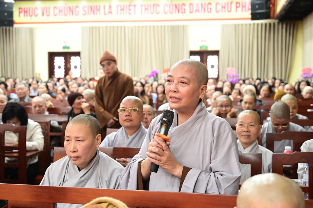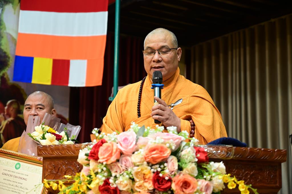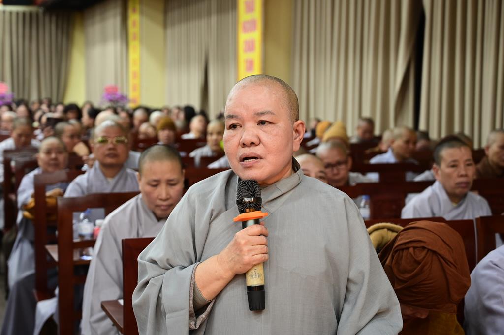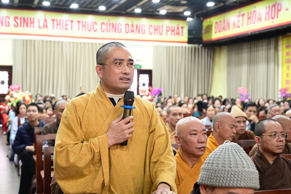 Đại đức Thích Quảng Thuyết, phó chánh văn phòng BTS GHPGVN thành phố phát biểu ý kiến
