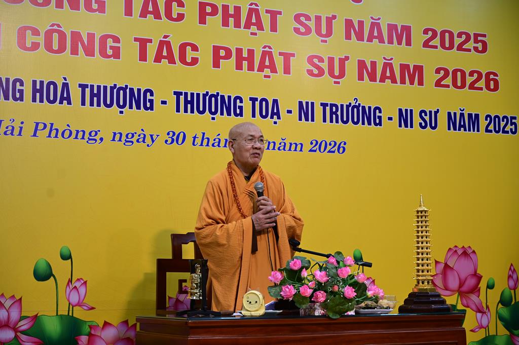 Phát biểu khai mạc Hội nghị, Hòa thượng Thích Quảng Tùng nhấn mạnh, kể từ khi hai Ban trị sự GHPGVN tỉnh Hải Dương và thành phố Hải Phòng được sáp nhập, các hoạt động Phật sự tiếp tục được duy trì ổn định và phát triển theo mô hình 2 cấp; Hội nghị lần này tập trung vào các nội dung như: Đánh giá kết quả hoạt động Phật sự năm 2025 và triển khai các hoạt động Phật sự trọng tâm trong năm 2026. Đặc biệt, chú trọng công tác Phật sự quan trọng đã được Thường trực BTS chủ động xây dựng kế hoạch như: Hội thảo Khoa học kỷ niệm 45 năm thành lập GHPGVN thành phố Hải Phòng; Đại hội Đại biểu Phật giáo thành phố Hải Phòng lần thứ I (nhiệm kỳ 2026-2031); Kế hoạch tổ chức Đại lễ Phật đản, An cư kiết hạ PL.2570, công tác chuyển đổi số trong thống kê Tăng Ni, Phật tử trên toàn thành phố; Các nội dung công tác hành chính Giáo hội cần triển khai và các Phật sự hàng tháng, các hoạt động Phật sự hướng tới chào mừng Đại hội Đại biểu Phật giáo toàn quốc lần thứ X nhiệm kỳ 2026 –2031.