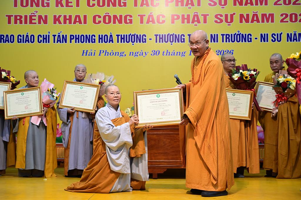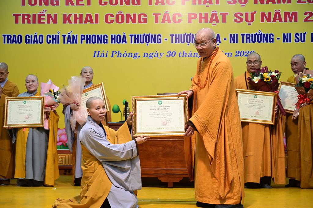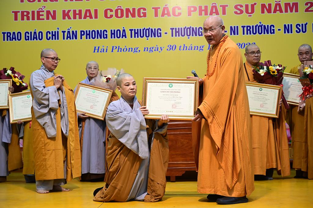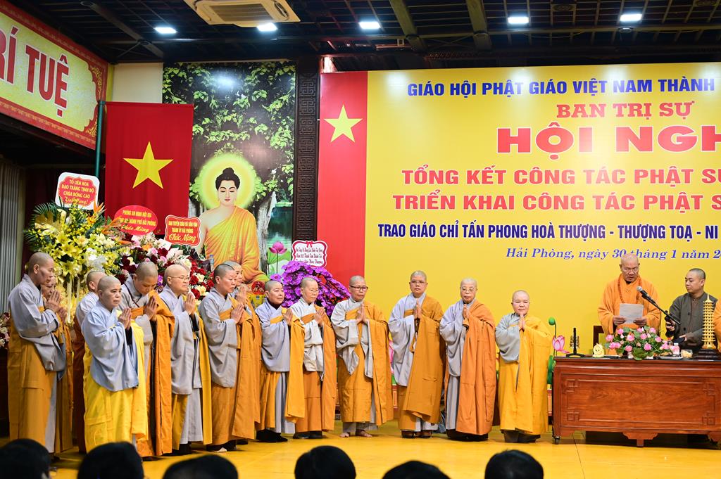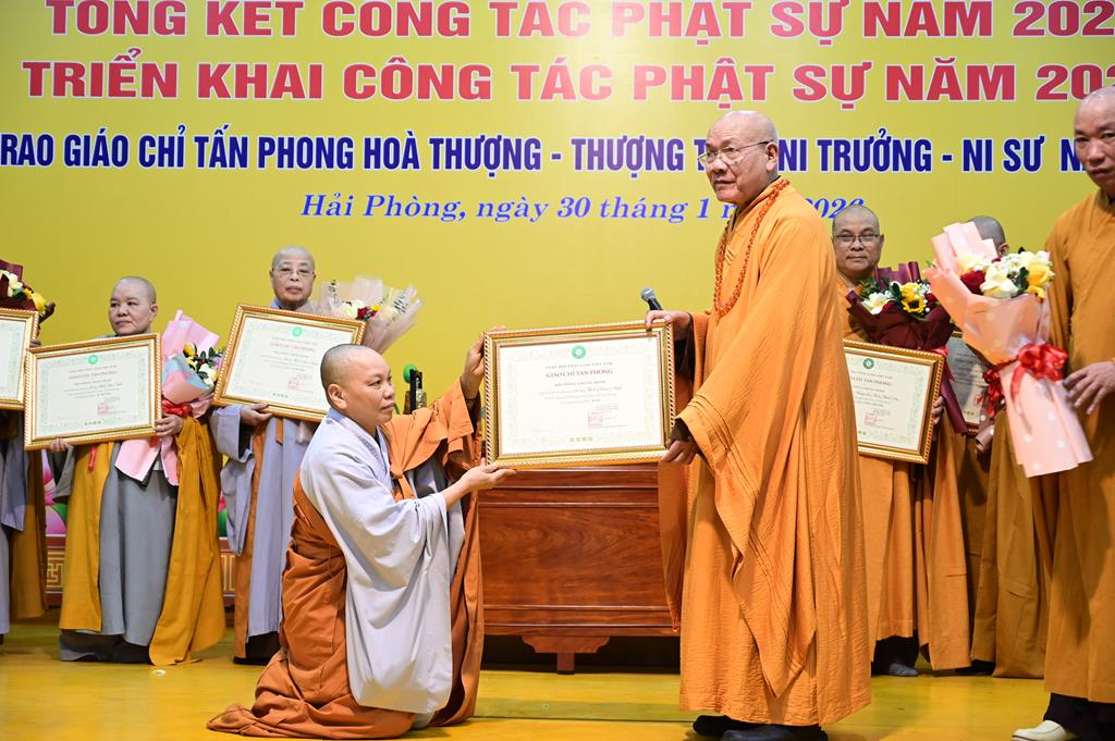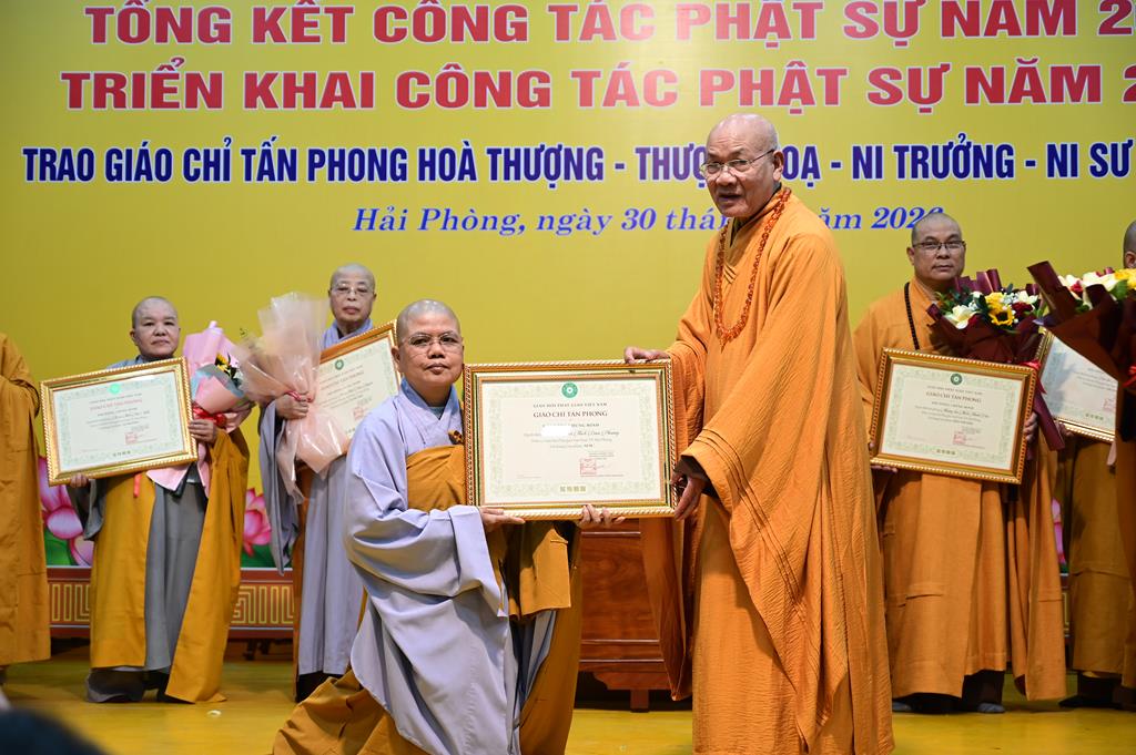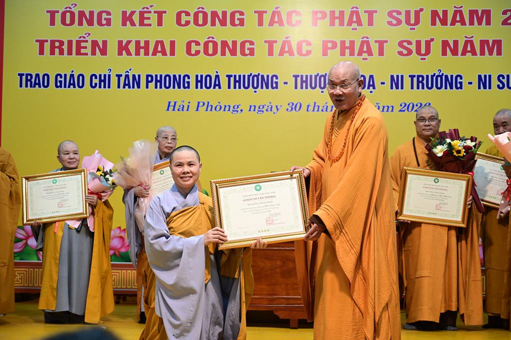 Dịp này, Thượng tọa Thích Thanh Tuấn, Chánh Văn phòng BTS GHPGVN thành phố Hải Phòng đã lên công bố Quyết định về việc tấn phong hàng giáo phẩm Hòa thượng, Thượng tọa, Ni trưởng, Ni sư của Hội đồng chứng minh GHPGVN thông qua tại Đại nghị lần thứ III và được Đức Pháp chủ GHPGVN ấn ký, ban hành cho tổng số 27 vị thuộc đơn vị GHPGVN thành phố Hải Phòng, bao gồm 01 Hòa thượng, 03 Thượng tọa, 04 Ni trưởng và 19 Ni sư. Thừa lệnh của Đại lão Hòa thượng Thích Trí Quảng, Đức Pháp chủ GHPGVN, Hòa thượng Thích Quảng Tùng đã trao Giáo chỉ tấn phong đến chư tôn đức Tăng Ni được HĐCM tấn phong trong dịp này.