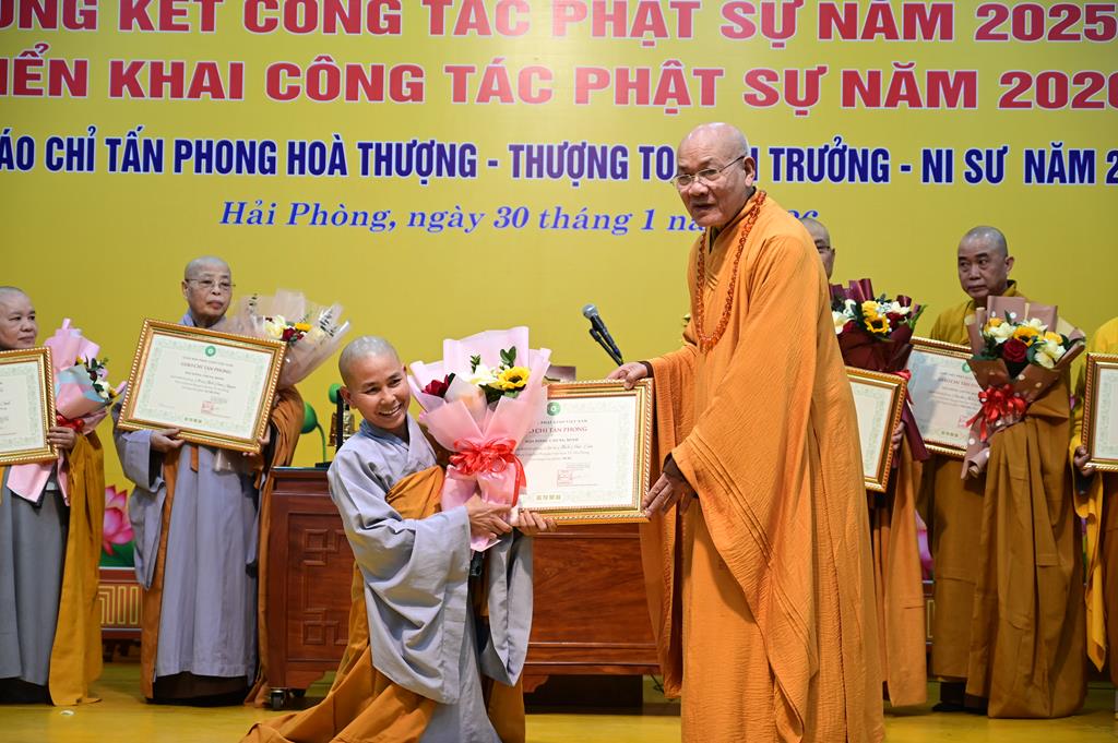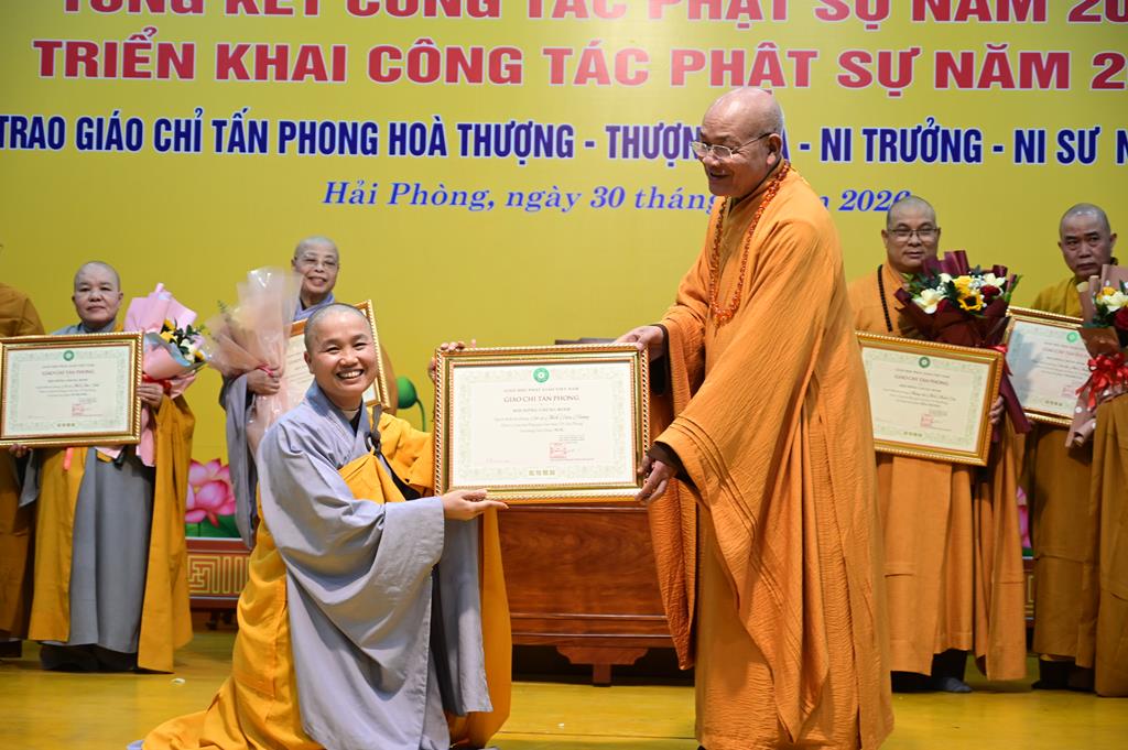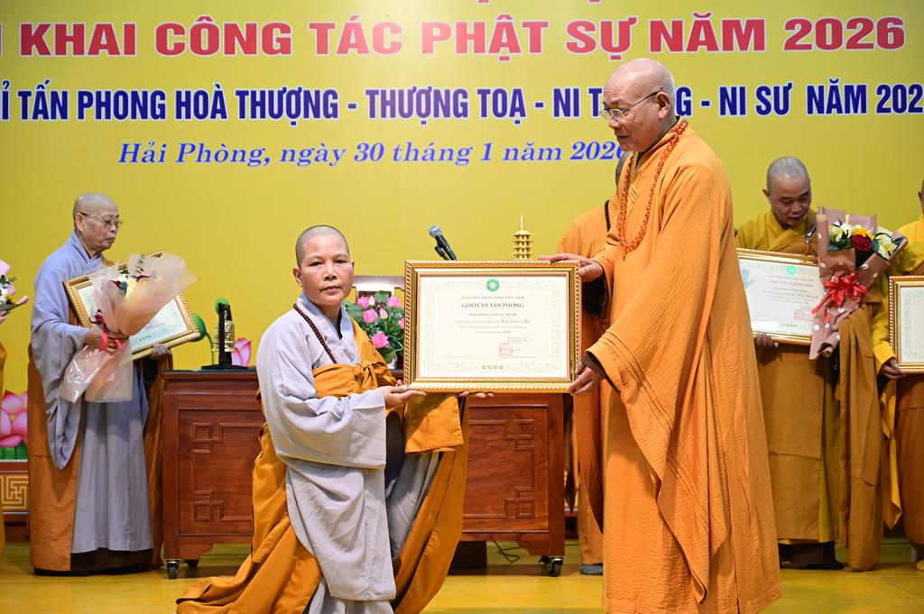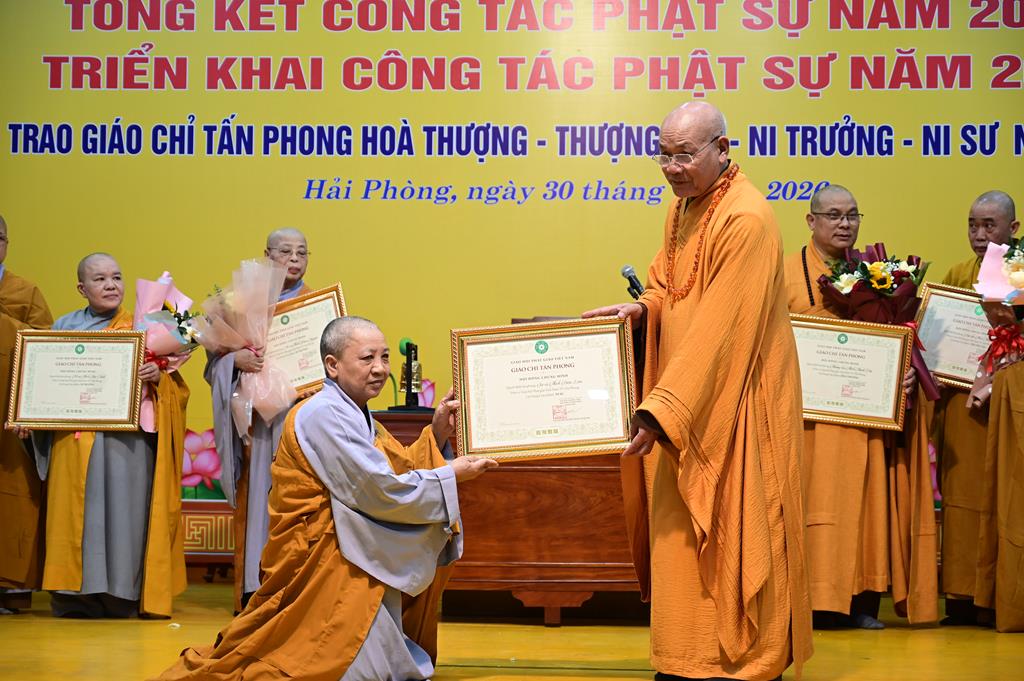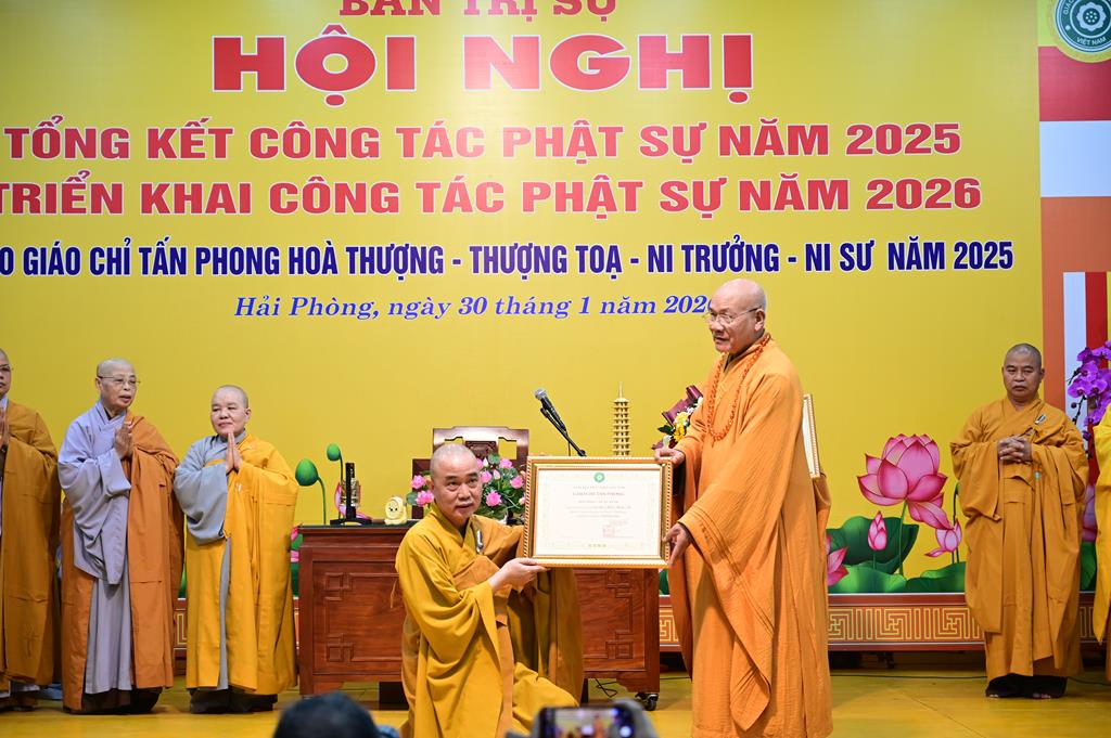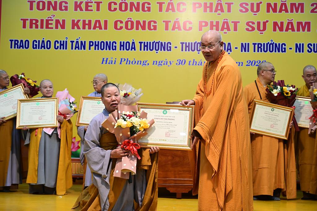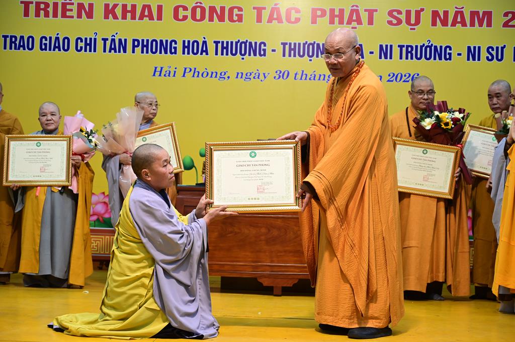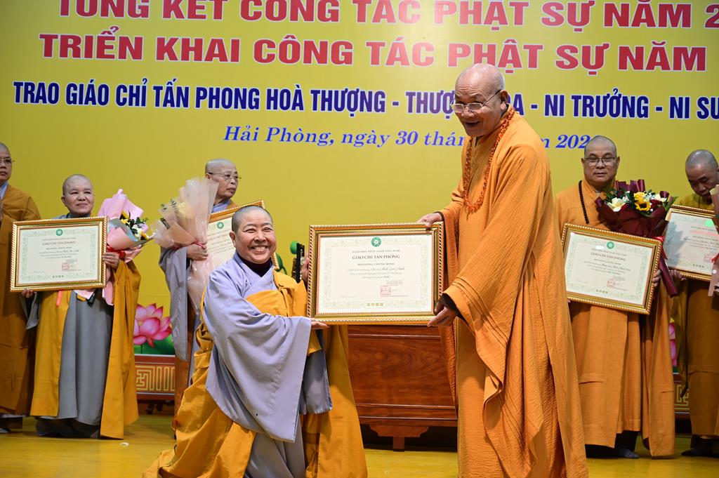 Dịp này, Thượng tọa Thích Thanh Tuấn, Chánh Văn phòng BTS GHPGVN thành phố Hải Phòng đã lên công bố Quyết định về việc tấn phong hàng giáo phẩm Hòa thượng, Thượng tọa, Ni trưởng, Ni sư của Hội đồng chứng minh GHPGVN thông qua tại Đại nghị lần thứ III và được Đức Pháp chủ GHPGVN ấn ký, ban hành cho tổng số 27 vị thuộc đơn vị GHPGVN thành phố Hải Phòng, bao gồm 01 Hòa thượng, 03 Thượng tọa, 04 Ni trưởng và 19 Ni sư. Thừa lệnh của Đại lão Hòa thượng Thích Trí Quảng, Đức Pháp chủ GHPGVN, Hòa thượng Thích Quảng Tùng đã trao Giáo chỉ tấn phong đến chư tôn đức Tăng Ni được HĐCM tấn phong trong dịp này.