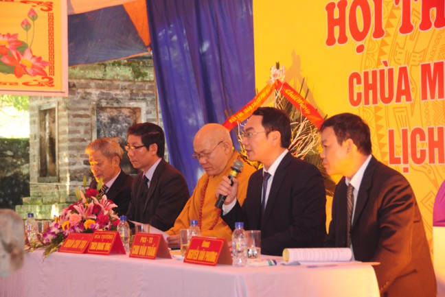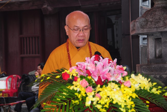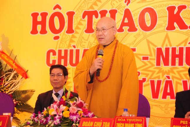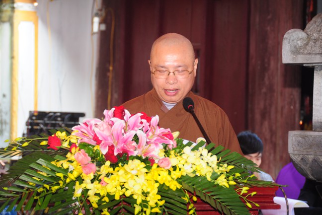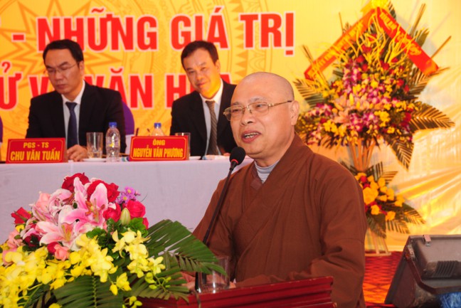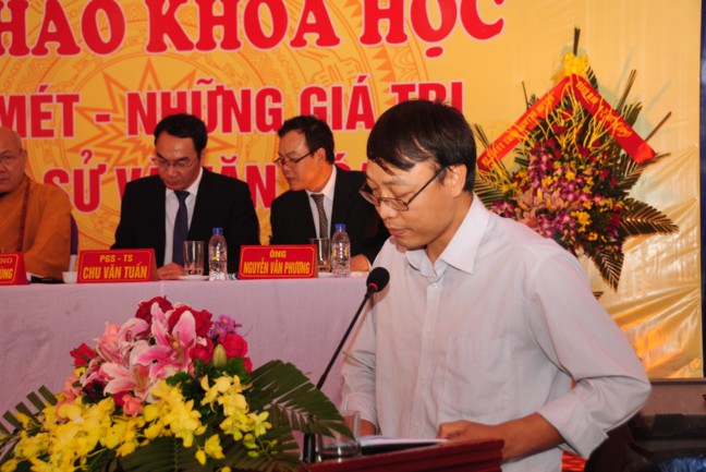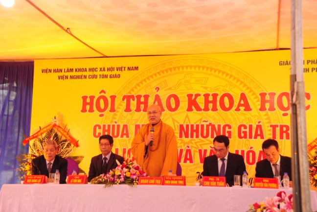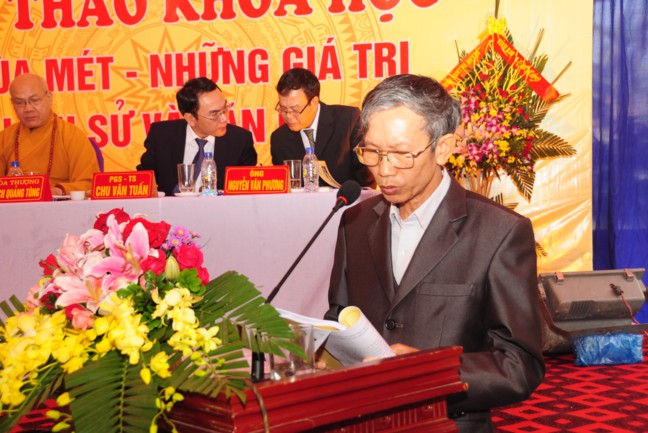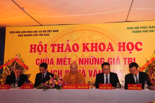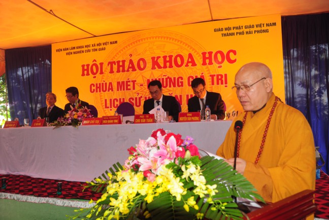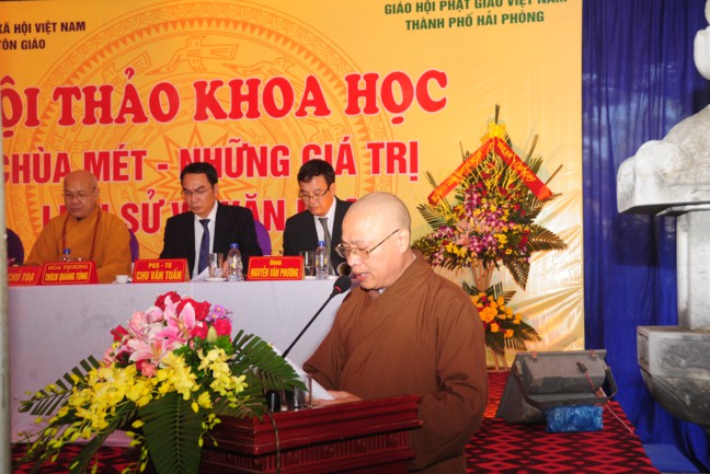 Thay mặt cho đoàn chủ tọa, HT. Thích Quảng Tùng đã lên tuyên đọc diễn văn khai mạc Hội thảo Chùa Mét – Những giá trị lịch sử văn hóa. Chùa Mét được xây dựng từ thời Hậu Trần trên khu vực rừng Mét xưa nay thuộc thôn Lê Lợi, xã Cổ Am, huyện Vĩnh Bảo. Theo văn bia để lại, chùa Mét do cụ Trần Khắc Trang – Vị tướng thời Trần, thủy tổ dòng họ Trần ở Cổ Am xây dựng. Ban đầu chỉ là ngôi chùa nhỏ có tên là “ Hương tản tự”, sau đổi tên thành “ Thiên Hương Tự”. Ngoài ý nghĩa về mặt tâm linh, chùa Mét còn có ý nghĩa về mặt giáo dục. Đây chính là ngôi trường đầu tiên của trạng trình Nguyễn Bỉnh Khiêm – Một danh nhân văn hóa của nước ta vào thế kỷ XVI và thầy dạy học của Nguyễn Tất Đạt ( tức Nguyễn Bỉnh Khiêm) – Ông Trần Ông Sóc là nhà sư của chùa và cũng là sự mở đầu cho truyền thống hiếu học của người dân Cổ Am, Vĩnh Bảo. Nhằm làm rõ lịch sử của Phật giáo Hải Phòng, những dấu ấn, ảnh hưởng của Phật giáo thời Trần đối với những danh nhân văn hóa như trạng trình Nguyễn Bỉnh Khiêm và vùng đất Hải Phòng. Đồng thời phát huy giá trị di sản văn hóa Phật giáo Hải Phòng, xây dựng không gian văn hóa, đời sống tâm linh của người dân Hải Phòng hiện nay, GHPGVN thành phố Hải Phòng phối hợp với Viện nghiên cứu tôn giáo thuộc Viện Hàn lâm Khoa học xã hội Việt Nam tổ chức Hội thảo khoa học: “ Chùa Mét – Những giá trị lịch sử văn hóa”.