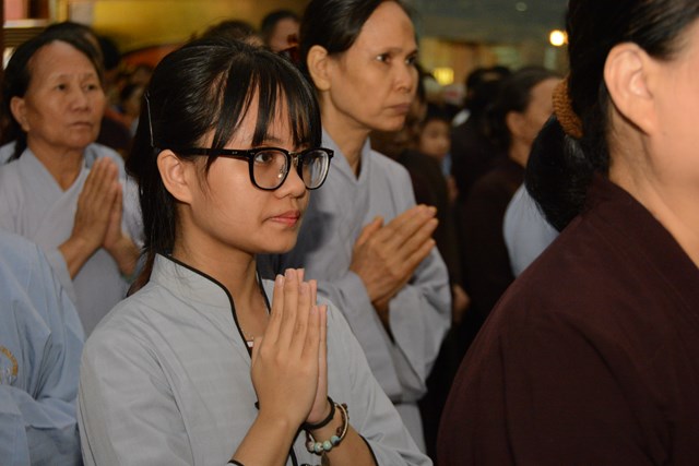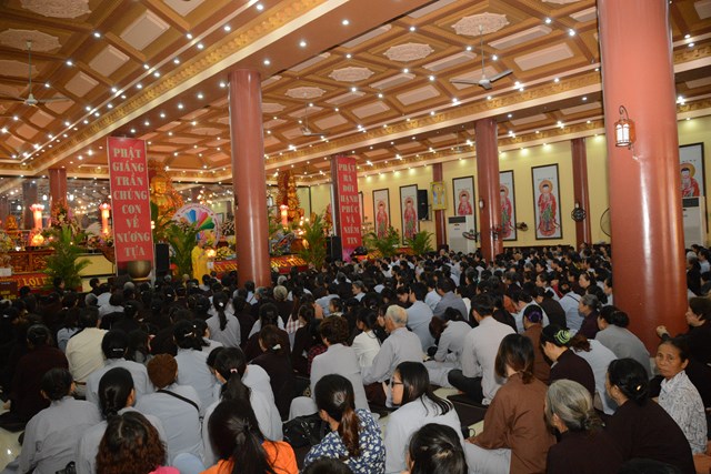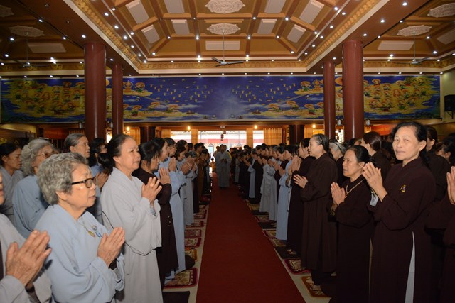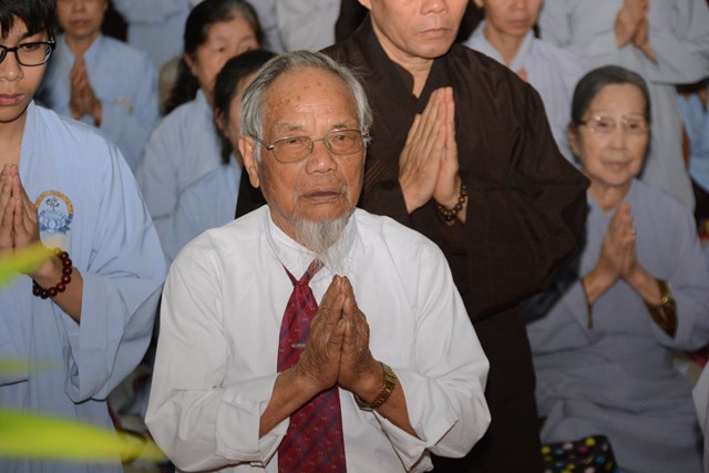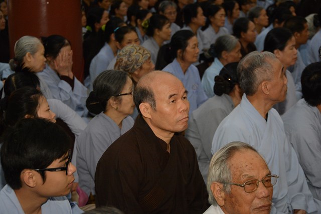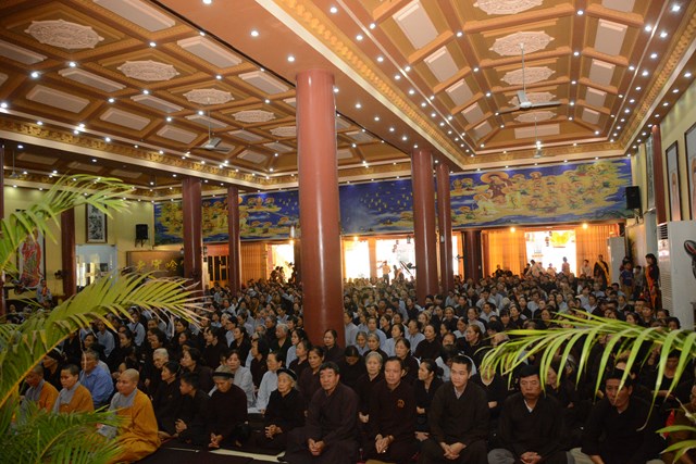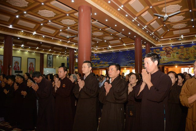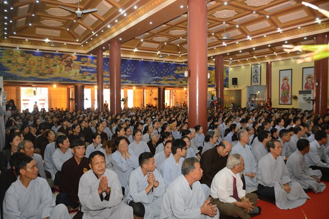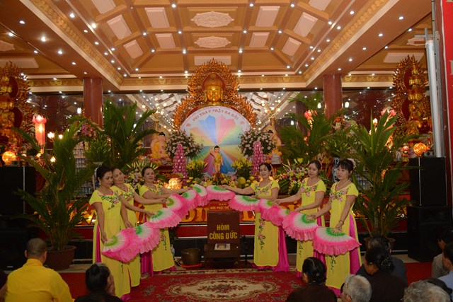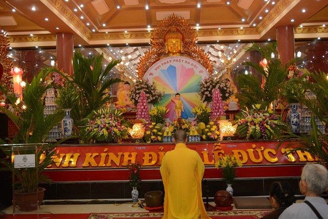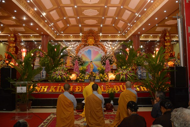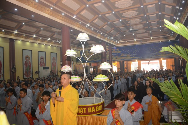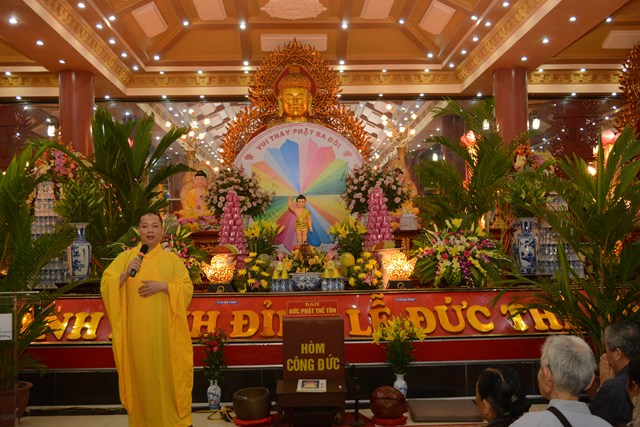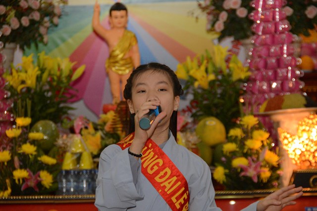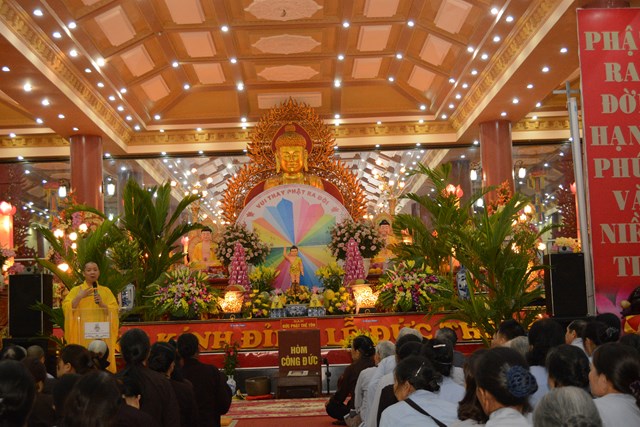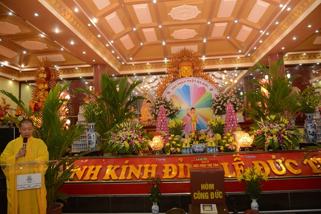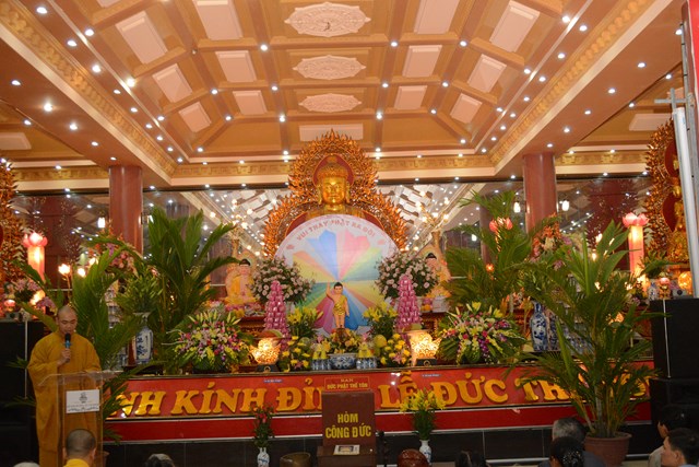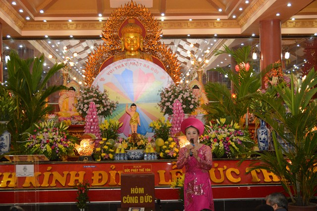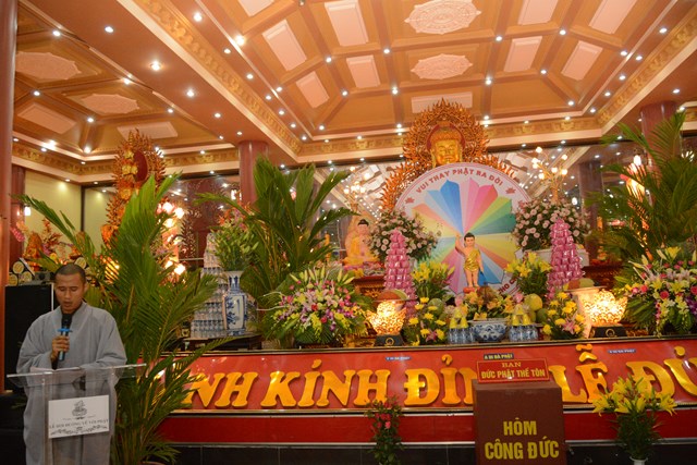 Đúng 9h sáng cùng ngày, buổi lễ hành chính kỷ niệm ngày đức Phật Thích Ca đản sinh PL. 2561 – DL. 2017 đã được chính thức diễn ra trong niềm hân hoan, phấn khởi khi tại thế giới Ta Bà này có một bậc thánh nhân siêu phàm, xuất chúng thị hiện tại cõi Sa Bà này để cứu độ cho nhân loại thoát khỏi khổ đau. Sau nghi thức niệm Phật cầu gia bị, Đại đức Thích Giác Hảo – Trưởng BTC đại lễ đã lên cung tuyên thông điệp Phật đản PL. 2561 – DL. 2017 của Đức pháp chủ GHPGVN, trưởng lão Hòa thượng Thích Phổ Tuệ, toàn thể đại chúng đã trang nghiêm, thành kính khởi thân đứng dậy chắp tay hình búp sen nhìn lên Phật đài để lắng đọng tâm tư đón nghe bức thông điệp kính mừng Phật đản PL.2561 – DL. 2017 đầy ý nghĩa của trưởng lão Hòa thượng Pháp chủ GHPGVN – HT. ThícH Phổ Tuệ nhân dịp mùa Phật đản đã về.