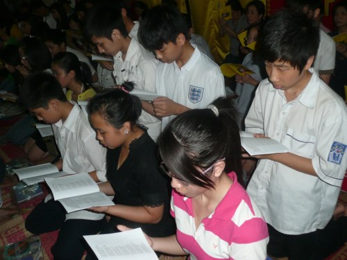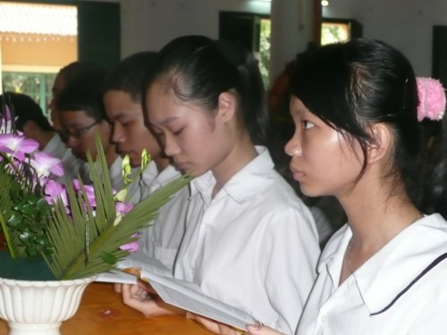 Các em học sinh nộp thẻ đăng ký, chấp tay thành kính nguyện cầu dưới sự hướng dẫn của các quý thầy.