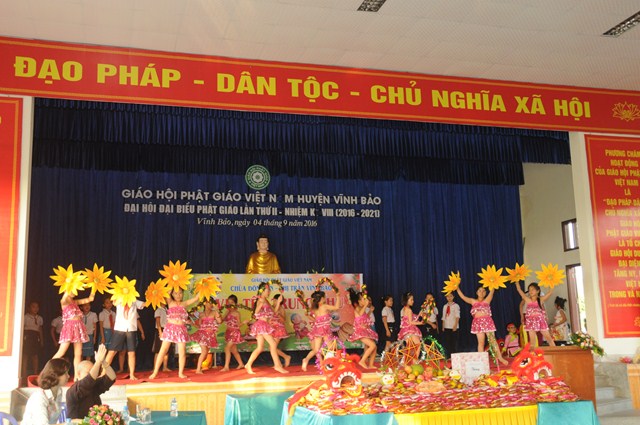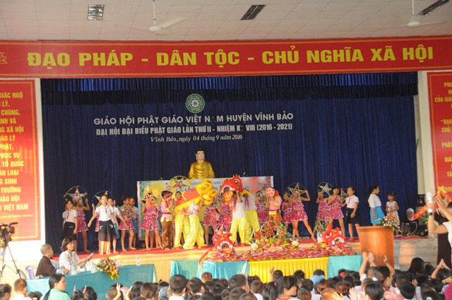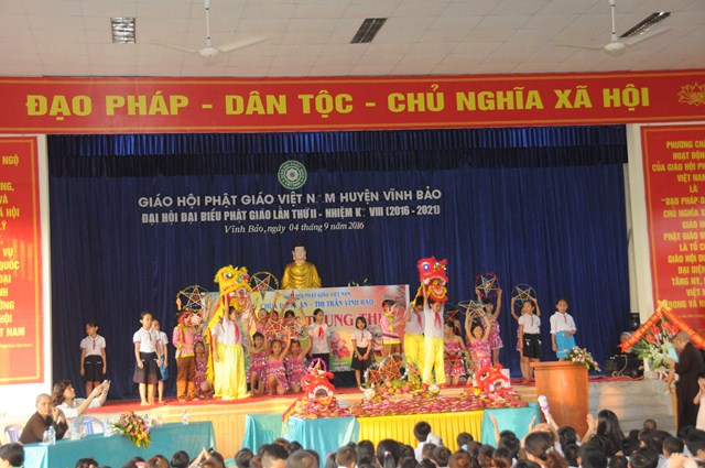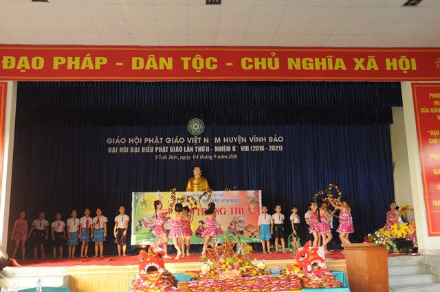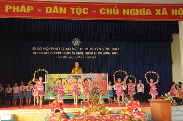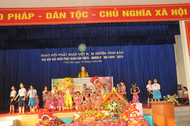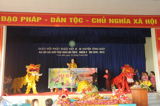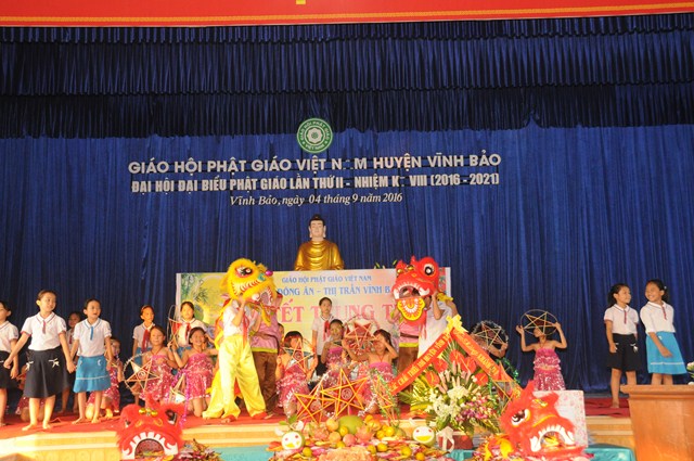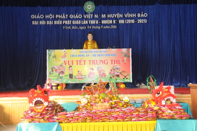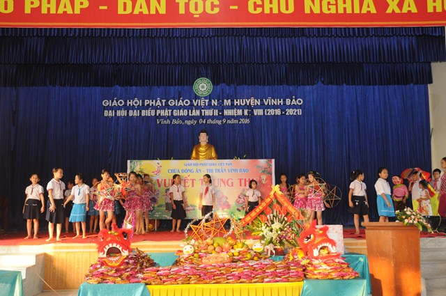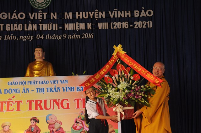 Quang lâm và tham dự Đêm hội trăng rằm về phía Giáo hội có sự hiện diện của TT. Thích Thanh Giác – Phó trưởng Ban thường trực Ban Hoằng Pháp TƯ GHPGVN, phó trưởng Ban thường trực Ban trị sự GHPGVN Tp. Hải Phòng, trưởng Ban trị sự GHPGVN huyện Vĩnh Bảo, Ni Sư Thích Diệu Tâm – Ủy viên BTS GHPGVN Tp. Hải Phòng, Phó Ban trị sự GHPGVN huyện Vĩnh Bảo, trụ trì chùa Đông Ân ( Chùa Đông Tạ), thôn Đông Tạ, thị trấn Vĩnh Bảo, huyện Vĩnh Bảo, Tp. Hải Phòng cùng chư tôn đức Tăng Ni huyện Vĩnh Bảo và hơn 700 cháu thiếu nhi đang học tập tại trưởng tiểu học thị trấn.
