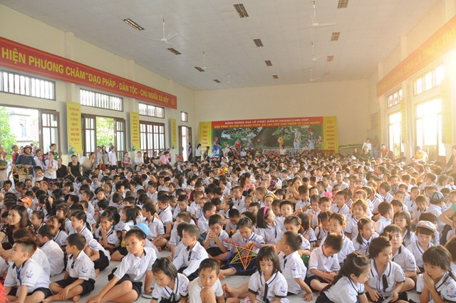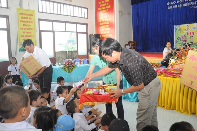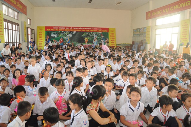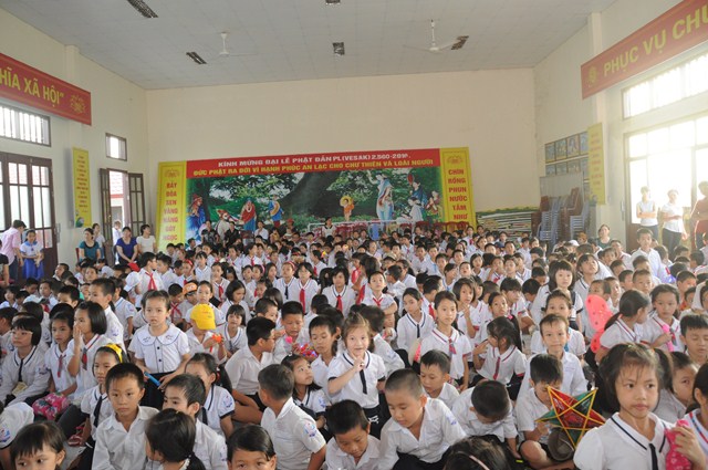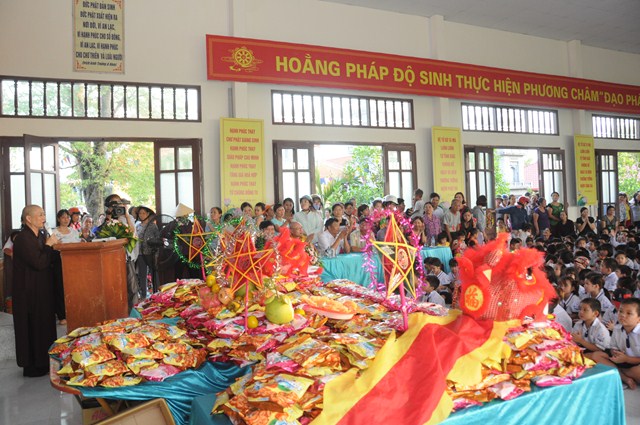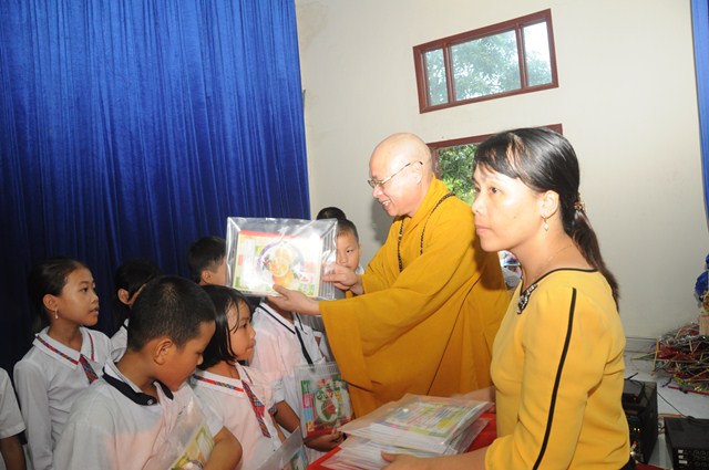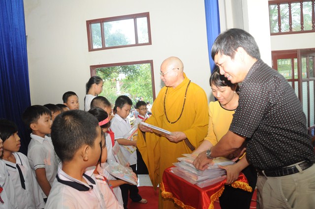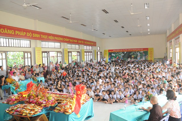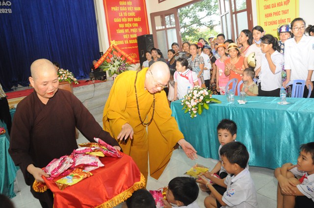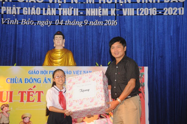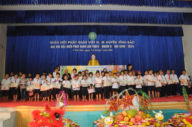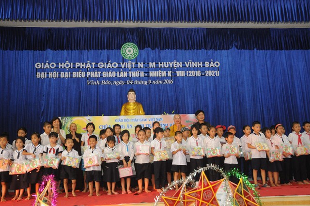 Nhân dịp này, thay mặt cho BTS GHPGVN huyện Vĩnh Bảo, TT. Thích Thanh Giác đã trao hơn 50 phần quà cho học sinh nghèo vượt khó, có hoàn cảnh khó khăn đang học tập tại trường tiểu học thị trấn nhằm động viên, khích lệ các cháu về mặt tinh thần, giúp các cháu phần nào vơi bớt những khó khăn trong cuộc sống, đón một cái tết trung thu đầy ý nghĩa.