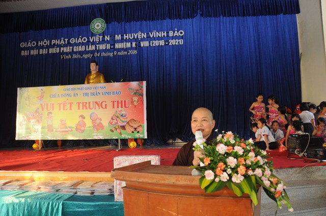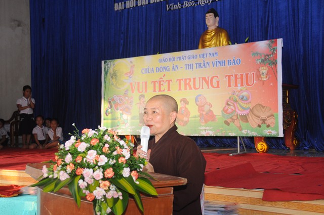 Trước khi chính thức bước vào chương trình, Ni Sư Thích Diệu Tâm – Phó ban trị sự GHPGVN huyện Vĩnh Bảo đã lên phát biểu khai mạc, trong bài phát biểu của mình, Ni Sư đã nhấn mạnh sự quan tâm của Giáo hội đến các cháu thiếu niên nhi đồng và việc tổ chức tết trung thu cho các cháu tại chùa Đông Ân đã được BTS GHPGVN huyện Vĩnh Bảo duy trì từ nhiều năm nay với số lượng các cháu thiếu niên nhi đồng tham gia ngày càng đông, đây cũng là một tín hiệu đáng mừng cho Phật giáo huyện Vĩnh Bảo. Đồng thời Ni sư cũng gửi lời chúc tới các cháu đón một cái tết trung thu thật vui vẻ và ý nghĩa.