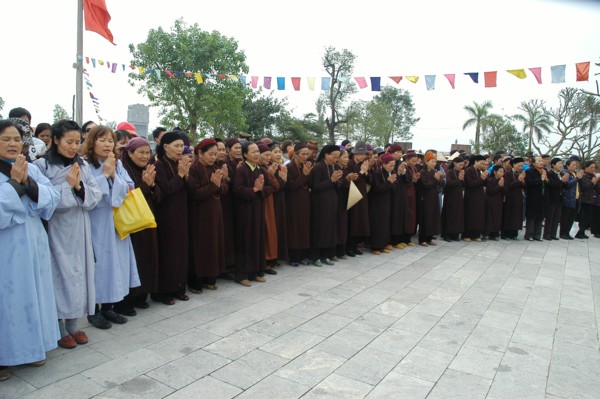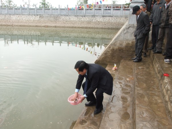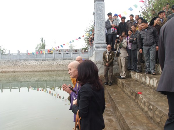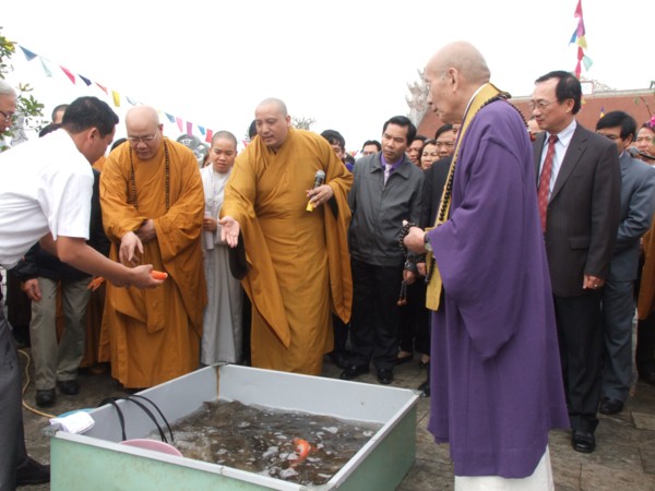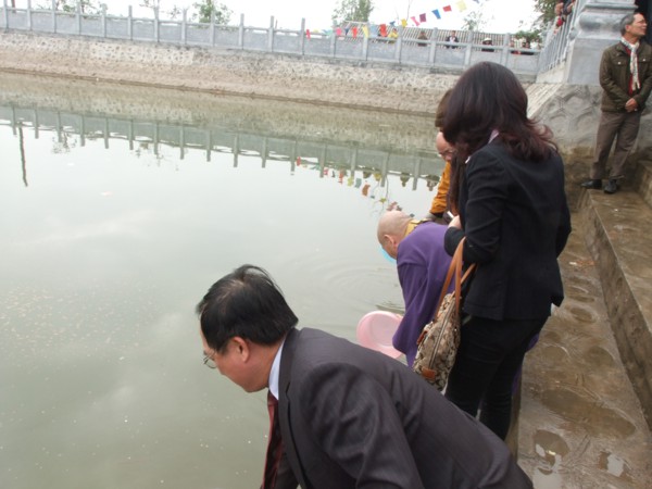 Trước khi buổi lễ trồng cây được diễn ra, Chư tôn đức Tăng cùng bà con Phật tử đã làm lễ cầu nguyện quốc thái dân an và lễ phóng sinh tại sông Văn Úc, huyện Tiên Lãng.