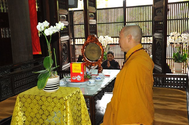 Sau đó là thời pháp thoại của Hòa thượng. Mở đầu thời pháp thoại, Hòa thượng chia sẻ niềm hoan hỷ , ấm lòng bởi “được trở về ngôi chùa Hải Ninh này, nhìn lên bàn thờ Tổ sư, nhìn lên bàn thờ các cụ, chúng tôi hoài niệm về công lao của các Ngài. Chư vị lịch đại Tổ sư đã có một chiều dài lịch sử với sự tồn tại, phát triển của lịch sử Phật giáo Việt Nam trên đất Cảng thân yêu này. Gần đây nhất, giai đoạn cận đại, 2 chị em Cố ni trưởng trụ trì tiền bối Tịnh Nguyệt người ở Sa Đét, nhưng đã ra đây hành đạo và hoằng truyền chính pháp, thắp sáng ngọn đèn từ ở chùa Hải Ninh này. Để rồi lưu lại xá lợi của Hòa thượng người em của sư bà – cố Hòa thượng Khánh Nghiêm. Sau khi Đất nước thống nhất, cố ni trưởng lại trở về miền nam, trong thời gian lưu dấu tại Tổ đình này, cố ni trưởng Tịnh Nguyệt đã tiếp độ được các vị đệ tử mà sau này trở thành các vị ni lớn trụ trì chùa Hải Ninh, chùa Phổ Minh, chùa Đông Khê, chùa Đôn… Các vị ni trưởng, các vị ni sư lớn đã tiếp dòng thiền để khêu đèn chính pháp, đặc biệt trở về Tổ đình đây, nhìn di dung của cố trưởng lão Viện chủ chùa Quan Âm ở tại Paris – Pháp, càng cảm niệm công đức của quý Ngài hơn.