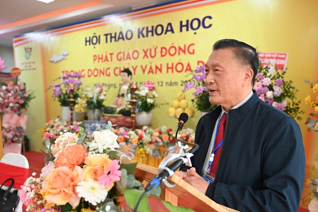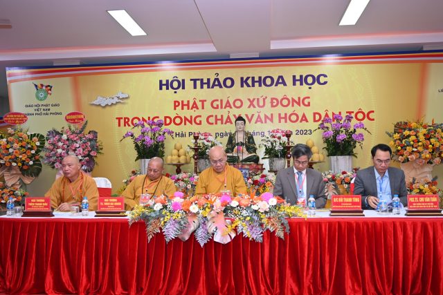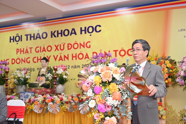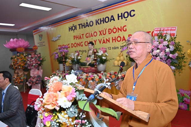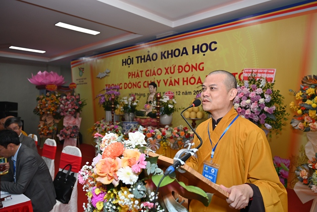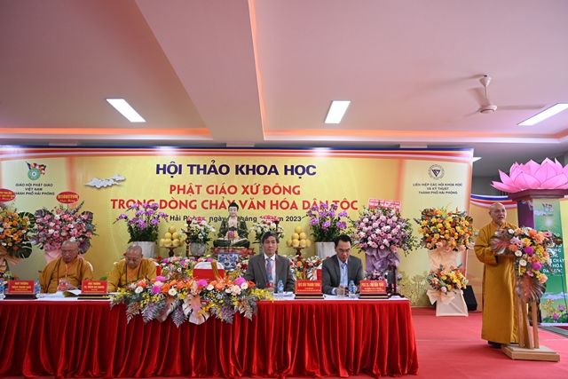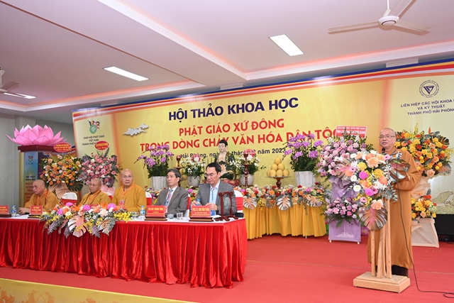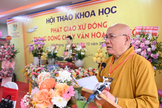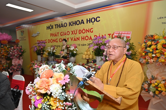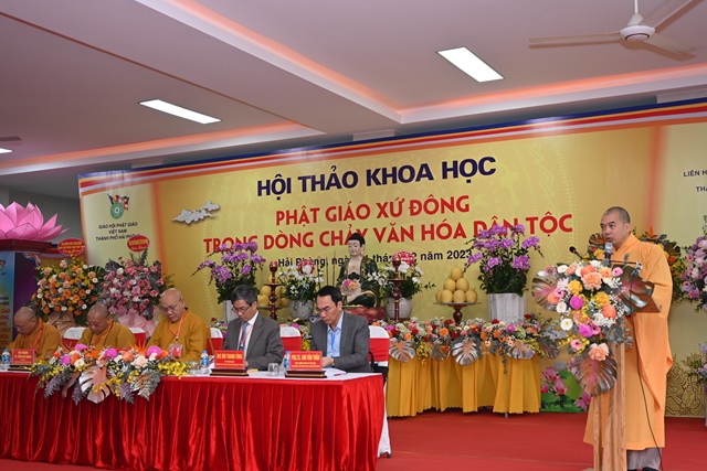 Tiếp đó, Hòa thượng Thích Thanh Giác đã lên phát biểu đề dẫn Hội thảo. Vào năm 2013, GHPGVN thành phố Hải Phòng đã phối hợp cùng Liên hiệp các hội khoa học& kỹ thuật thành phố và hội khoa học Lịch sử Hải Phòng tổ chức hội thảo “ Khai thác di sản văn hóa Phật giáo xứ Đông thúc đẩy phát triển bền vững du lịch vùng đồng bằng sông Hồng”. Cuộc hội thảo trên đã tập hợp được các báo cáo khoa học với nội dung nêu bật và làm sáng tỏ nhiều vấn đề thuộc di sản văn hóa Phật giáo xứ Đông,nội dung các tham luận đề cập đến việc bảo tồn và phát huy các giá trị để thúc đẩy phát triển du lịch bền vững vùng đồng bằng sông Hồng. Tuy nhiên, văn hóa Phật giáo là một phạm trù rộng lớn, bao quát trên nhiều lĩnh vực, văn hóa Phật giáo luôn gắn liền với tiến trình phát triển văn hóa dân tộc. Chính vì vậy, hội thảo khoa học lần này sẽ là cơ hội để tìm ra sự kết nối giữa nguồn tài nguyên văn hóa Phật giáo xứ Đông với dòng chảy văn hóa dân tộc. Đồng thời, làm sáng tỏ và lan tỏa hơn nữa các giá trị của nguồn tài nguyên vô cùng quí báu đó.