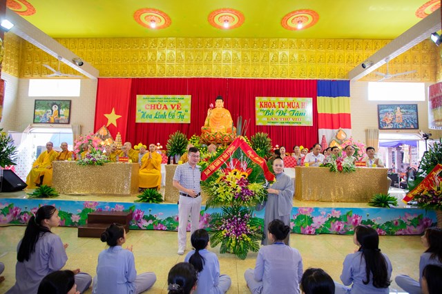 Nhân dịp này, Ni sư Thích Tâm Chính – Trưởng BTC khóa tu đã đón nhận những lẵng hoa chúc mừng của đại diện HĐTS TƯ GHPGVN. Đặc biệt, nhân dịp này Thượng tọa Thích Thanh Giác – Phó trưởng ban thường trực Ban Hoằng pháp TƯ GHPGVN đã trao tặng hoa và quà chúc mừng cho Ni sư Thích Tâm Chính – Trưởng BTC khóa tu mùa hè “ Bồ Đề Tâm” lần thứ VIII 10 triệu đồng.