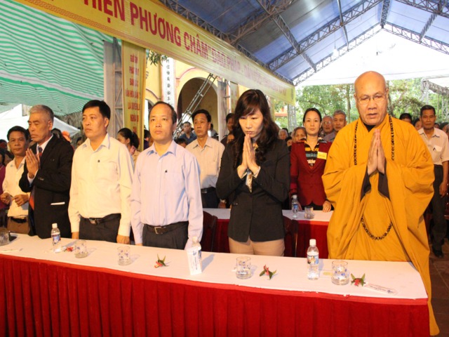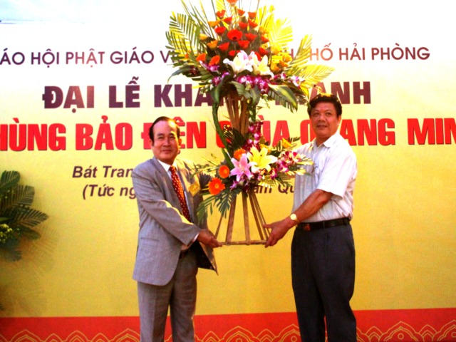 Ông Lê Văn Sức – Chủ tịch UBND xã Bát Trang thay mặt chính quyền địa phương phát biểu: Ngôi Bảo điện chùa Quang Minh được trùng tu tôn tạo là công trình văn hóa “Tác nhất thời lưu vạn đại”, Cùng với các công trình văn hóa tín ngưỡng của xã nhà hợp thành 1 quần thể văn hóa tín ngưỡng tâm linh cho muôn đời sau, lãnh đạo chính quyền địa phương mãi mãi ghi nhận công đức này, Trân trọng cảm ơn HĐTS GHPGVN, lãnh đạo các cấp chính quyền, các nhà hảo tâm các mạnh thường quân và nhân dân Phật tử đã quan tâm, giúp đỡ, công đức trong công tác trùng tu Ngôi Đại hùng Bảo điện được thập phần viên mãn, góp phần trong việc giữ gìn phát triển văn hóa của dân tộc, xây dựng quê nhà ngày càng giàu đẹp.