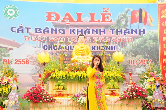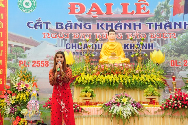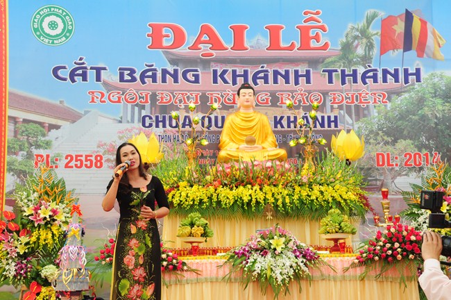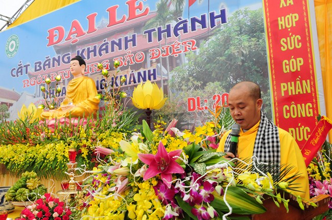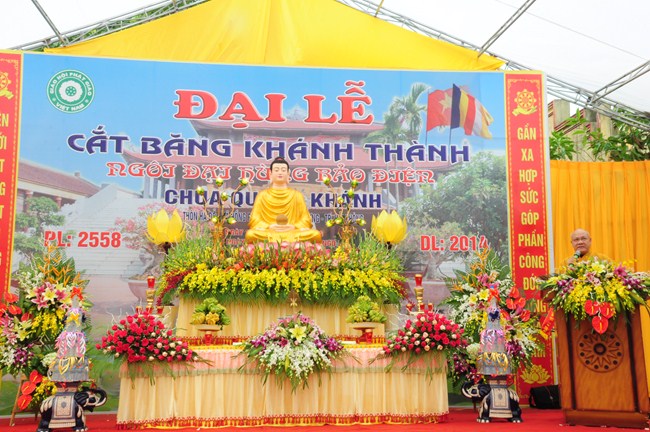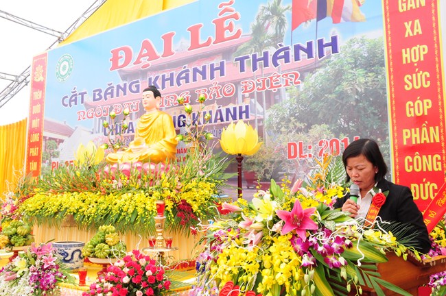Sau nghi thức niệm Phật cầu gia hộ, SC. Thích Diệu Thanh – Trụ trì chùa Quang Khánh đã lên đọc báo cáo sơ lược xây dựng ngôi Đại hùng bảo điện chùa Quang Khánh. Theo đó, chùa Quang Khánh là một ngôi  cổ tự có từ lâu đời, nơi đây luôn là chốn linh thiêng, là niềm tự hào của các thế hệ, của người dân địa phương trong những năm chống giặc ngoại xâm, qua biến cố thăng trầm của thời gian và lịch sử, chùa đã bị xuống cấp nghiêm trọng. Trước tình hình đó, được sự cho phép của GHPGVN Tp. Hải Phòng cũng như được sự cho phép của chính quyền địa phương, Chư tôn đức Tăng Ni GHPGVN Tp. Hải Phòng, Ni Sư Thích Tâm Kính và SC. Thích Diệu Thanh cùng toàn thể nhân dân, Phật tử địa phương đã làm lễ động thổ xây dựng ngôi Đại hùng bảo điện vào ngày 6 tháng 10 năm 2008 với tổng kinh phí xây dựng là 12 tỷ đồng, trong đó phật tử địa phương, thập phương và con em xa phương cúng dàng được 7 tỷ đồng còn thiếu 5 tỷ đồng. Qua hơn 6 năm thi công xây dựng, công trình đến nay đã được hoàn thành và chính thức tổ chức lễ khánh thành ngôi Đại hùng bảo điện trong niềm hoan hỷ của Phật tử và nhân dân địa phương.