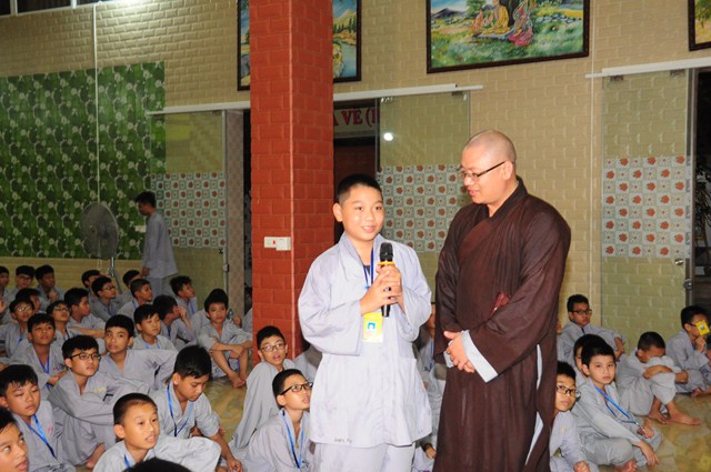 Buổi tối cùng ngày, các em đã được Đại đức Thích Tuệ Minh – Chủ nhiệm khóa tu hướng dẫn cách ngồi thiền, cách tụng kinh và thực hành tụng kinh Phúc Đức buổi đầu tiên. Có lẽ có rất nhiều em khóa sinh tham dự khóa tu còn rất bỡ ngỡ chưa biết thế nào là ngồi thiền, thế nào là tụng kinh, nhưng sau khi được Đại đức Thích Tuệ Minh giải thích, các em đã hiểu ra được phần nào lợi ích cũng như mục đích của việc tụng kinh và tọa thiền. Các em đã tiếp nhận những thông tin này một cách nhanh chóng và thực hành ngay bài học đầu tiên của khóa tu mùa hè Bồ Đề Tâm lần thứ 6.