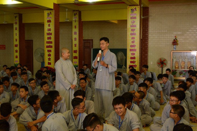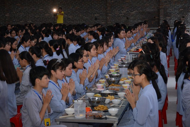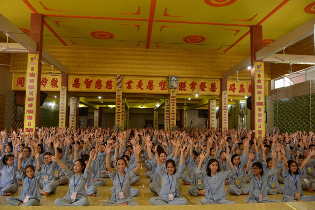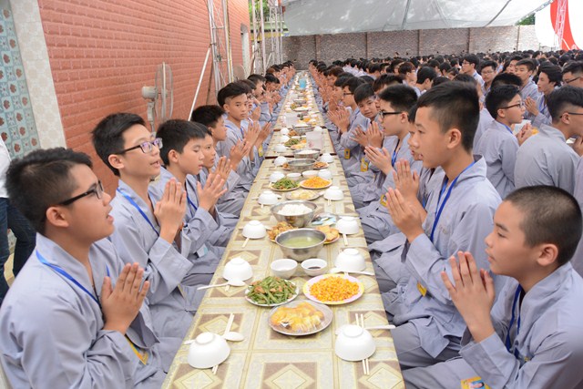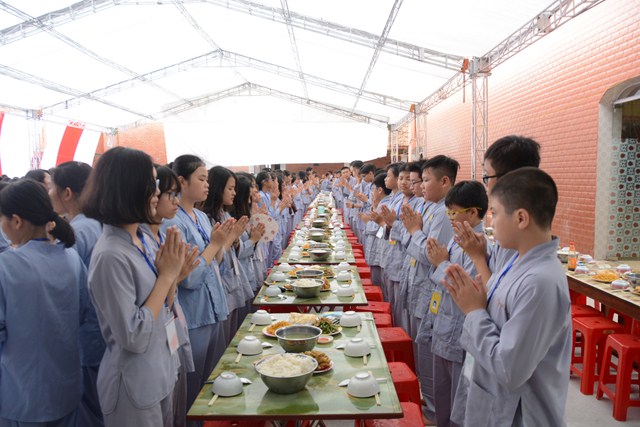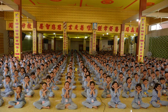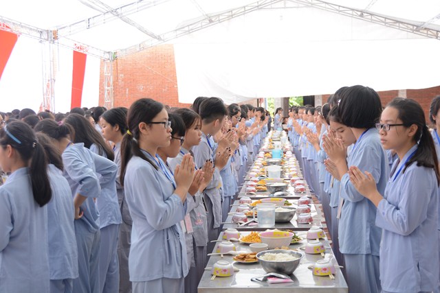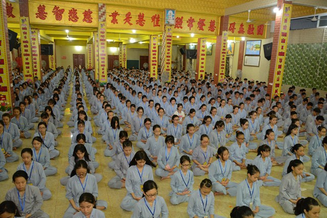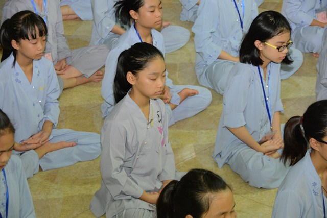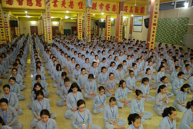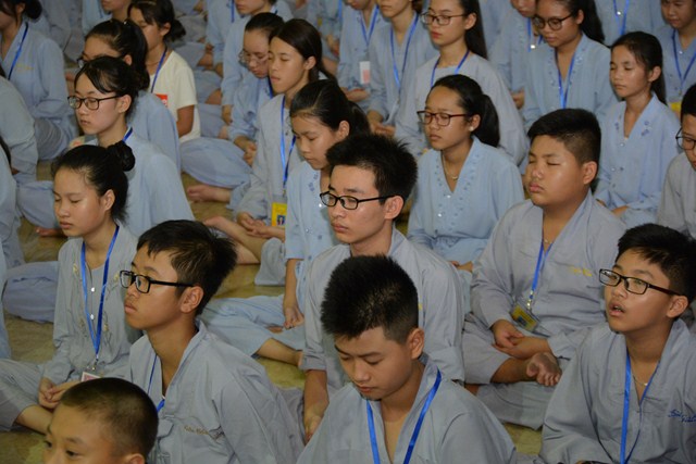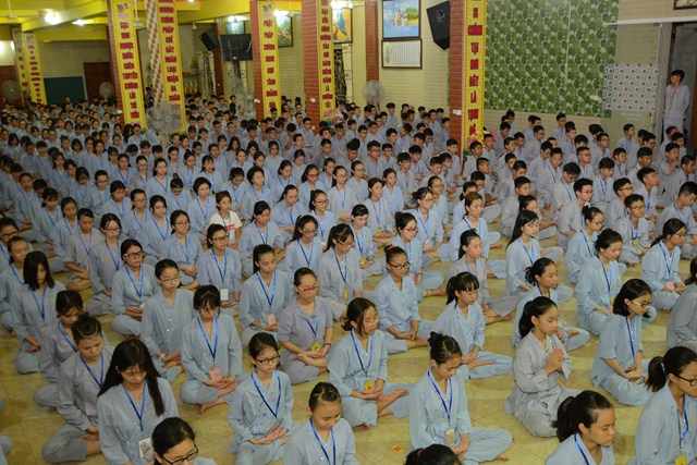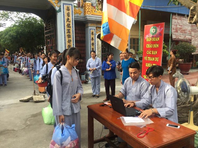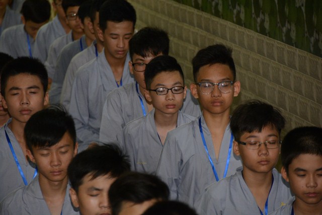 Hôm nay là ngày nhập tu đầu tiên của các em, các em có mặt từ rất sớm để nhận thẻ, nhận phòng, nhận chúng để tham dự khóa tu, sau hơn 1 giờ đồng hồ hầu hết tất cả các em đã đăng ký tham dự khóa tu đều có mặt tại chùa. Sau đó, các em đã vân tập về giảng đường của chùa để nghe quý sư thầy, sư cô phổ biến nội quy tu học, học các oai nghi khi tới chùa, học cách lễ Phật, lạy Phật…và học bài hát chính thức của khóa tu mang tên: “ Về Đây Bên Nhau” chuẩn bị cho buổi lễ khai mạc vào sáng ngày 27/6/2017 (4/6/Đinh Dậu).