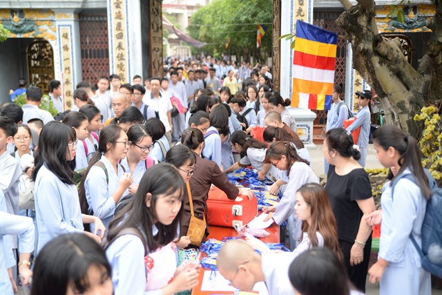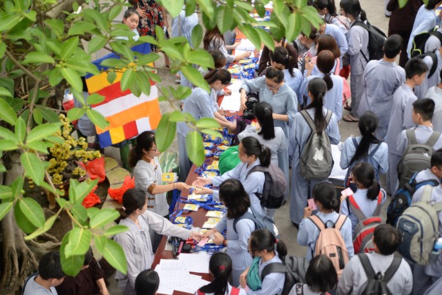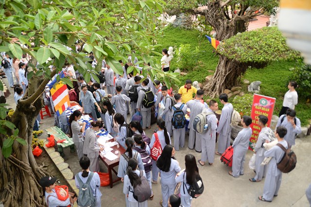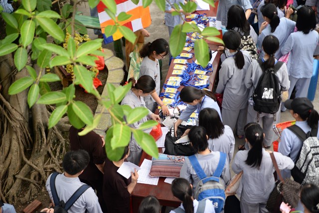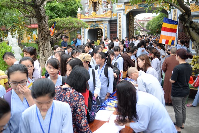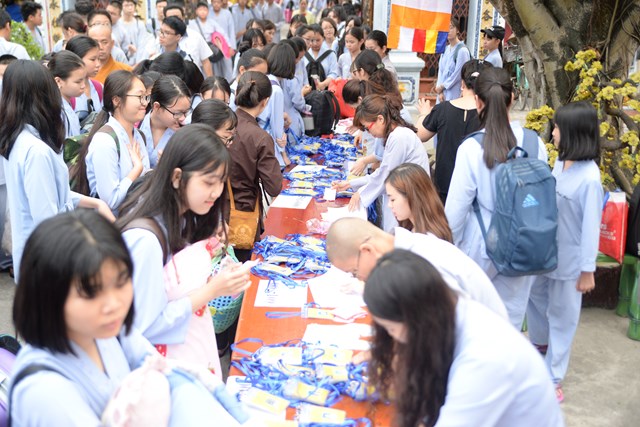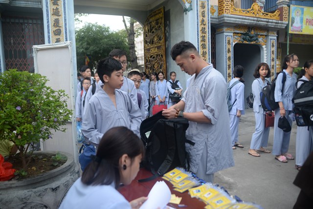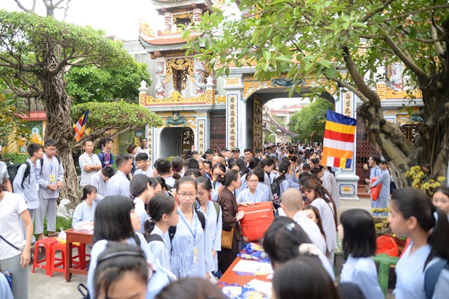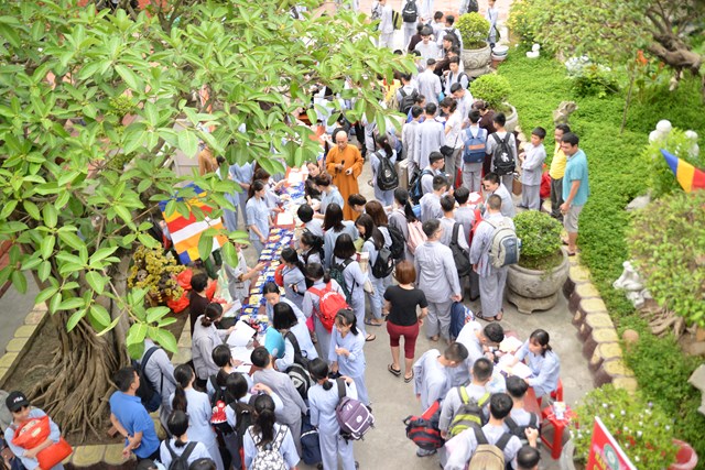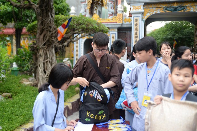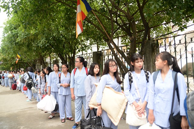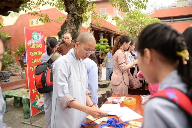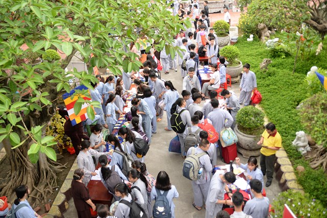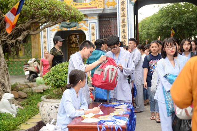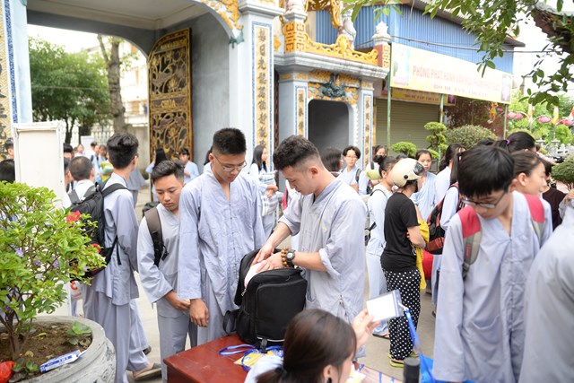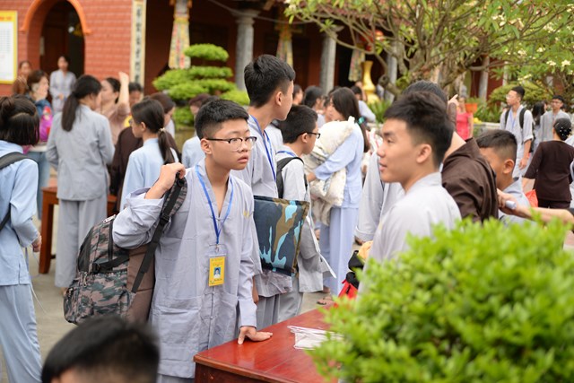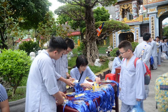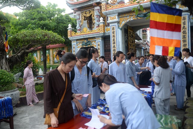 Ngay từ 5h30 sáng các khóa sinh đã bắt đầu vân tập về chùa Vẽ để nhận thẻ, nhận phòng và nhận chúng, đến khoảng 7h30 phút các bạn khóa sinh đã có mặt đông đủ tại khu giảng đường chùa Vẽ. Năm nay, Ni sư Thích Tâm Chính – Trưởng BTS GHPGVN quận Hải An, trụ trì chùa Vẽ đã đầu tư trang thiết bị, cơ sở vật chất rất đầy đủ nhằm đáp ứng nhu cầu sinh hoạt, tu học của hơn 800 em khóa sinh với số lượng khóa sinh về tham dự đông nhất từ trước tới nay.